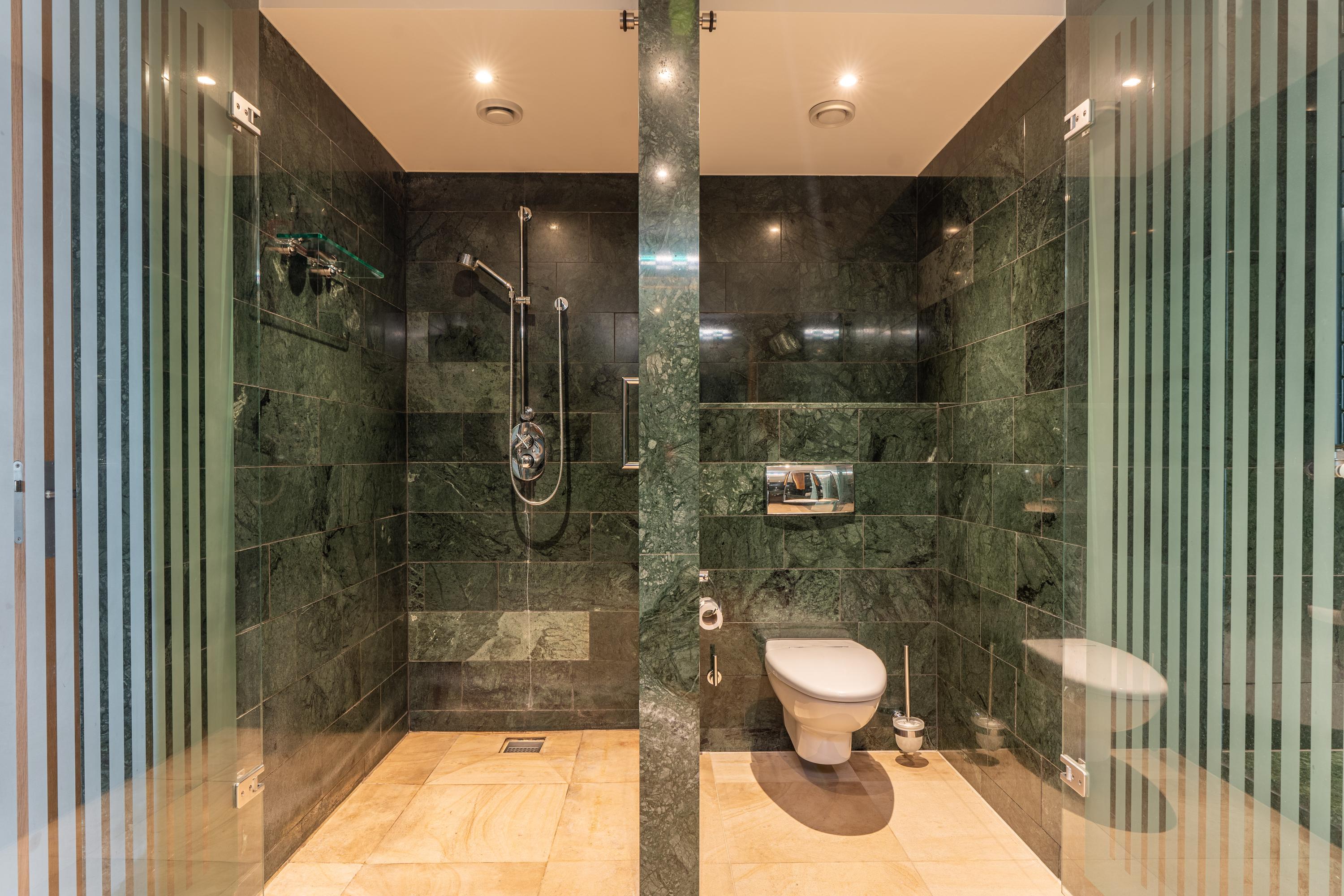 The primary bedroom, located in the northwest corner, includes spacious built-in wardrobes, air conditioning, built-in speakers, and an en-suite bathroom. The bathroom features exquisite green marble, a double vanity unit, a bathtub with a showerhead, a toilet, and a walk-in shower.