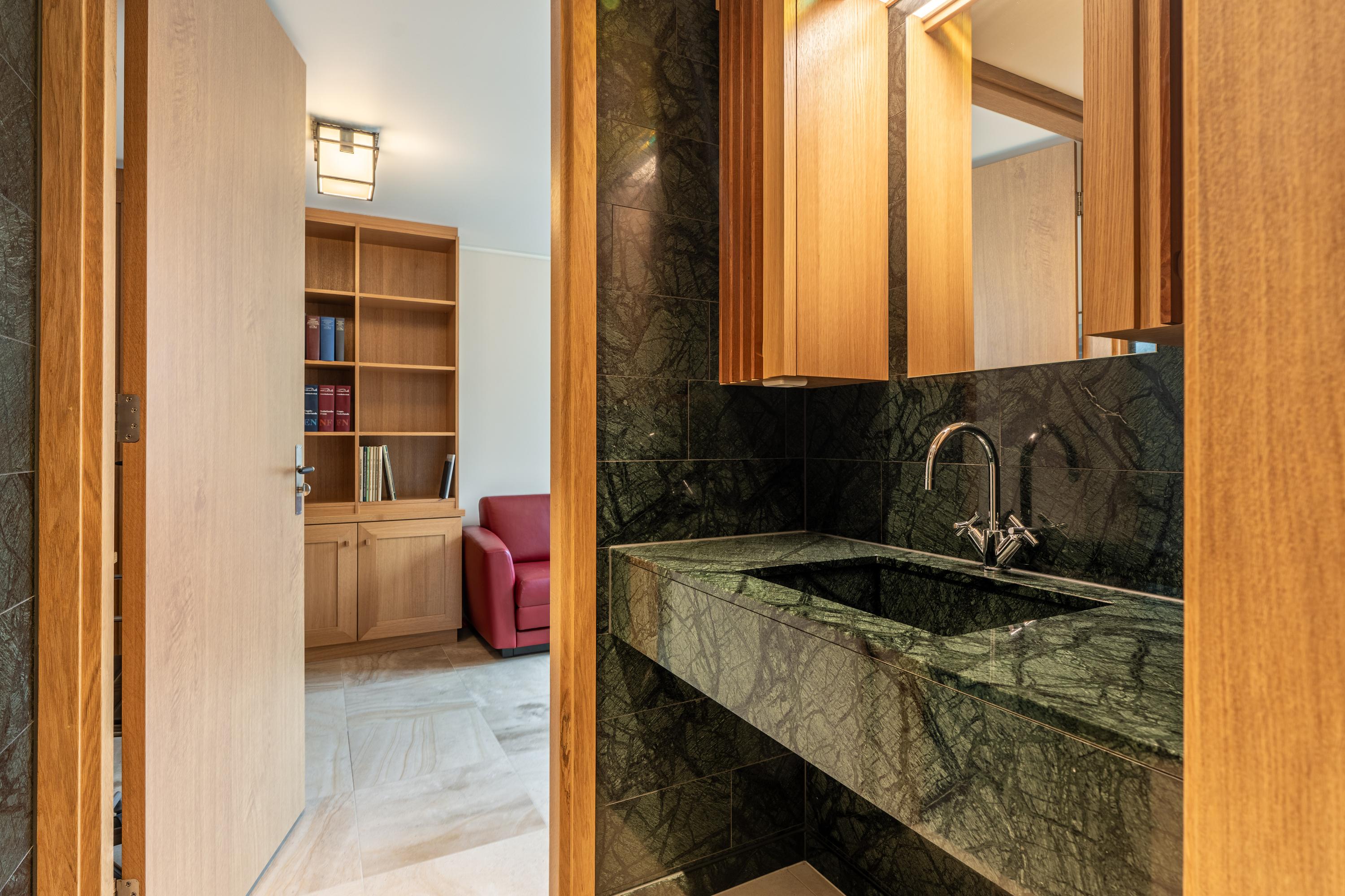 Next to the dining area is the expansive living room with a gas fireplace and built-in cabinetry. The TV can be concealed behind a wooden sliding panel, creating the perfect ambiance for cozy evenings by the fire. Adjacent to the living area is a comfortable workspace with ample storage.