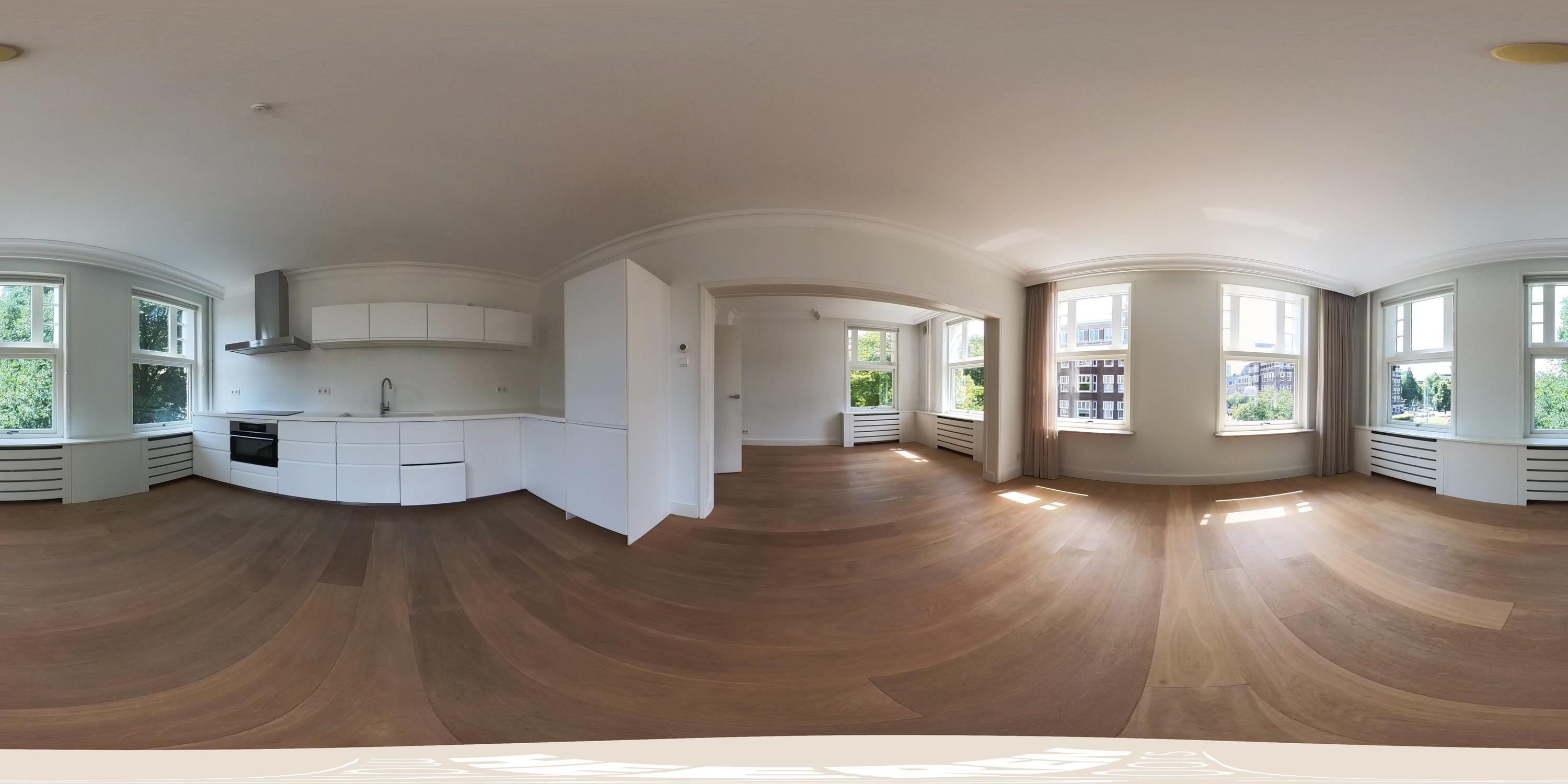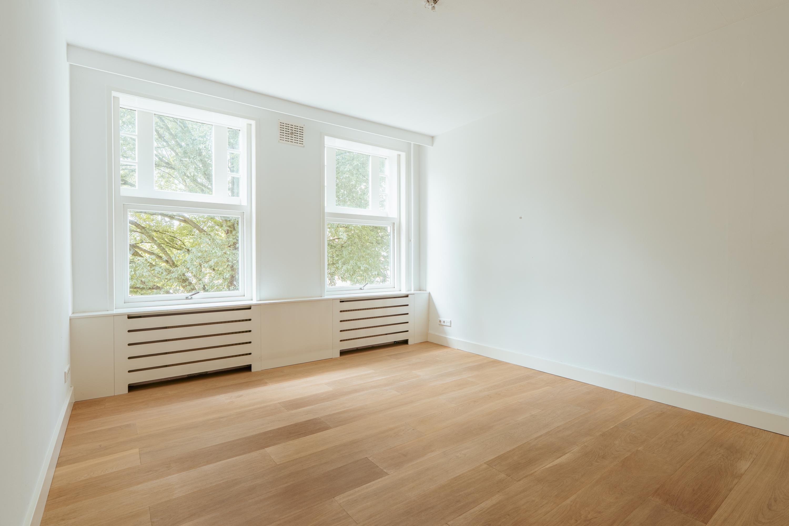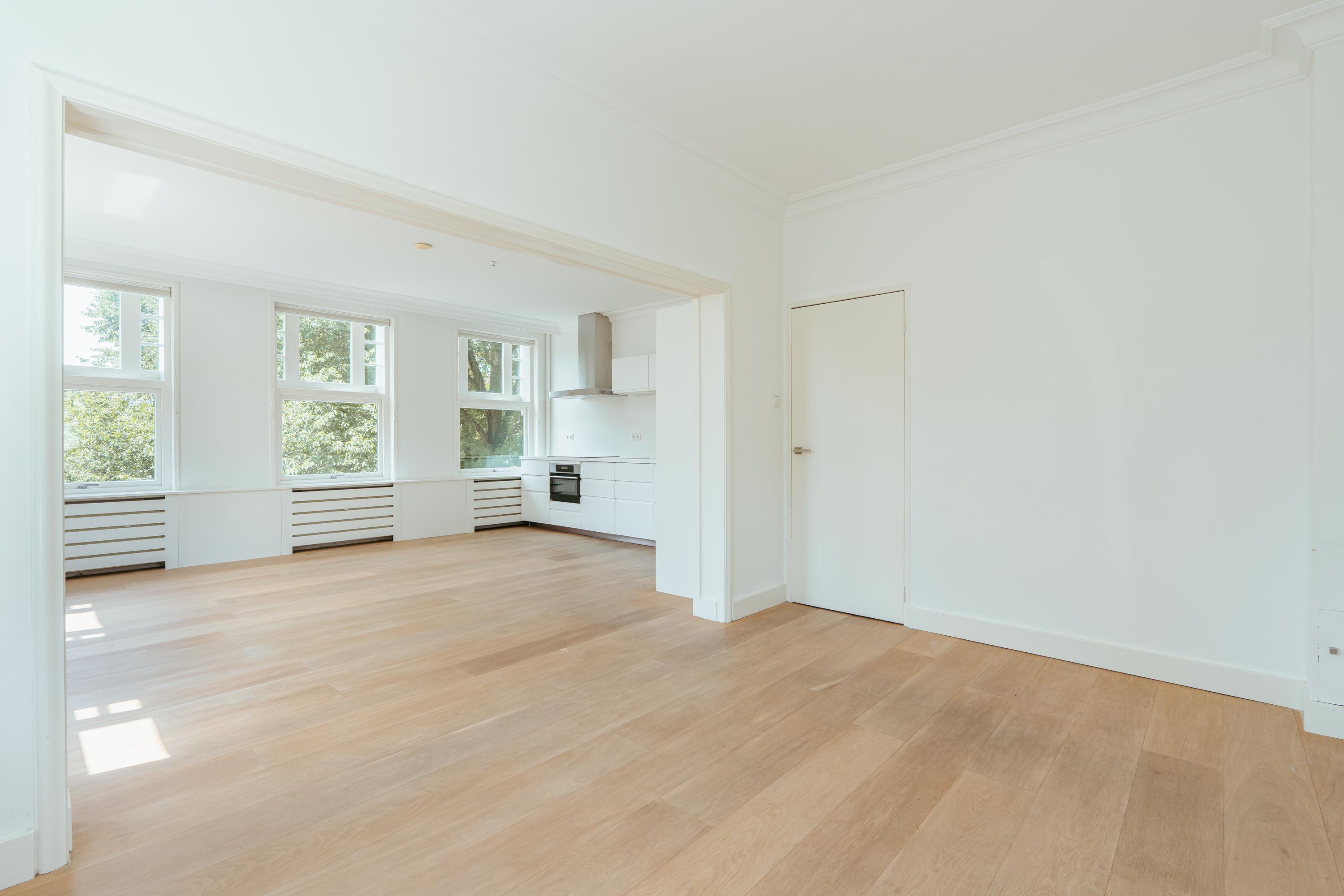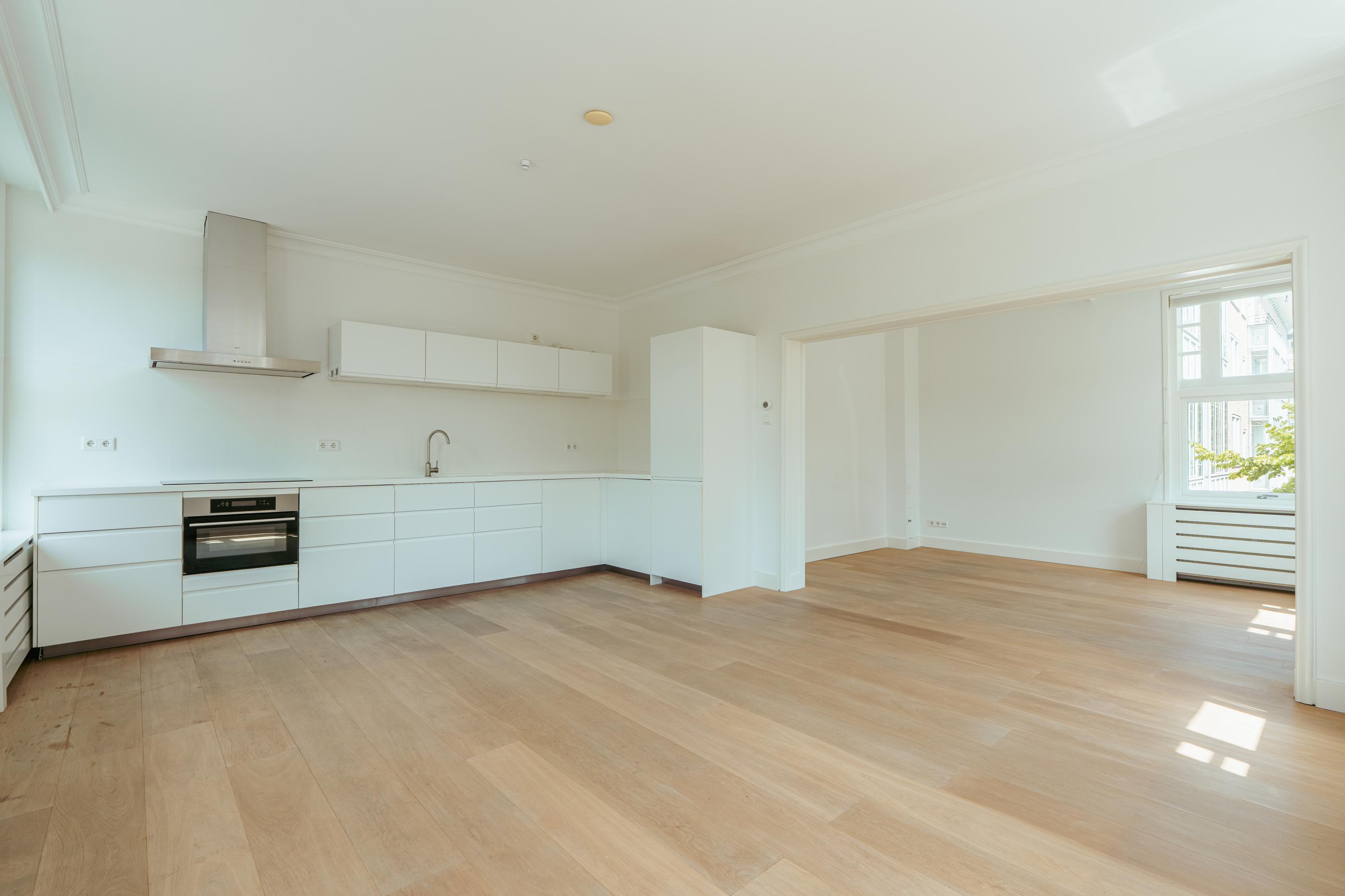 Entrance to the apartment through a spacious hallway providing access to all rooms. At the front is the living and dining area, offering beautiful views over the green and stately Minervaplein. The bright through-living room is surrounded by windows on three sides, flooding the space with natural light and enhancing the sense of openness. The open-plan kitchen is fitted with modern built-in appliances, including an induction cooktop, combination oven, dishwasher, fridge, and freezer.
