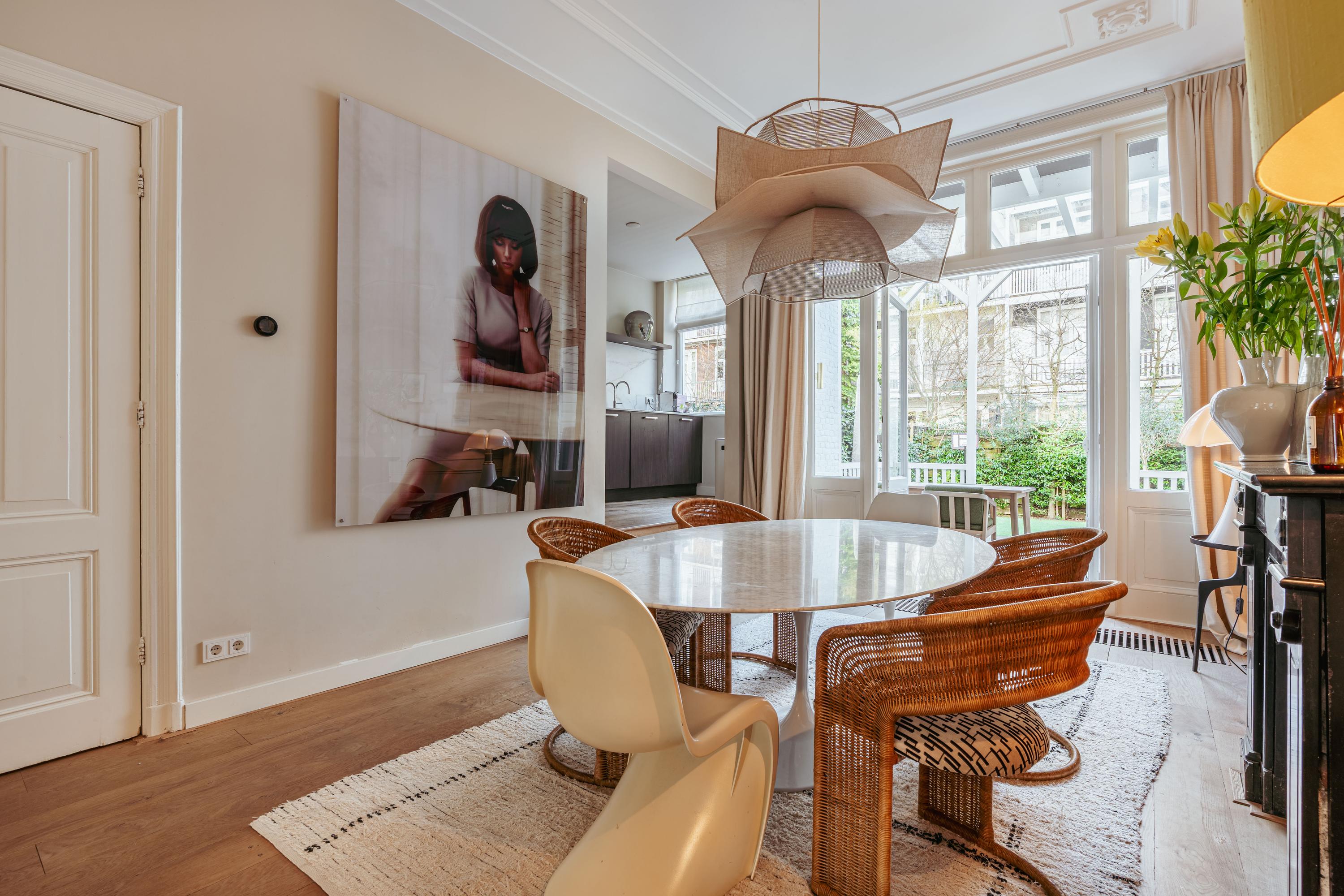 A charming double ground-floor apartment of 124 m² with a spacious garden and distinctive character details. This beautiful home combines authentic charm with modern living comfort. Think of stained glass windows, ornate ceiling decorations, fireplaces, and paneling, perfectly balanced with a contemporary finish. With a generous and bright en-suite living area, open kitchen, four bedrooms, two balconies, and an exceptionally large sunny backyard with a covered terrace, this property offers everything for comfortable and atmospheric living. Situated on freehold land and featuring a practical layout, this is a unique and complete family home.