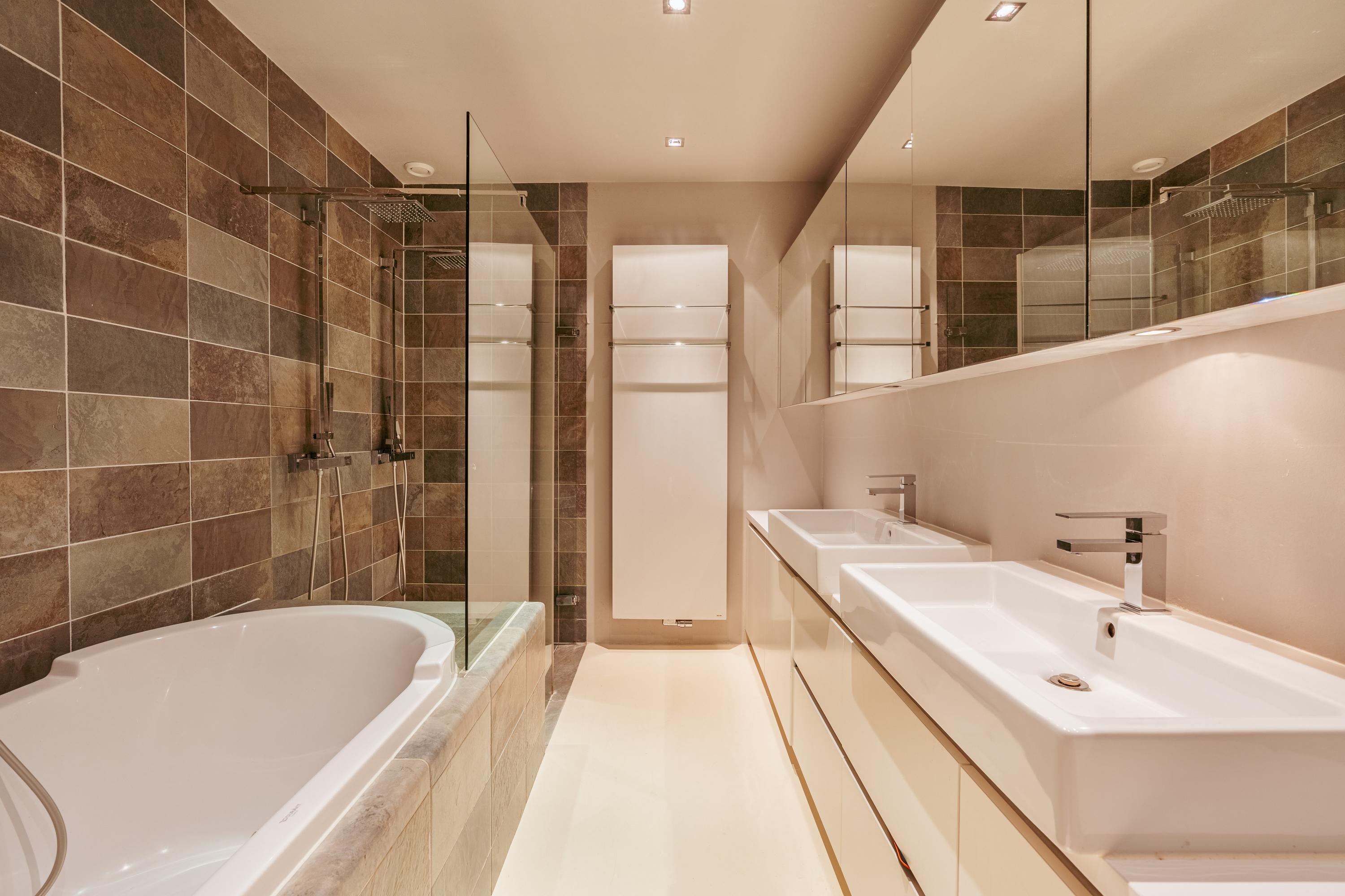 The bathroom is spacious and luxuriously finished, featuring a bathtub, a double walk-in shower, and a double washbasin with vanity unit.