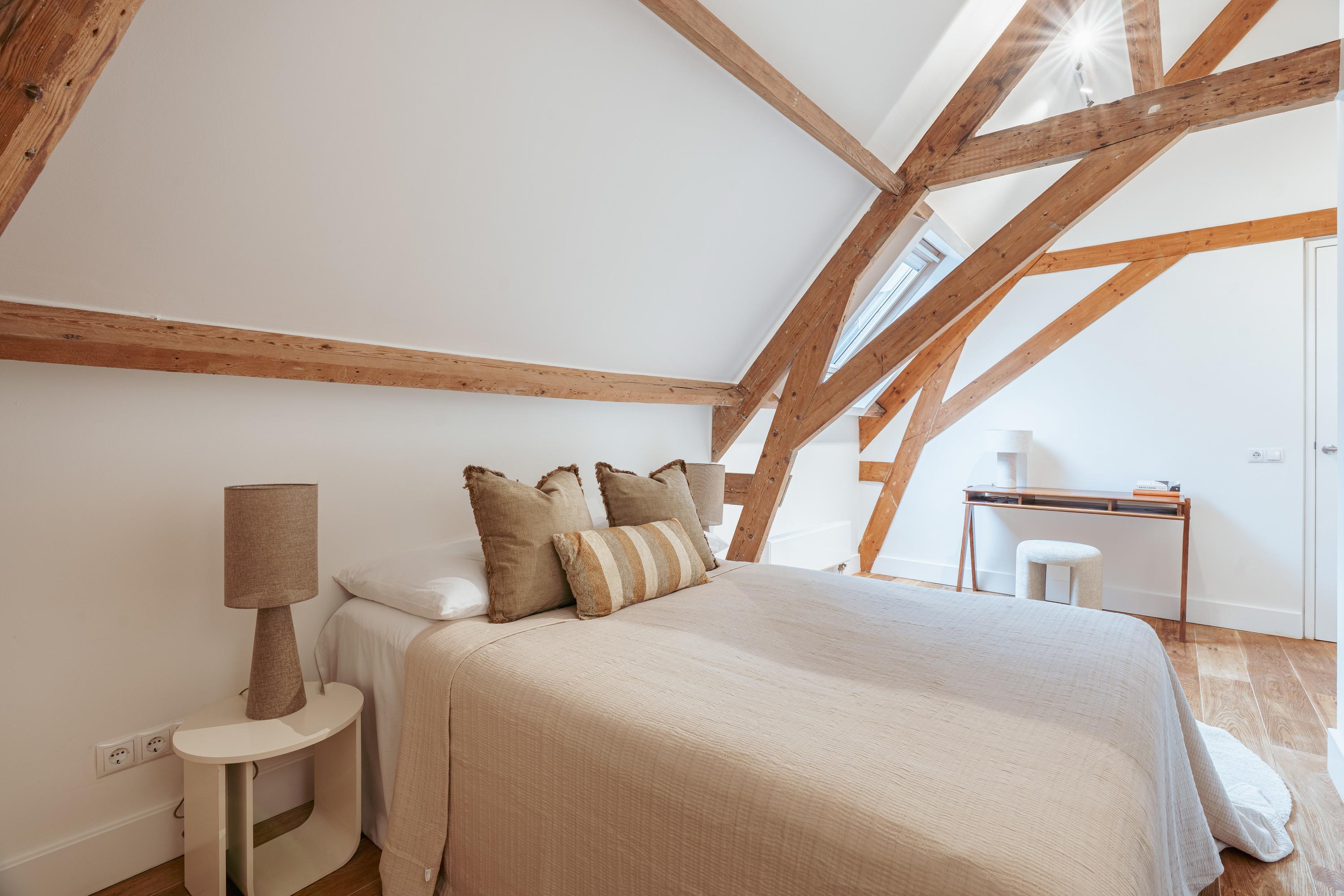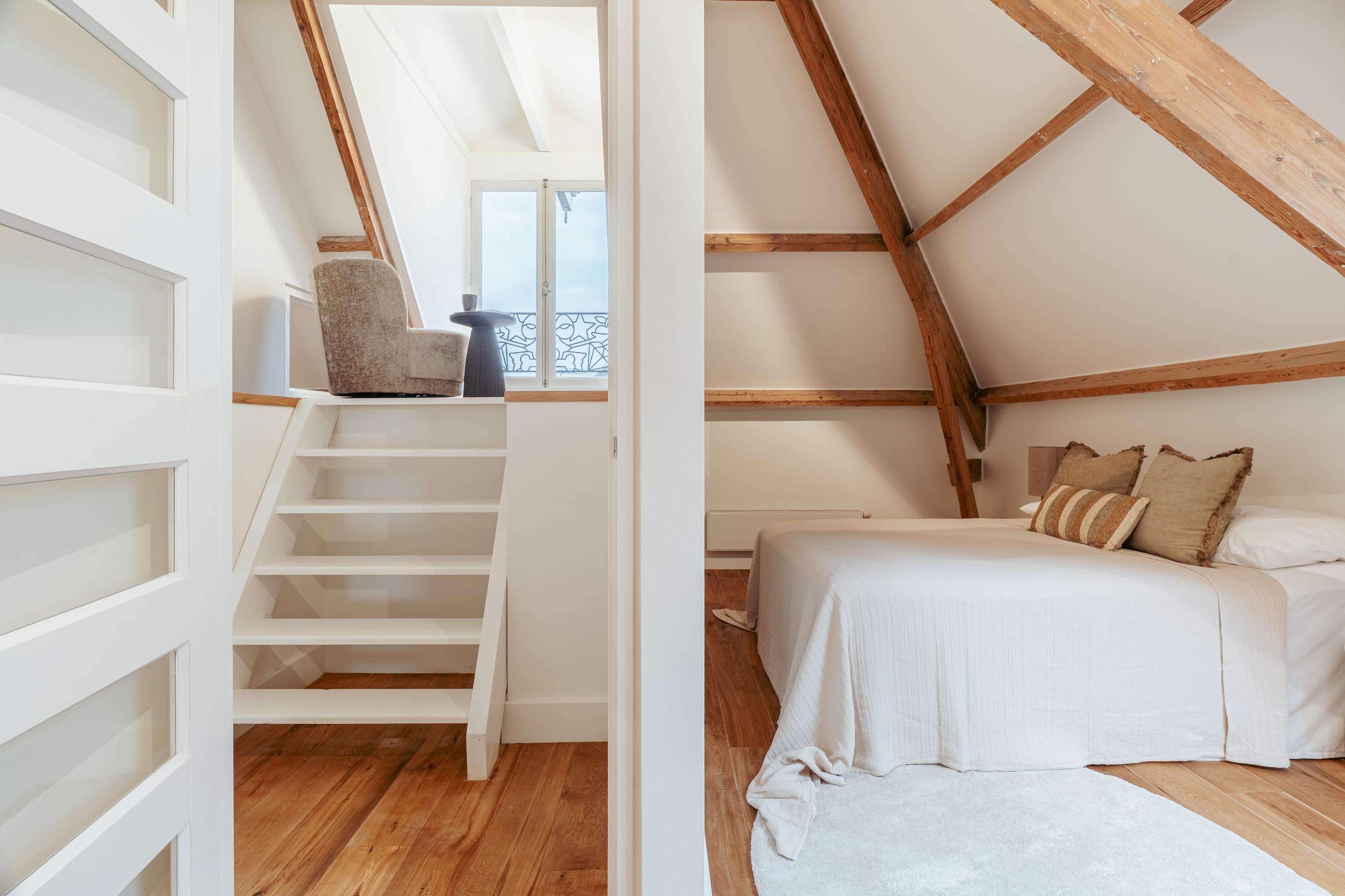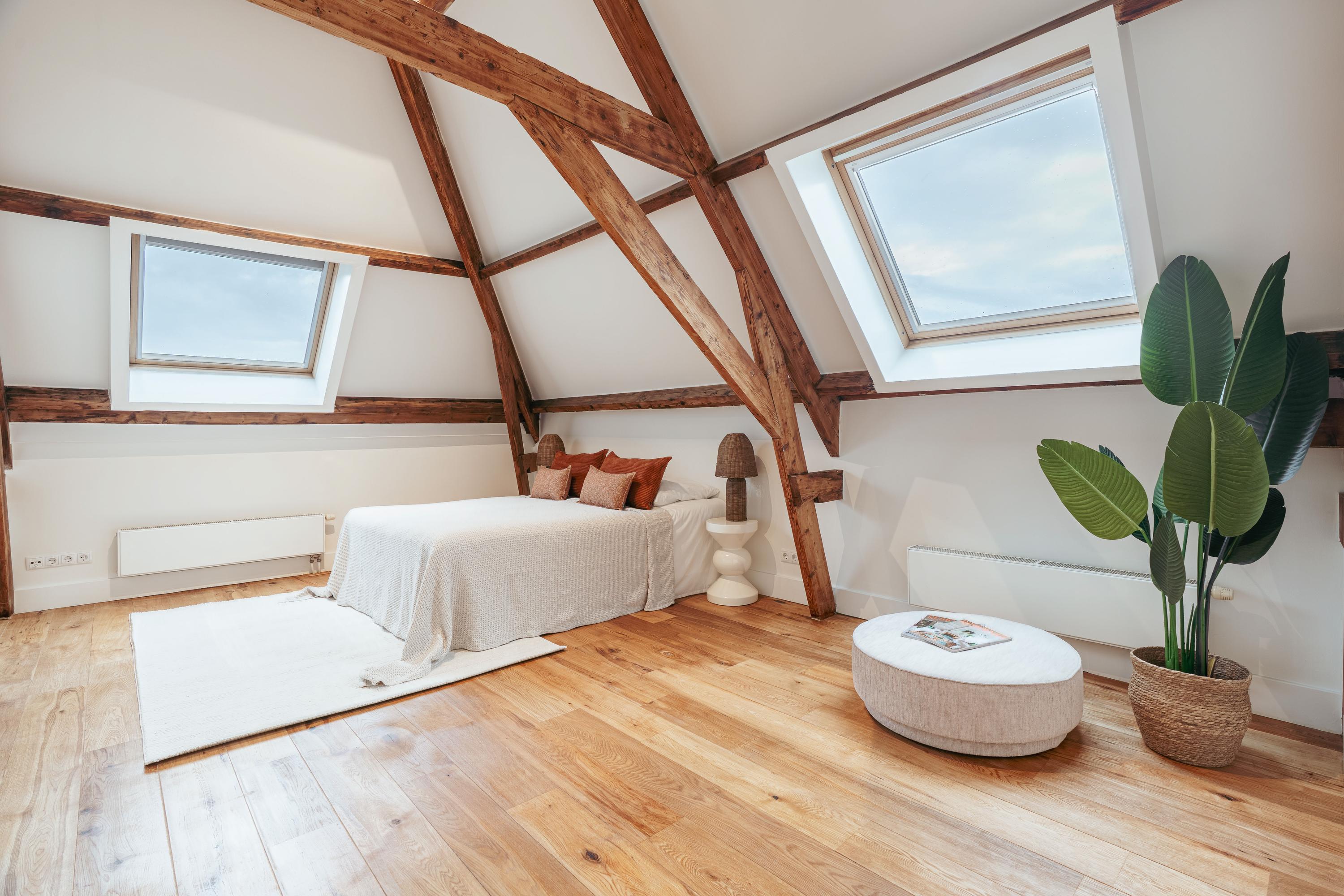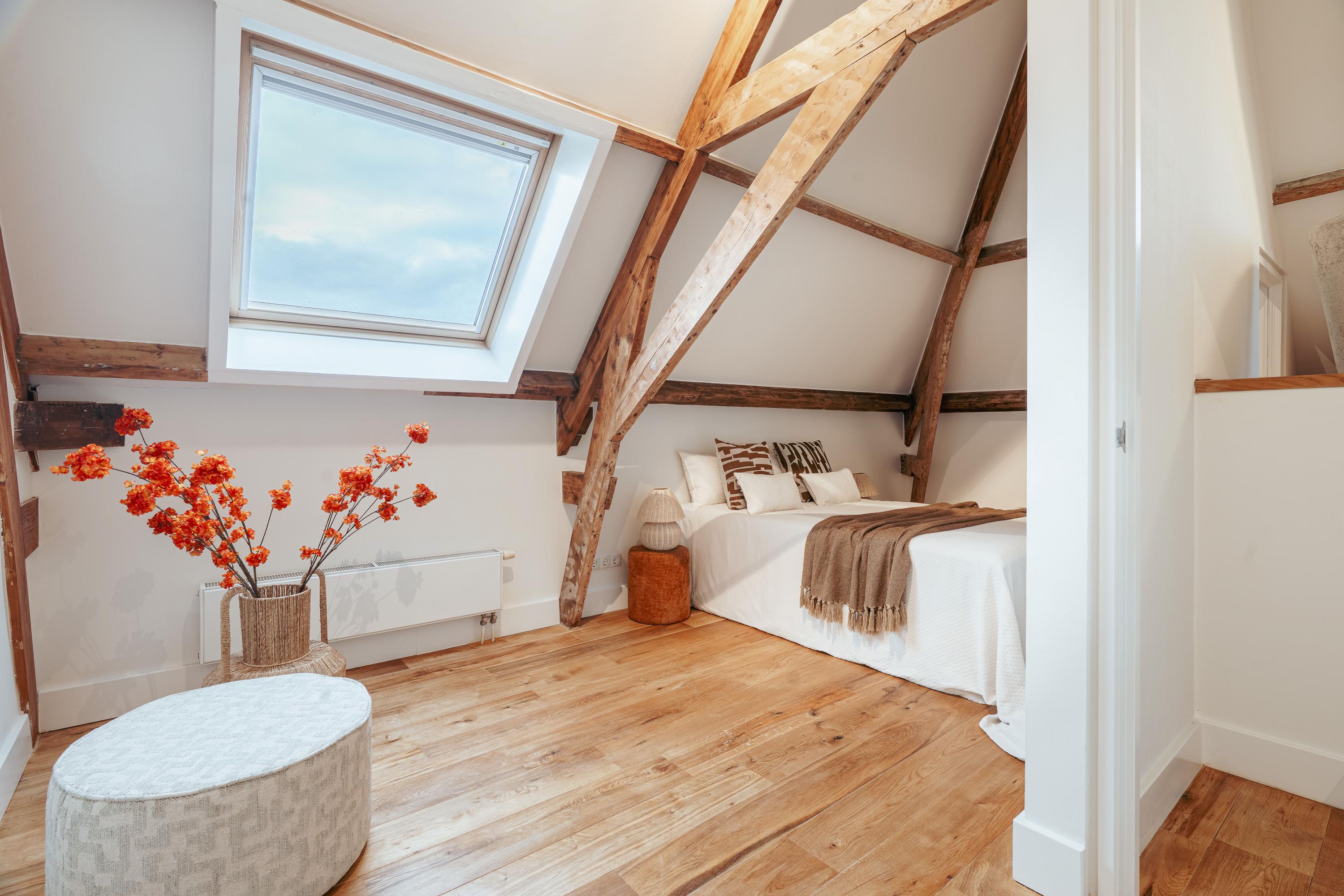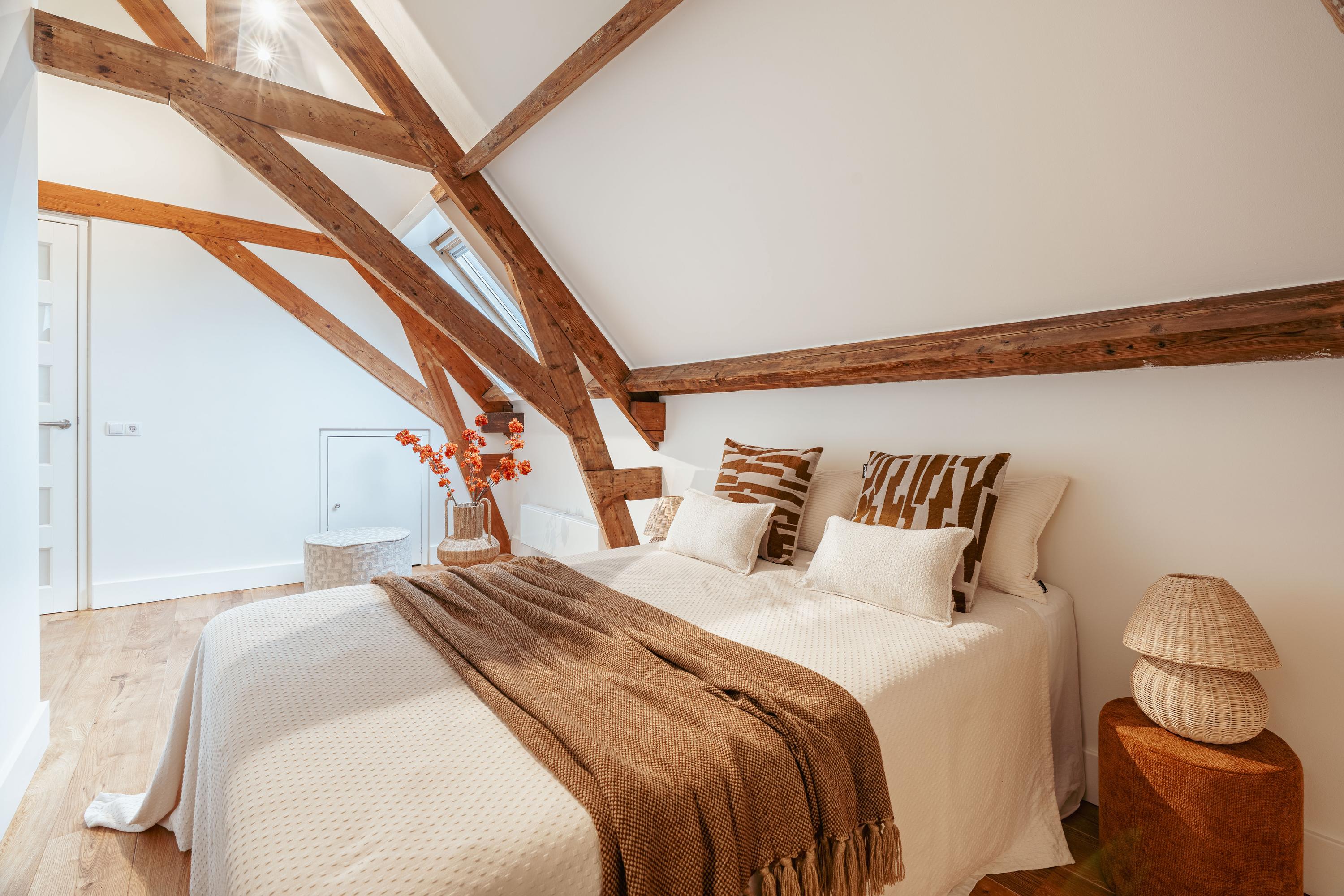 Upstairs, the bedrooms provide privacy and versatility. The master suite includes an en-suite bathroom with a bathtub and shower, while a second bathroom is accessible from the landing. Playful mezzanines between rooms create intimate corners for reading or reflection, and integrated storage solutions maximize efficiency. All rooms feature exposed beams and classic finishes.