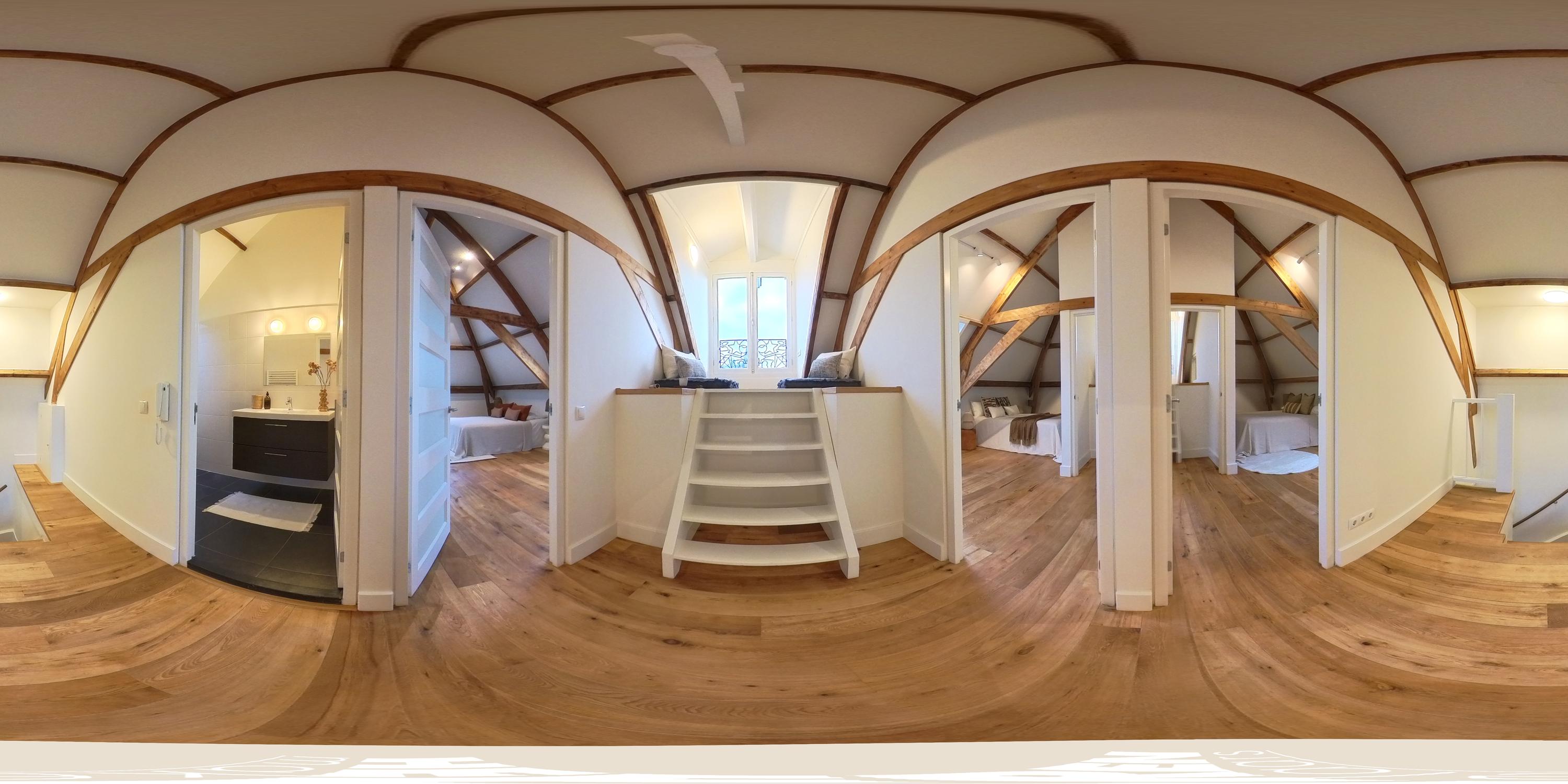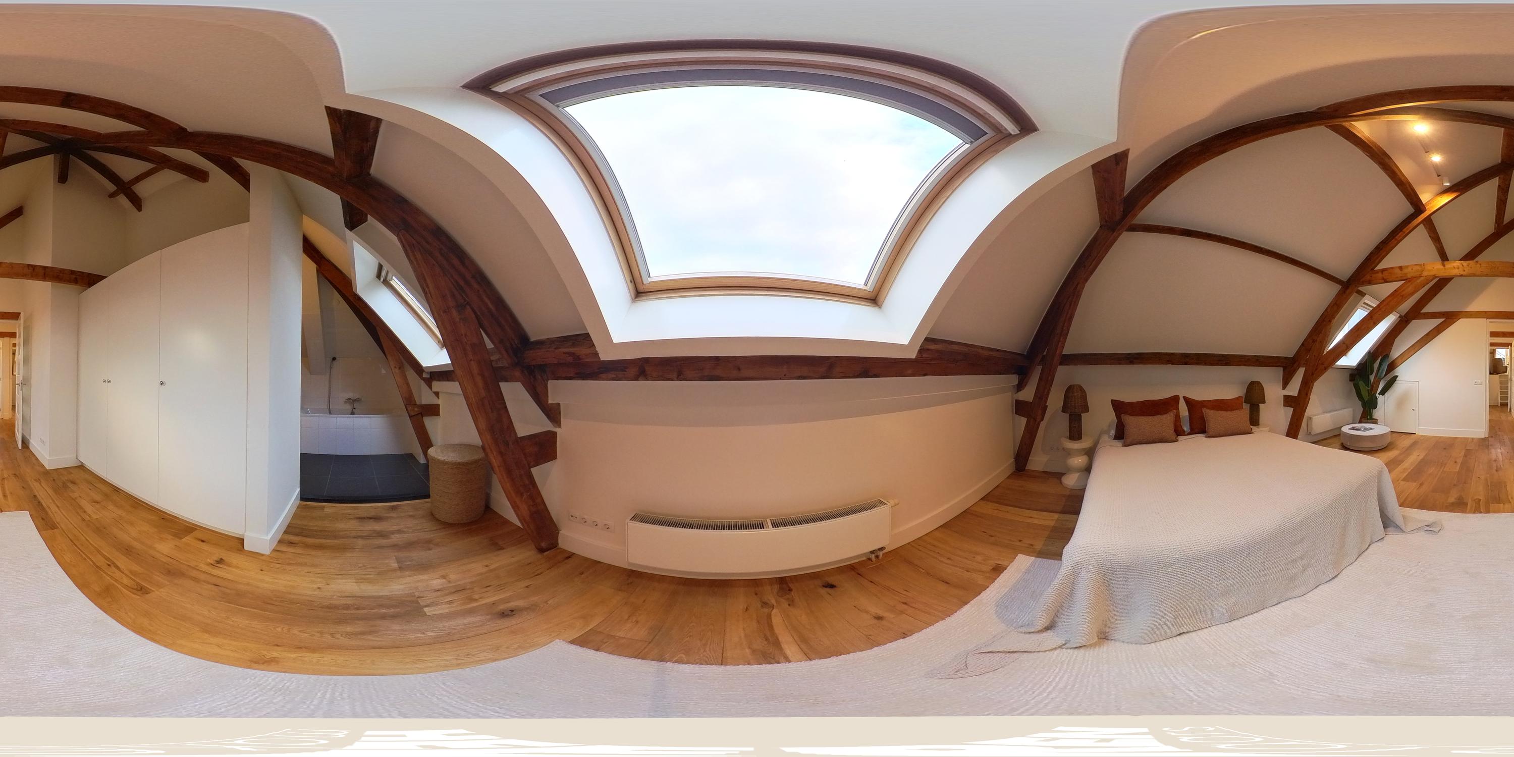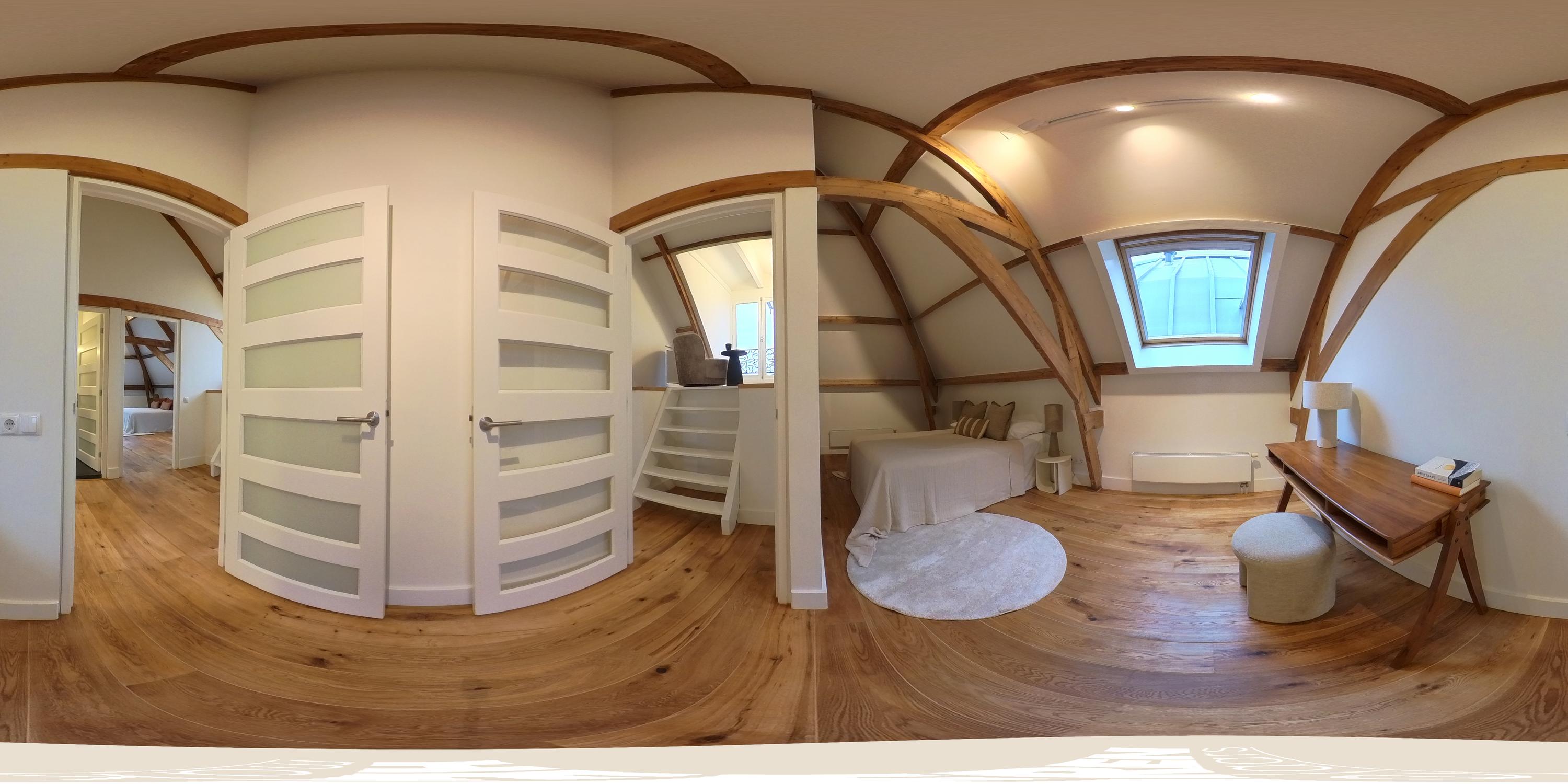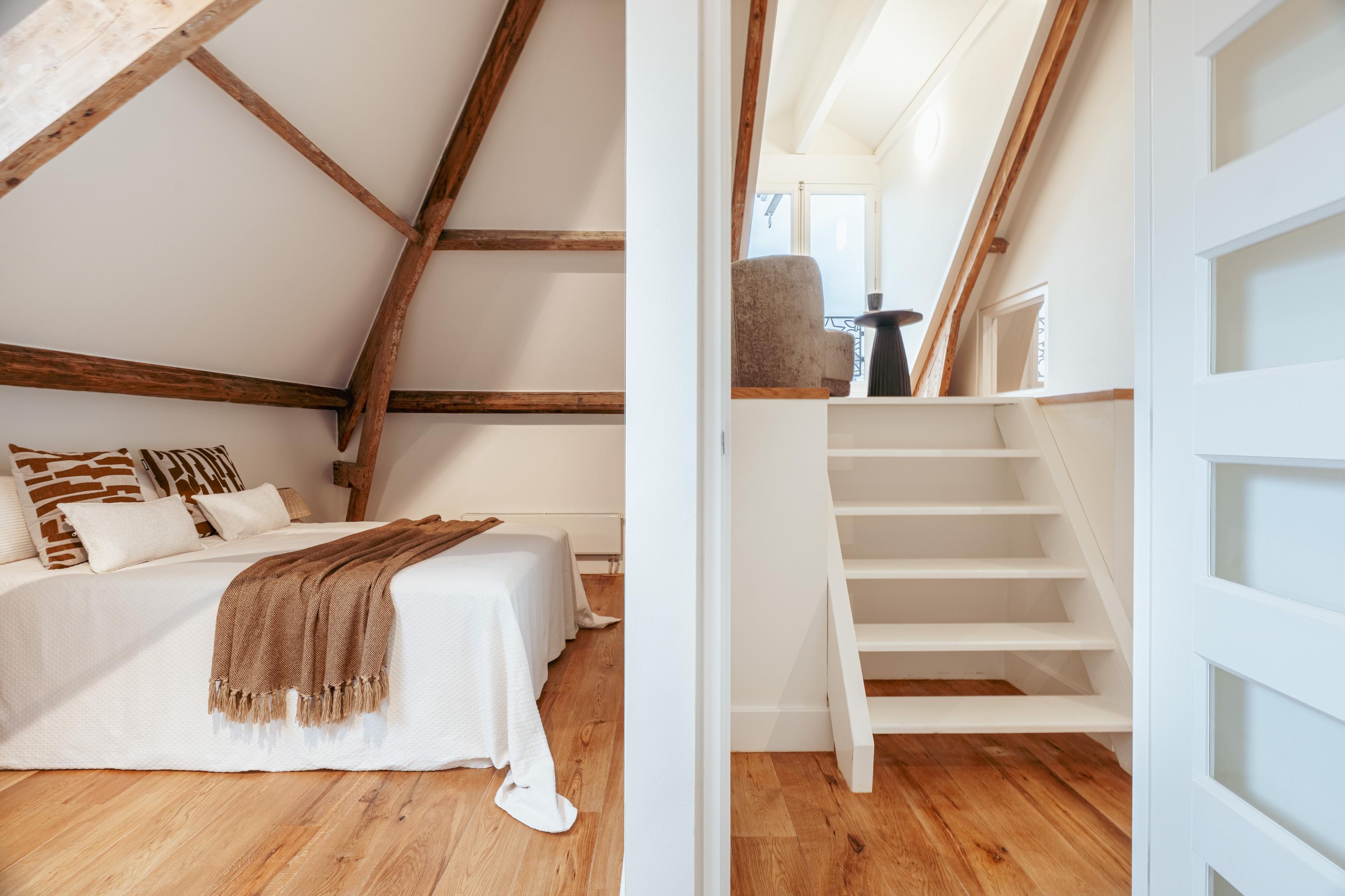 Upstairs, the bedrooms provide privacy and versatility. The master suite includes an en-suite bathroom with a bathtub and shower, while a second bathroom is accessible from the landing. Playful mezzanines between rooms create intimate corners for reading or reflection, and integrated storage solutions maximize efficiency. All rooms feature exposed beams and classic finishes.