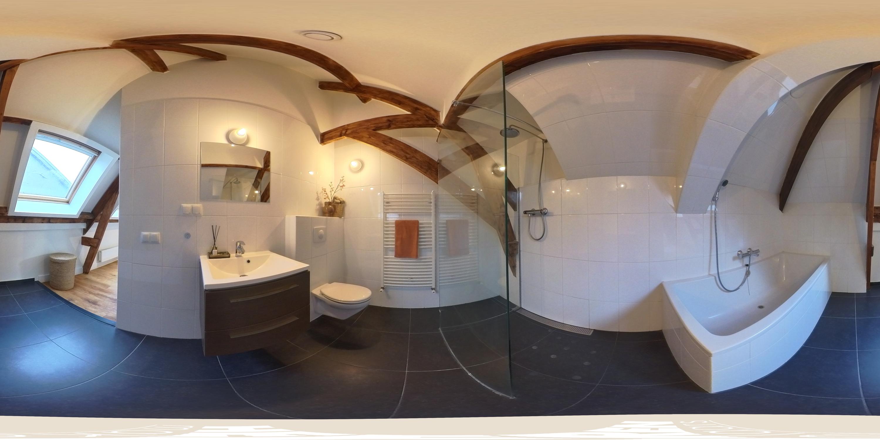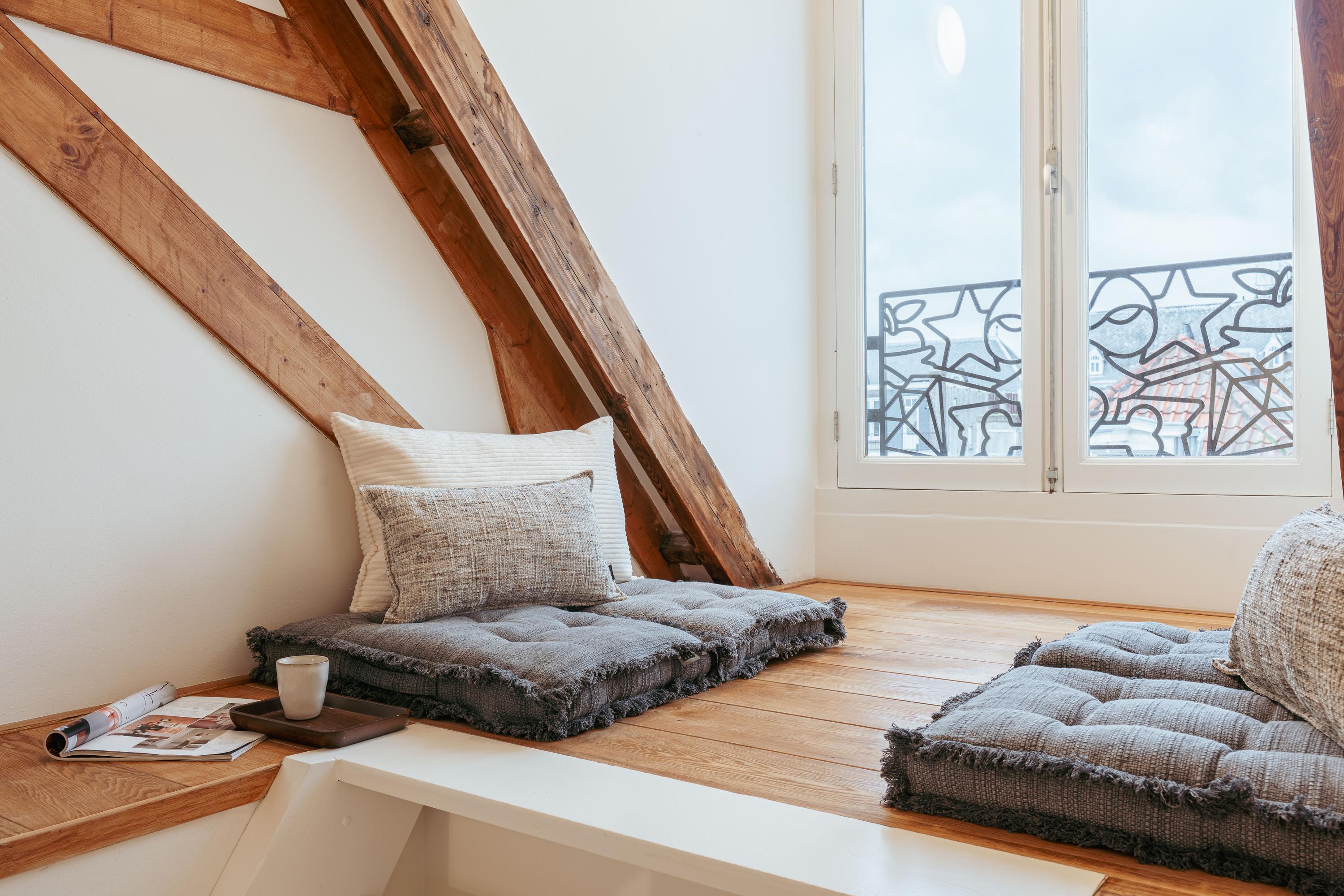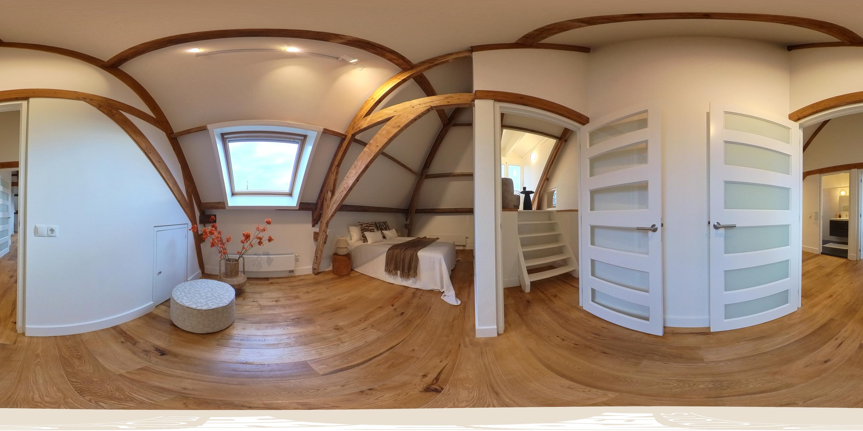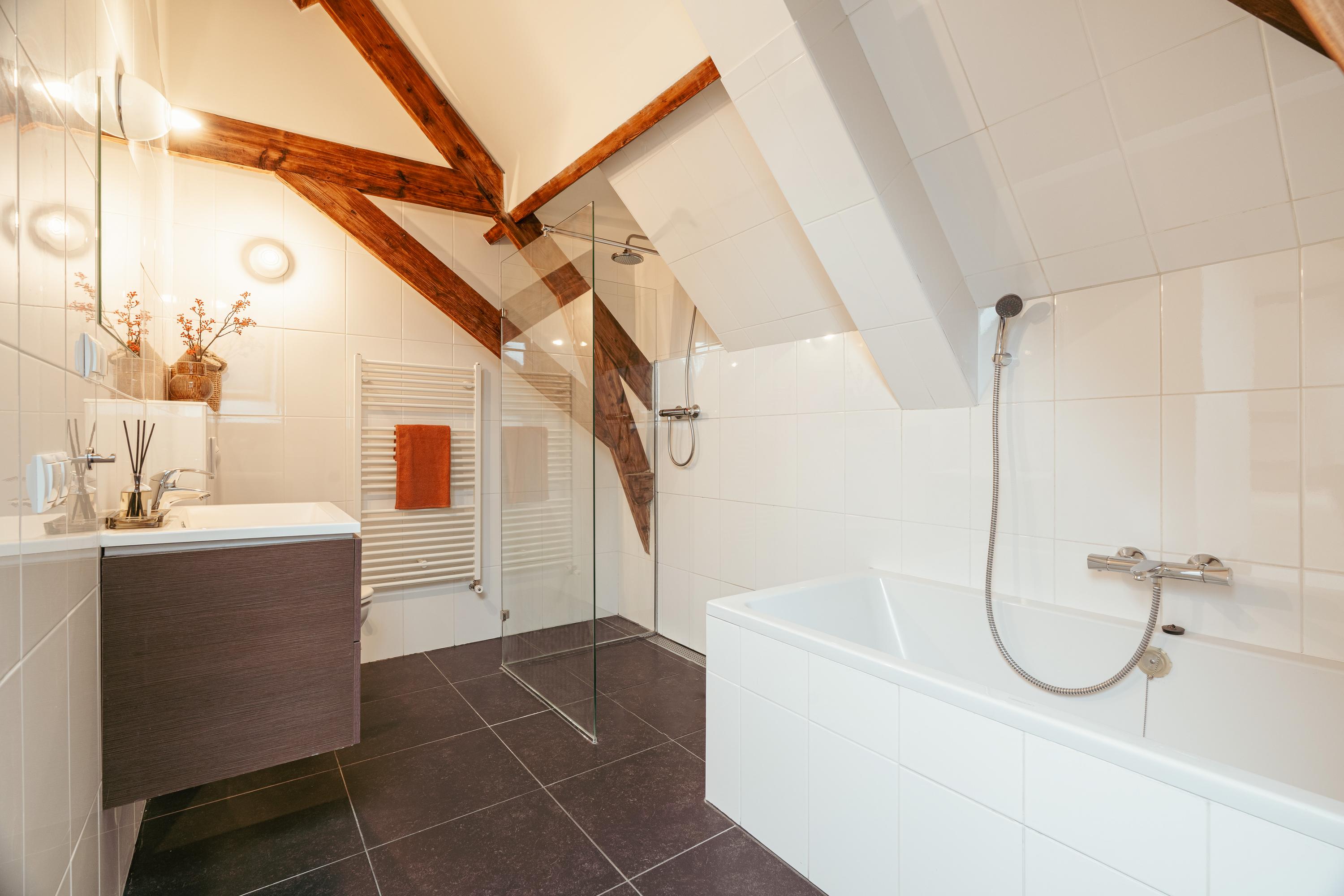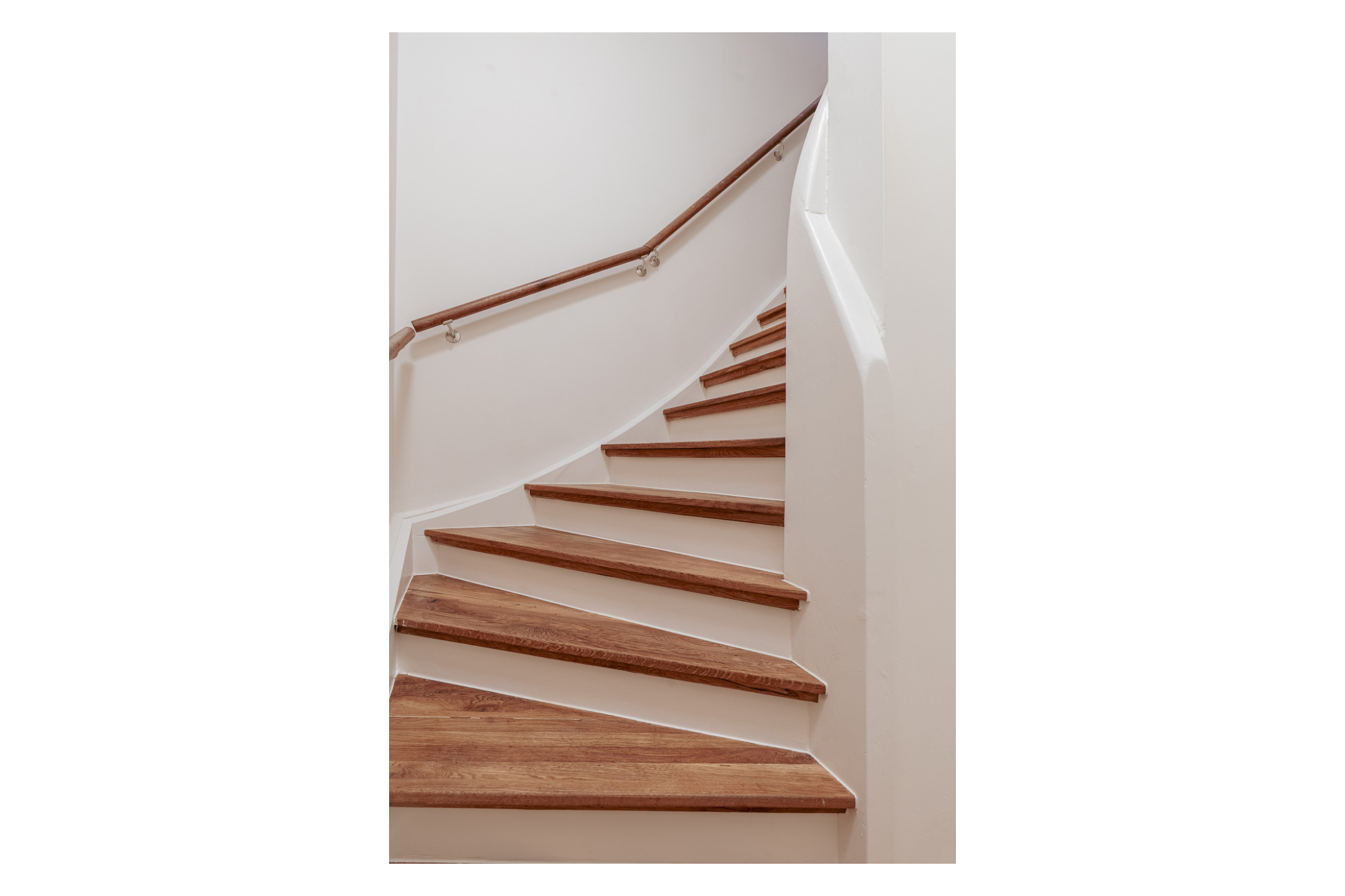 Upstairs, the bedrooms provide privacy and versatility. The master suite includes an en-suite bathroom with a bathtub and shower, while a second bathroom is accessible from the landing. Playful mezzanines between rooms create intimate corners for reading or reflection, and integrated storage solutions maximize efficiency. All rooms feature exposed beams and classic finishes.