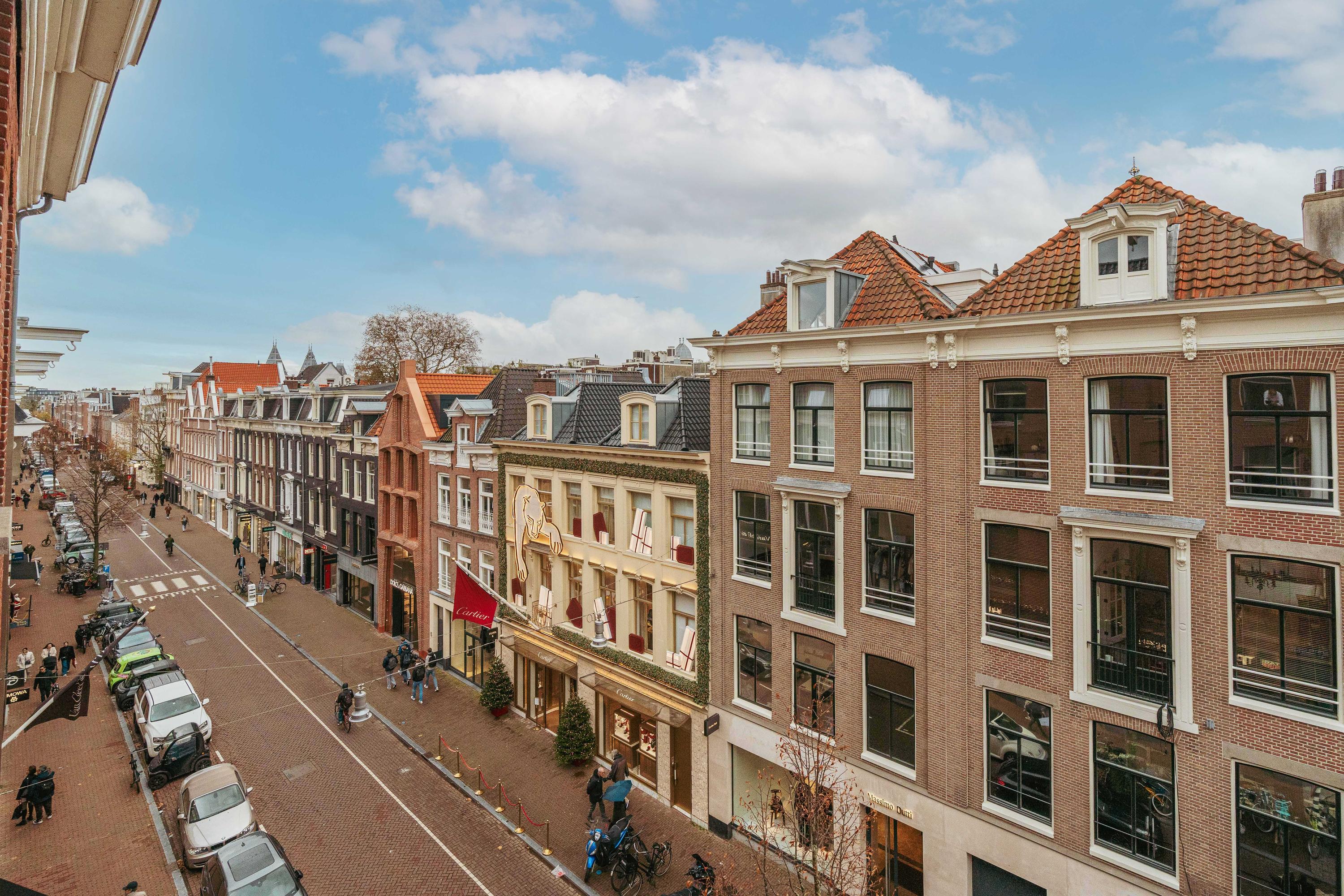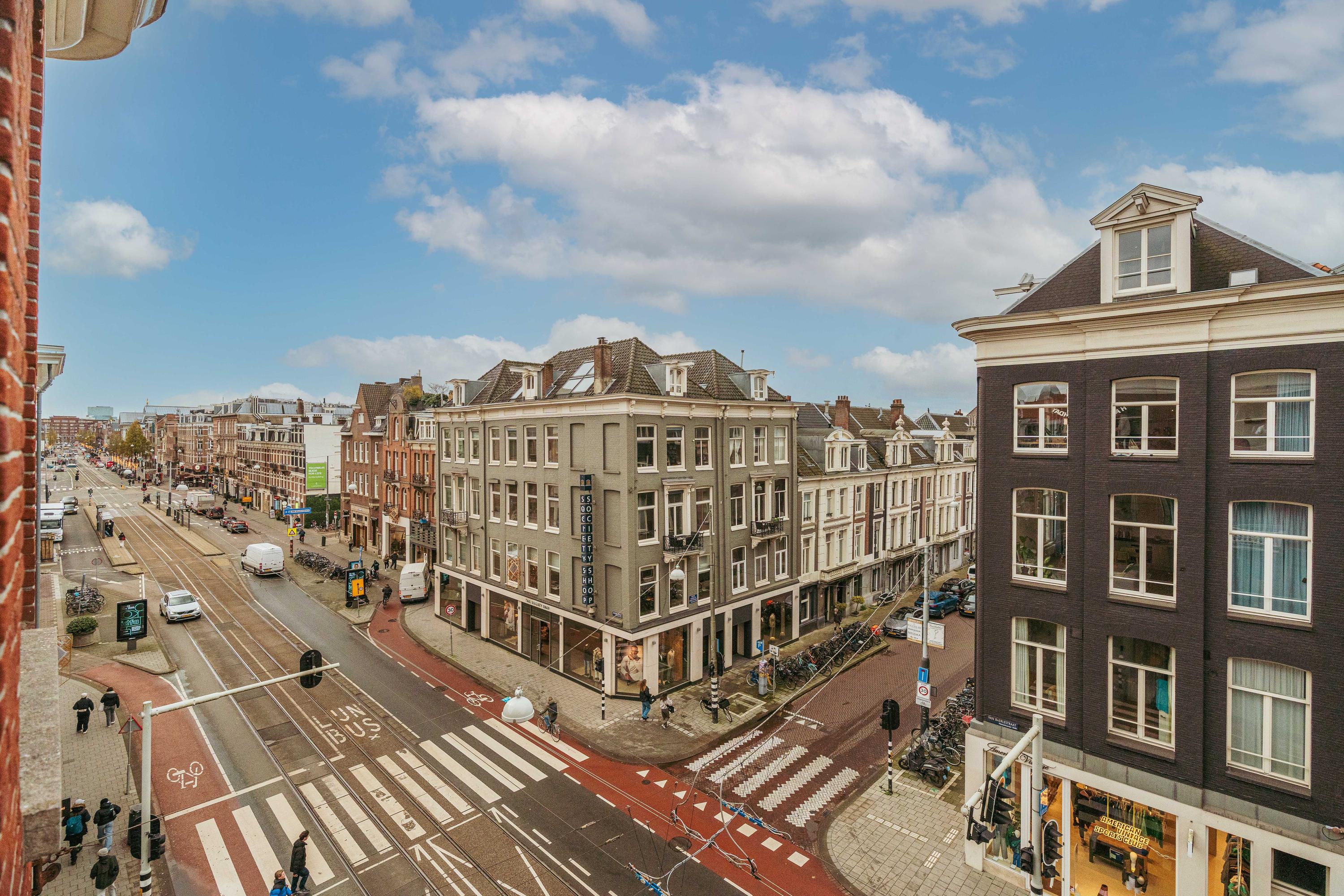 The generous open-plan living space is designed for both relaxation and entertaining, with a sitting area, sizeable dining section, and a well-appointed kitchen that includes modern appliances such as a dishwasher, two ovens, and a 5-burner gas stove. The large windows frame views over bustling Van Baerlestraat and the iconic P.C. Hooftstraat, while original detailing offers a sense of place rooted in Amsterdam's architectural heritage.