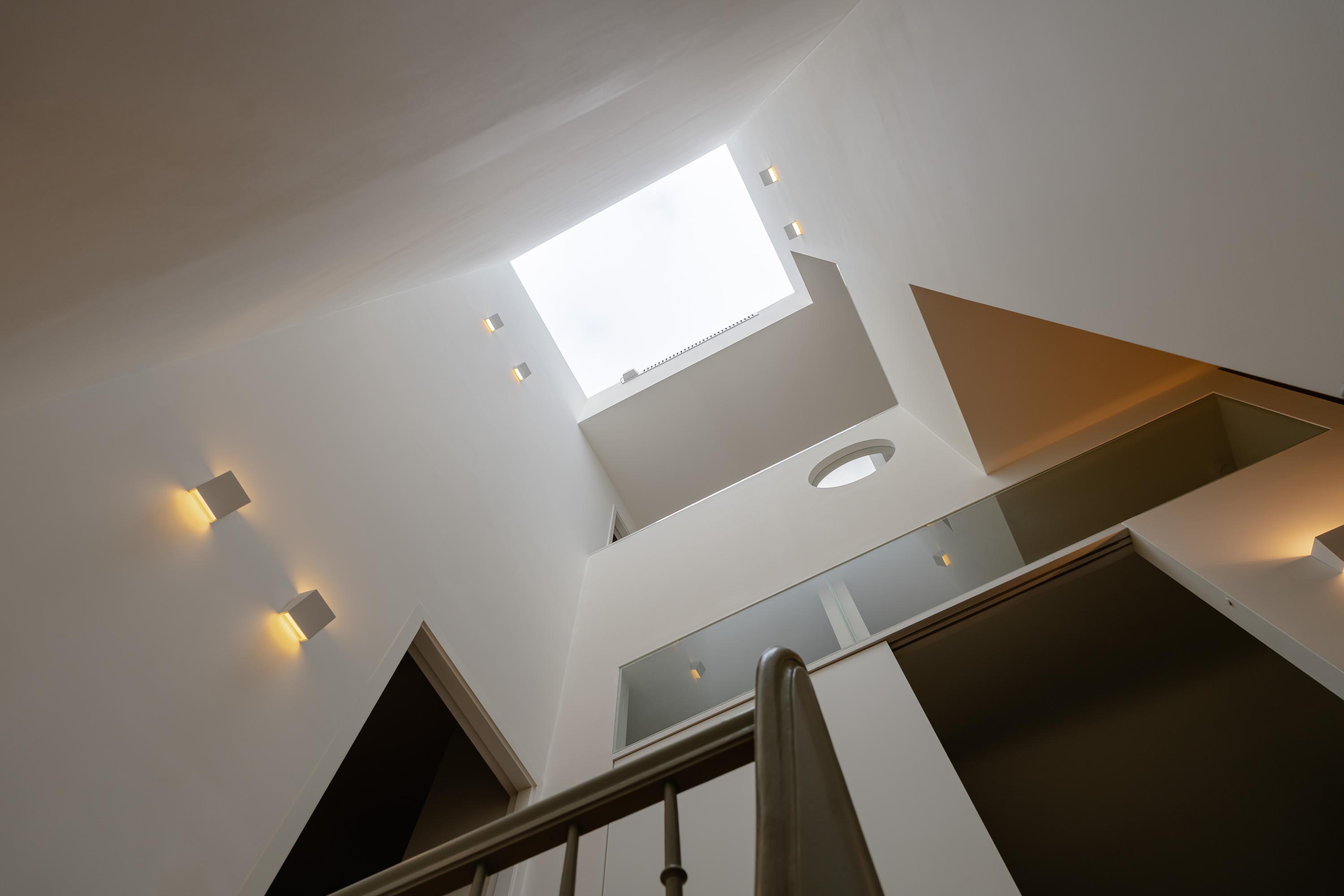 Upon entering the residence, the striking play of daylight immediately captures your attention. A large skylight at the top of the house allows natural light to cascade through the central staircase and spacious atrium, creating an open and airy atmosphere on every level.