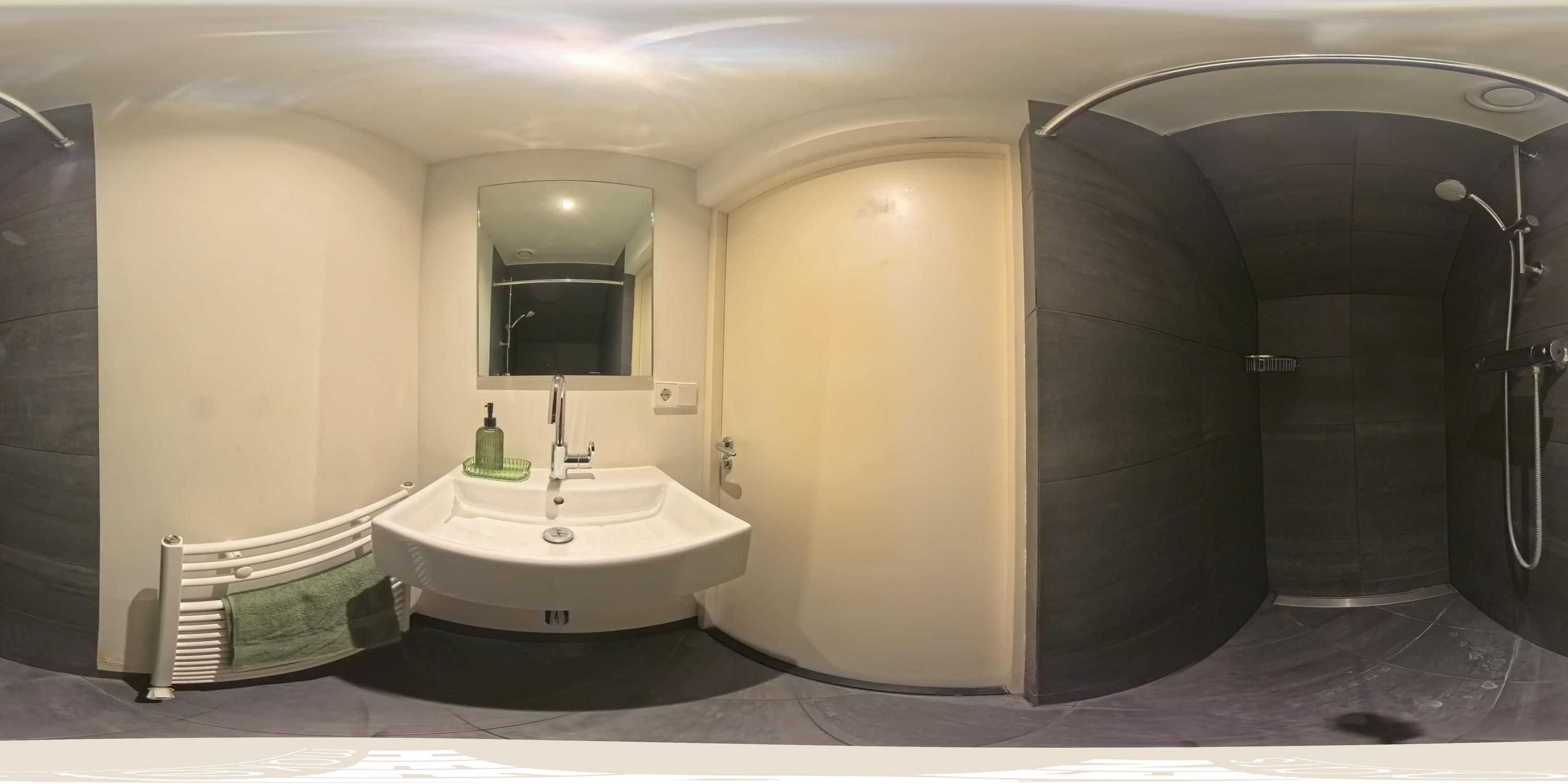 An open staircase in the living room leads to the first floor, which also has its own entrance via the communal staircase. The spacious hallway provides ample space for a coat area and additional storage. Here, you will find the first bathroom, fitted with a walk-in shower, washbasin unit, and a separate WC with a small sink.