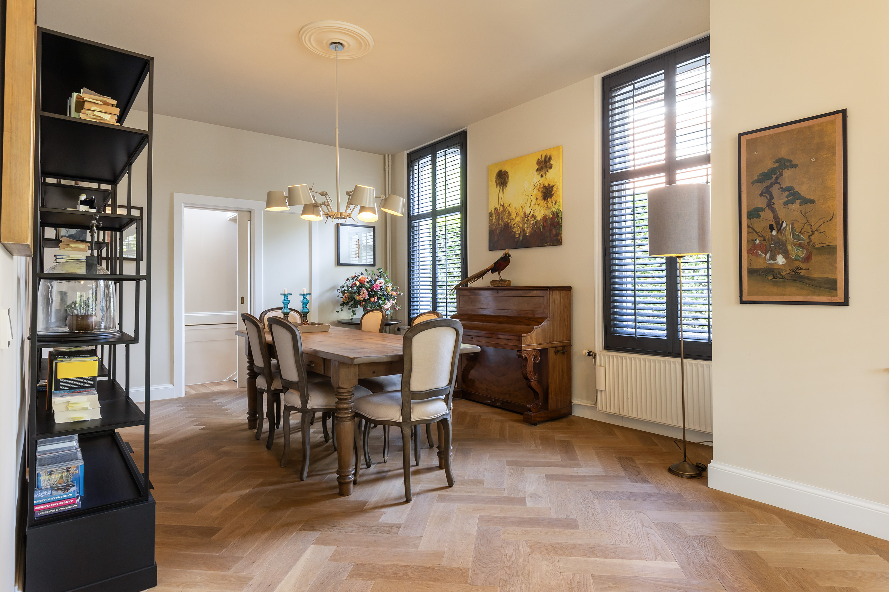 The spacious living room, with high decorative ceilings and large arched windows, exudes elegance and character. The sitting area offers views over the Oranjepark, while the bright conservatory with French doors to the garden provides a perfect spot to unwind. The combination of authentic details and black shutters creates a tasteful balance between light and privacy.
