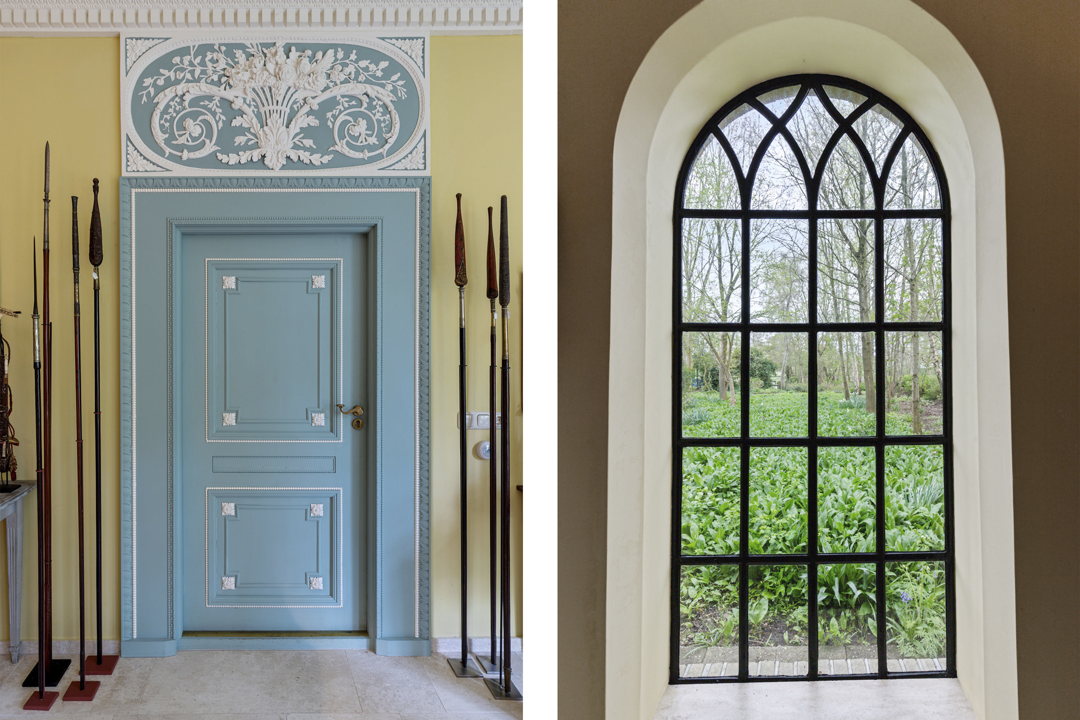 The entrance through the kitchen is adorned with an 18th-century transom, delicately carved from linden wood. The kitchen, crafted in historic style by master artisan F. van der Velde, blends seamlessly with the authentic ambiance of the home.