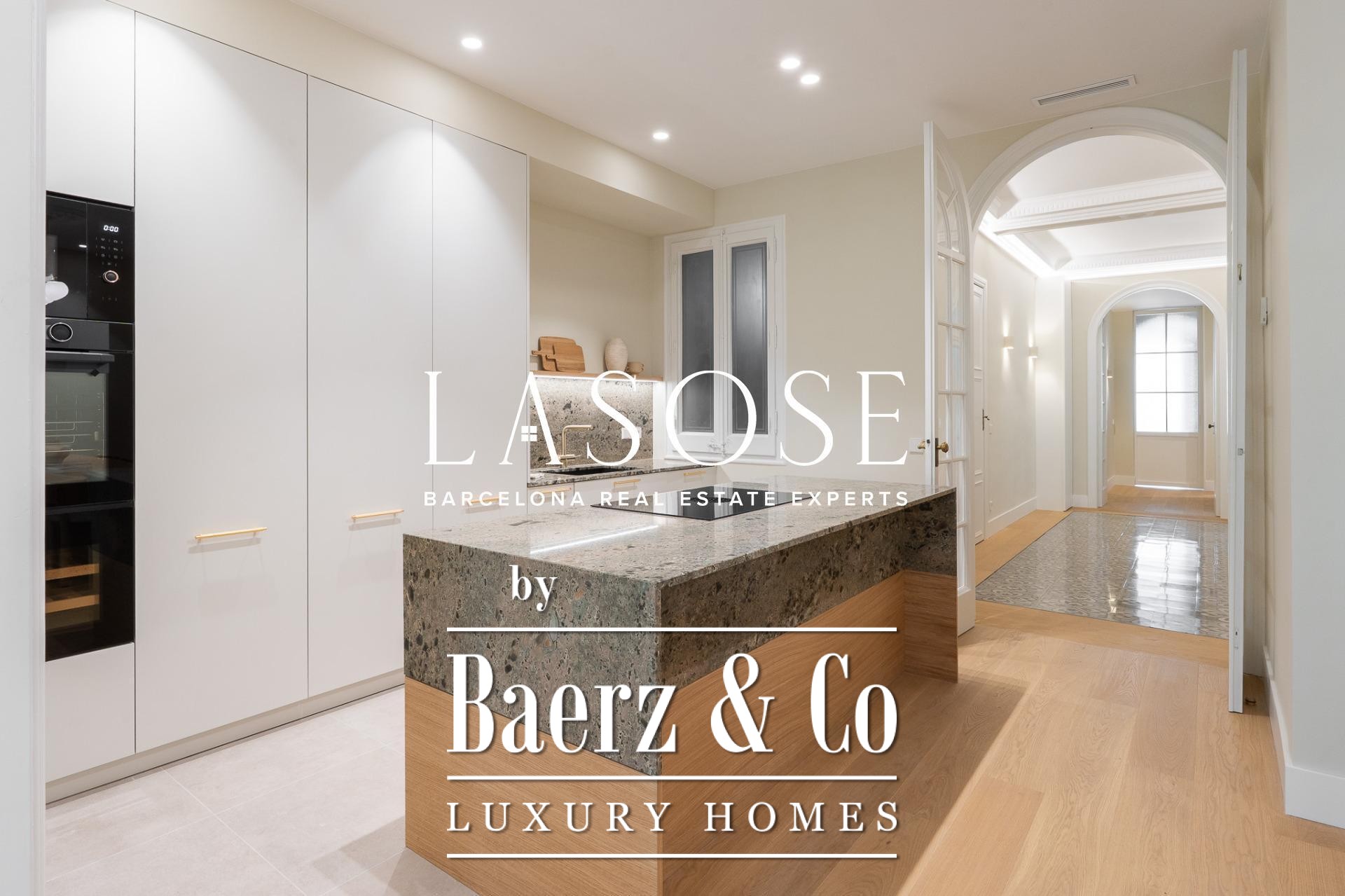 LASOSE is privileged to present this magnificent high-end residence, located in the heart of Barcelona's coveted Eixample district.. . Located in an elegant listed royal estate dating from 1900, this property stands out for its stately architecture, its historical value and its unmistakable character. It is a unique apartment, where the charm of Barcelona's modernism merges with the most demanding comfort and contemporary design.. . Located on a bright 2nd floor with double orientation, the property enjoys abundant natural light throughout the day. Its careful distribution maximizes every corner, offering spacious, functional and stylish spaces.. . The property has three elegant double suites, all with full bathroom, and one of them equipped with an exclusive glazed gallery, perfect as a chill out corner or as a sophisticated workspace.. . The spacious living-dining room is harmoniously integrated with a designer kitchen with central island, equipped with top-of-the-line materials and appliances: polished marble countertop by Levantina, porcelain flooring, and high-end appliances by De Dietrich, Bora and Liebherr (including refrigerator, dishwasher and wine cooler).. . In addition, the dining room - bathed in natural light - can easily be transformed into a fourth bedroom according to the buyer's needs.. . This exclusive home offers luxury finishes such as natural wood floors, original hydraulic tiles and high ceilings decorated with moldings and rosettes, which