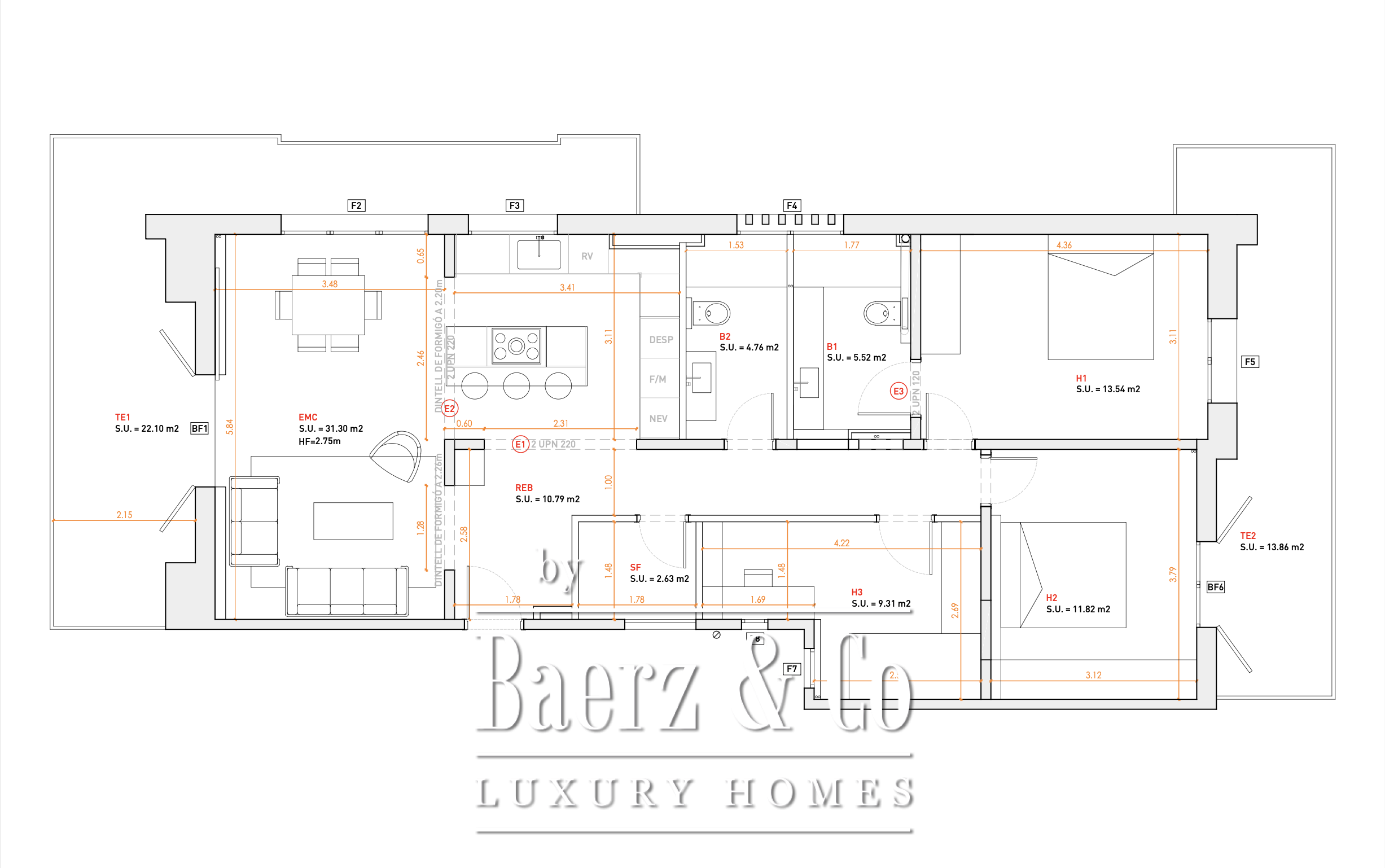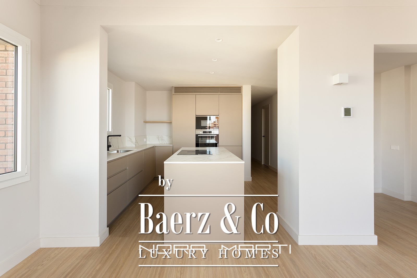 The interior offers a spacious living and dining area opening directly to the terrace. The kitchen is fully equipped, anchored by a central island complemented by a separate utility space. Three bedrooms form the private quarters: an exterior suite bedroom with built-in wardrobe, private bathroom, and access to a 16 m² gallery, a medium bedroom also opening to the gallery, and a single bedroom, both sharing a full bathroom.
