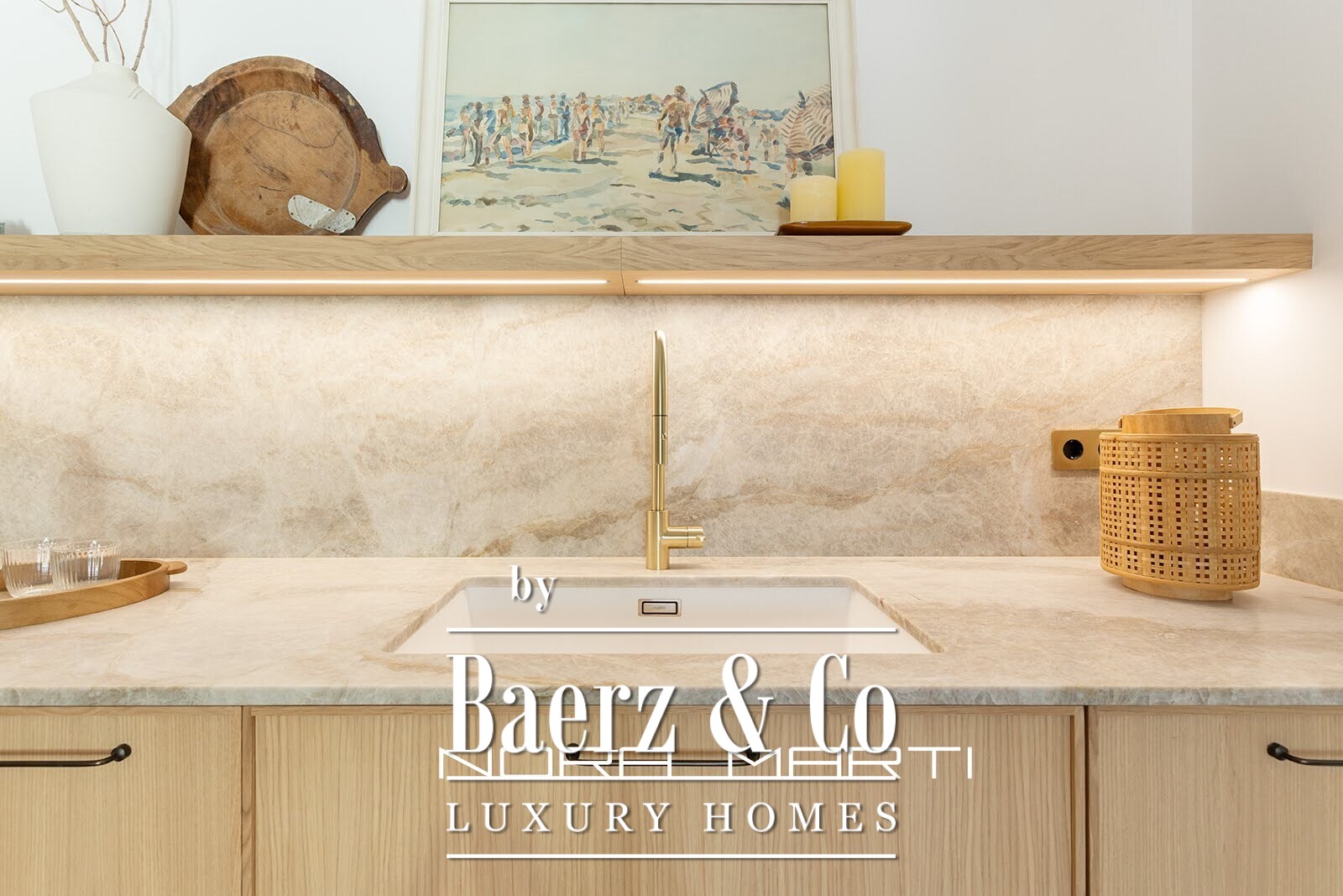 The living room, anchored by handcrafted local tiles and floor-to-ceiling windows, opens to a quiet terrace, blending indoor comfort with outdoor calm. A fully modernized kitchen, equipped with a wine cellar, large oven, and spacious dining area, fosters both daily living and hosting. Interior design weaves natural elements with subtle elegance, pairing natural oak flooring in wide planks with underfloor heating and dual-zone climate control for consistent comfort.