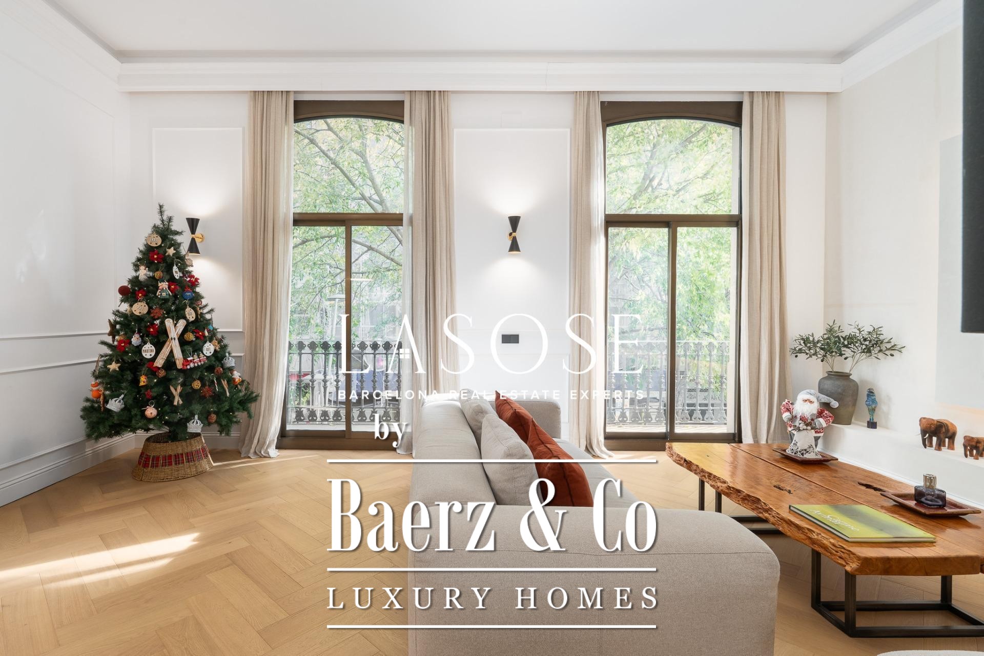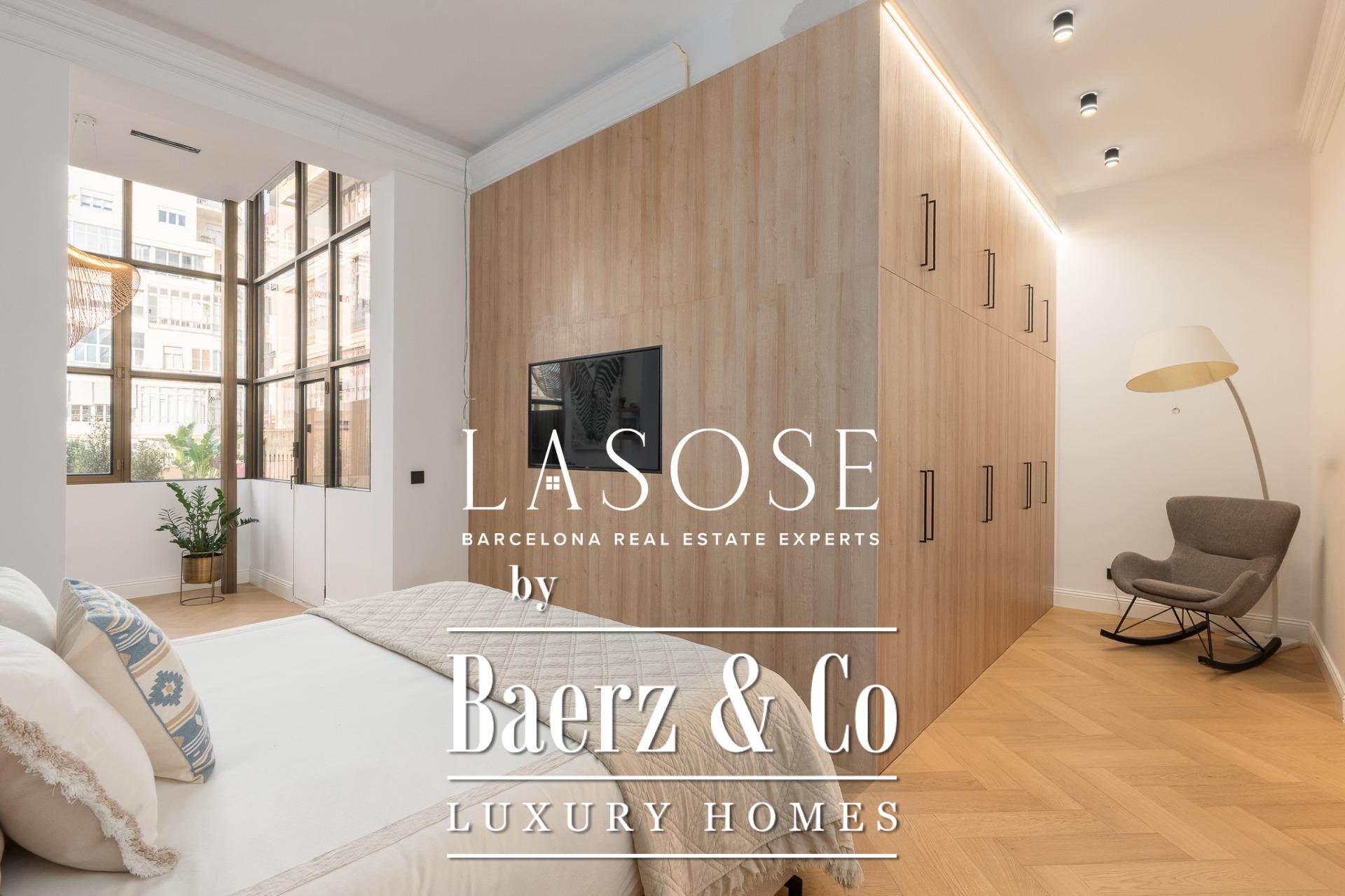 This Modernist apartment Barcelona Quadrat d'Or is a rare opportunity, offering 150 square meters of meticulously restored interior space and an extraordinary rear terrace spanning approximately 100 square meters. The residence, part of a protected building, was completely refurbished in 2024 with high-end finishes. Heritage details have been preserved, including natural oak exterior woodwork, tall interior doors, and unique fitted wardrobes, all contributing to a sense of enduring quality.