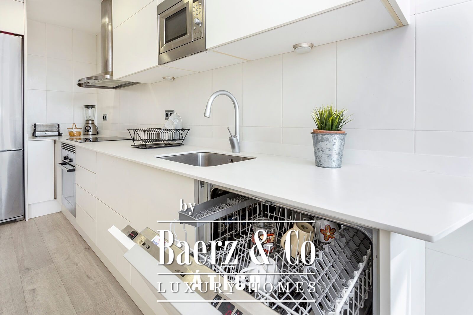 Inside, two bedrooms—one double and one single—suit couples or small families seeking a well-proportioned retreat. Parquet floors run throughout, with the living spaces oriented to catch the shifting Barcelona light and vistas of both the city and the distant mountains. The fully equipped kitchen and modern appliances reflect a considered approach to city living.