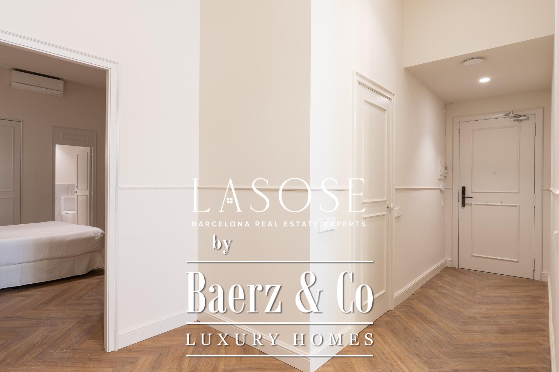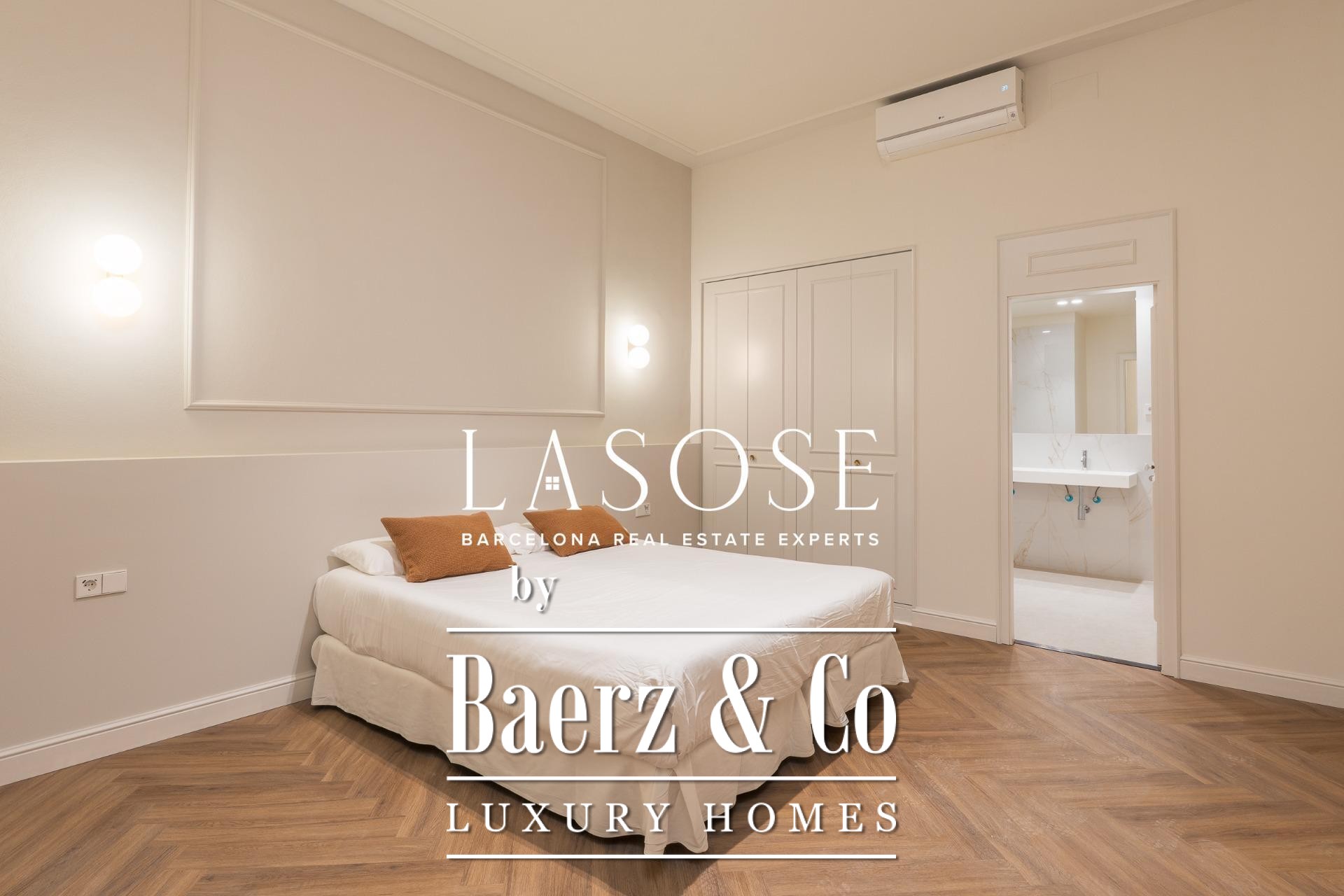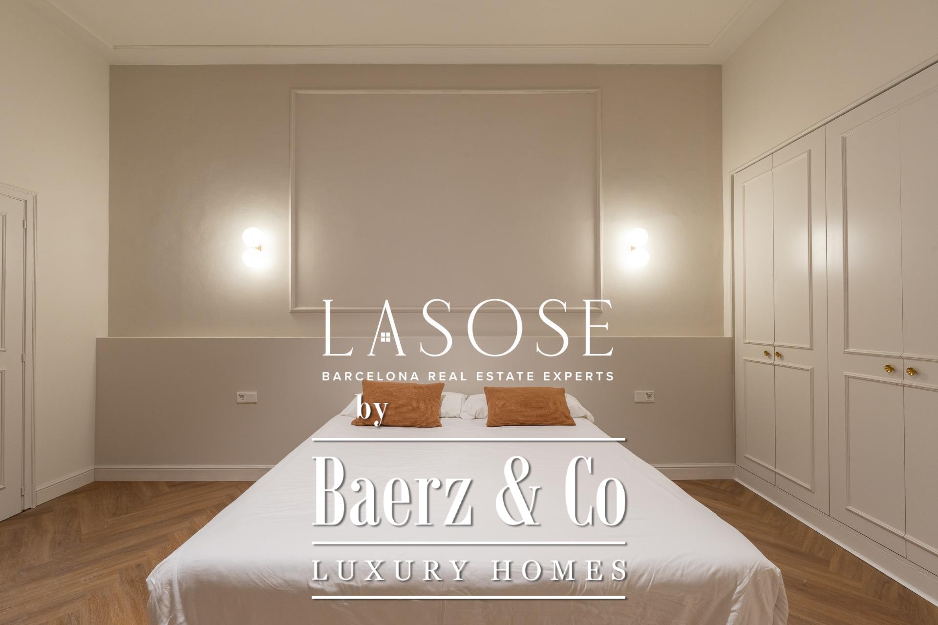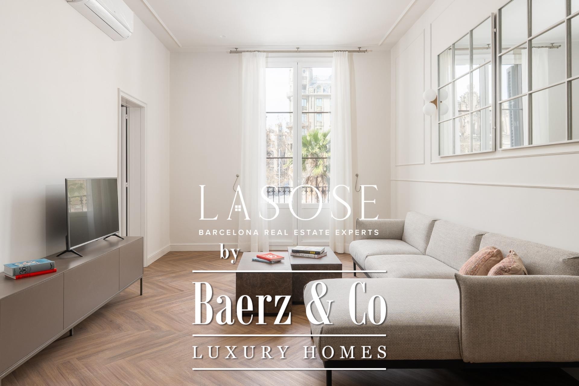 Apartment Barcelona is redefined in this exceptional 118 m² residence, showcasing a meticulous renovation within a historic 1850 building, now a Local Heritage Site. The property achieves the rare harmony between preserved architectural character and the expectations of contemporary luxury. Entering, you are welcomed by an immediate sense of space and refinement, with an open-plan living and dining area bathed in natural light through generous windows facing Paseo Isabel II. Designer furnishings and premium finishes elevate every moment spent here.