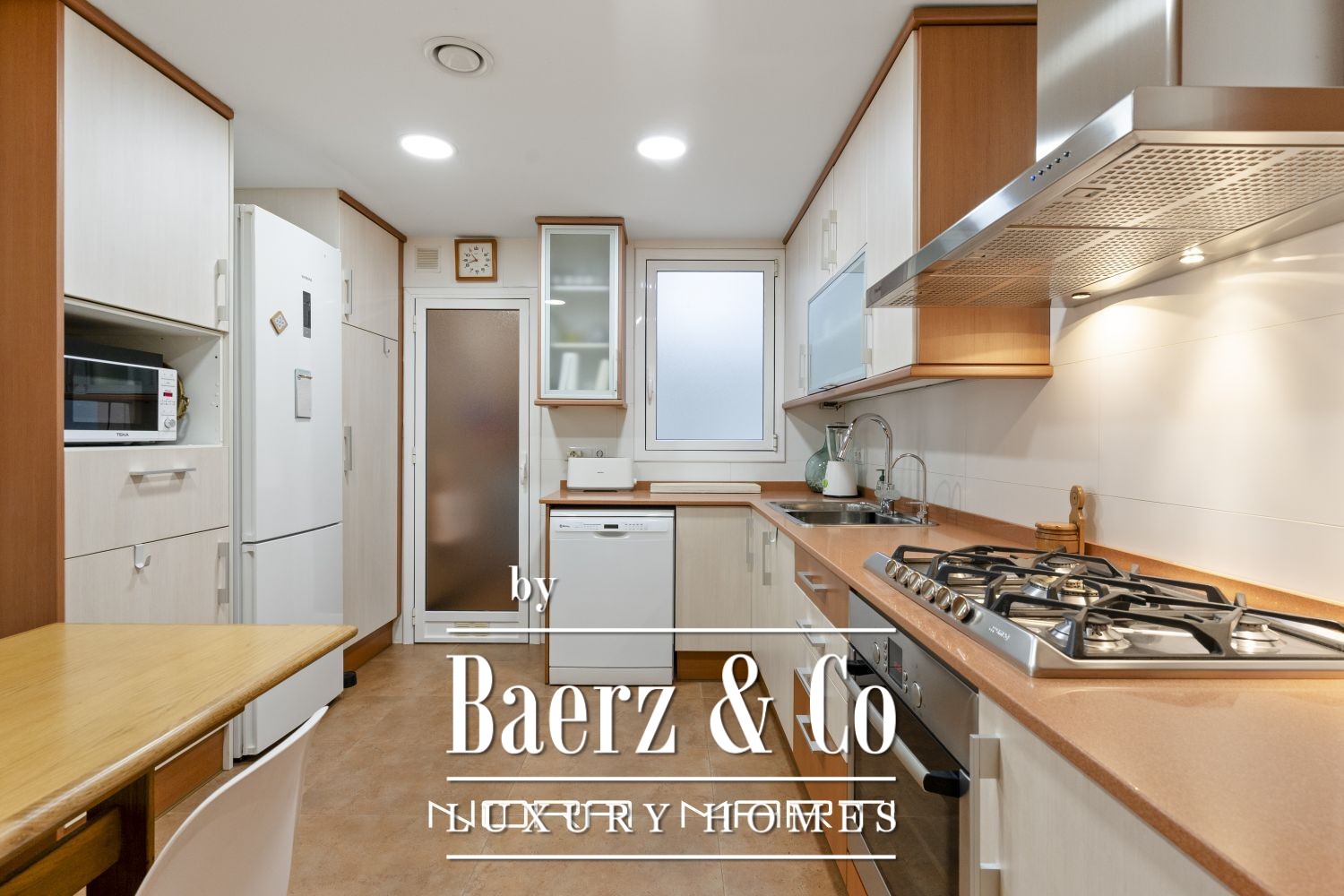 The 15 m² terrace offers a tranquil outdoor setting for private relaxation or open-air dining, inviting the outdoors into daily life. The eat-in kitchen is both practical and well equipped, designed to enhance the rhythms of everyday living. A separate laundry area adds to the home’s organization and ease.