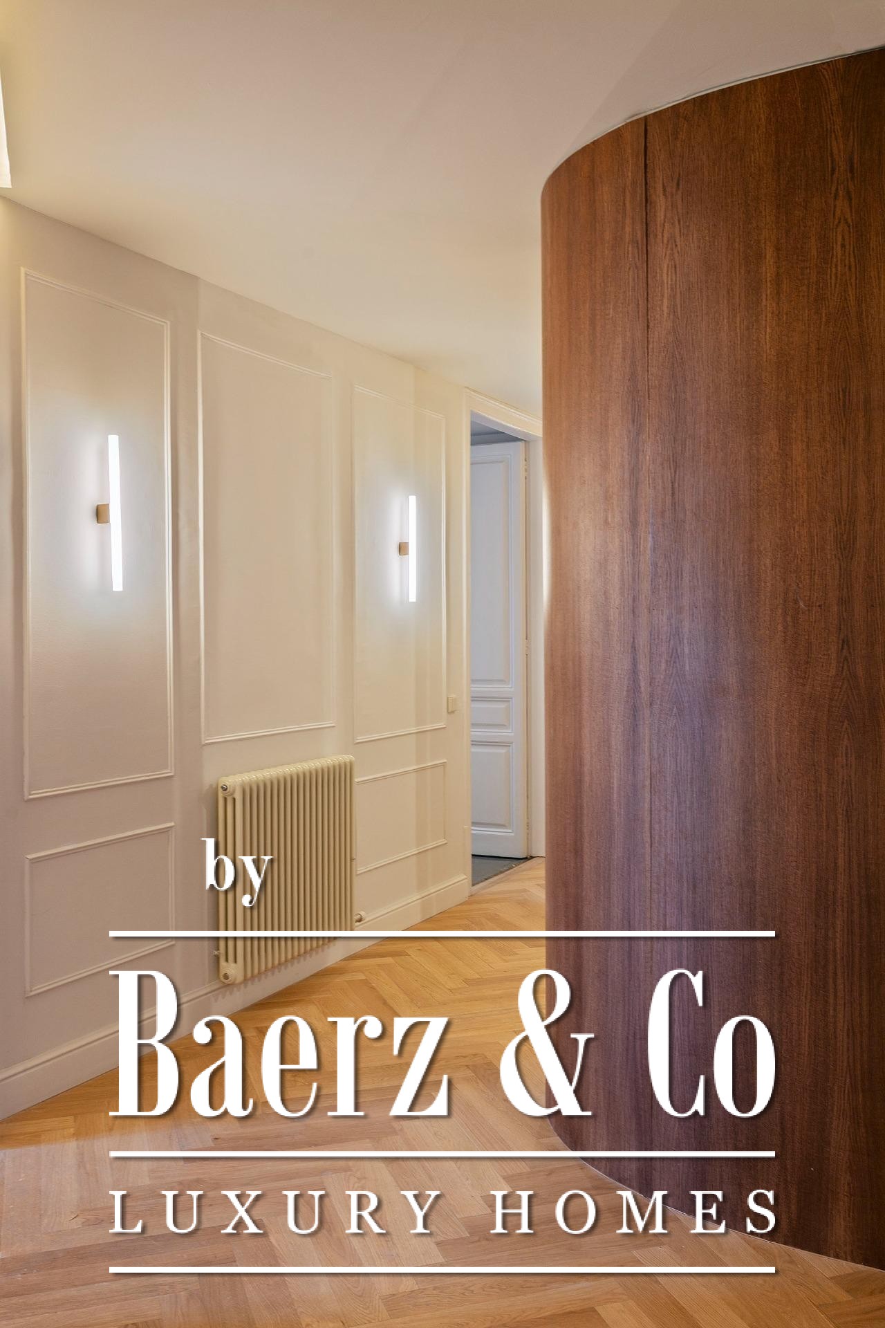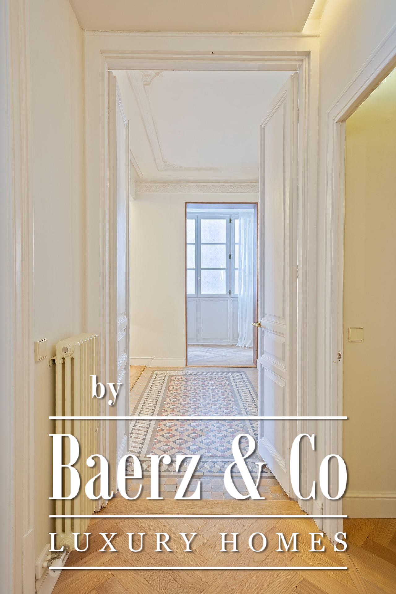 A versatile independent study provides options for work or retreat, complemented by two additional full bathrooms and a guest powder room. Restored original hydraulic tile floors and ceilings pair with herringbone natural oak parquet and bespoke paneling, combining authentic charm with elegant modernity. Balcon, elevator, fitted wardrobes, integrated laundry, and quality heating round out a property of enduring appeal.