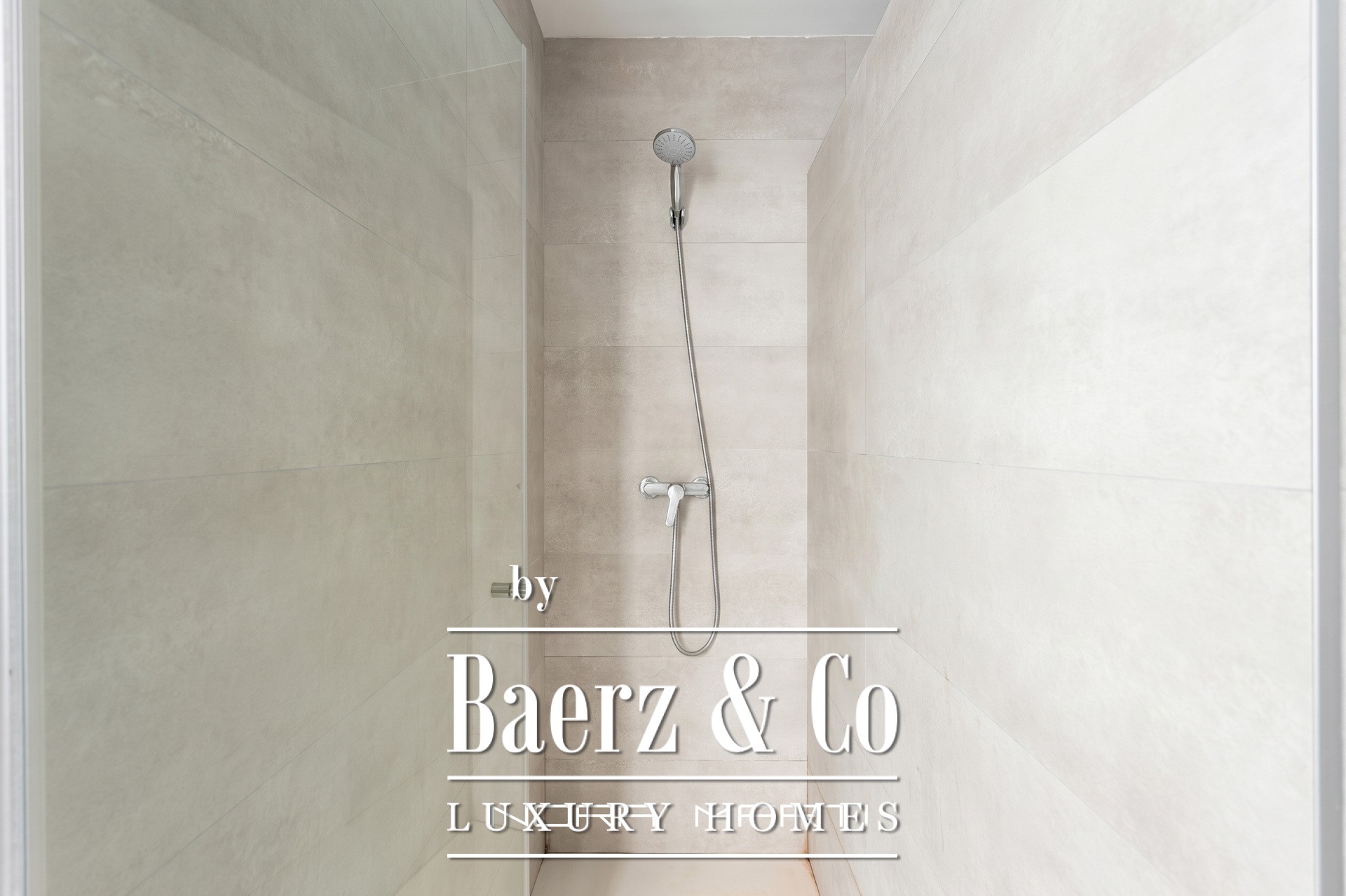 The renovated kitchen, fully equipped and distinctively bright, is complemented by a practical utility room. Four quietly private bedrooms define the sleeping area, including two en suite configurations with spacious bathrooms, one of which enjoys access to a balcony. Two further bedrooms, a double and a single, share a full bathroom, allowing households flexibility in use and privacy.