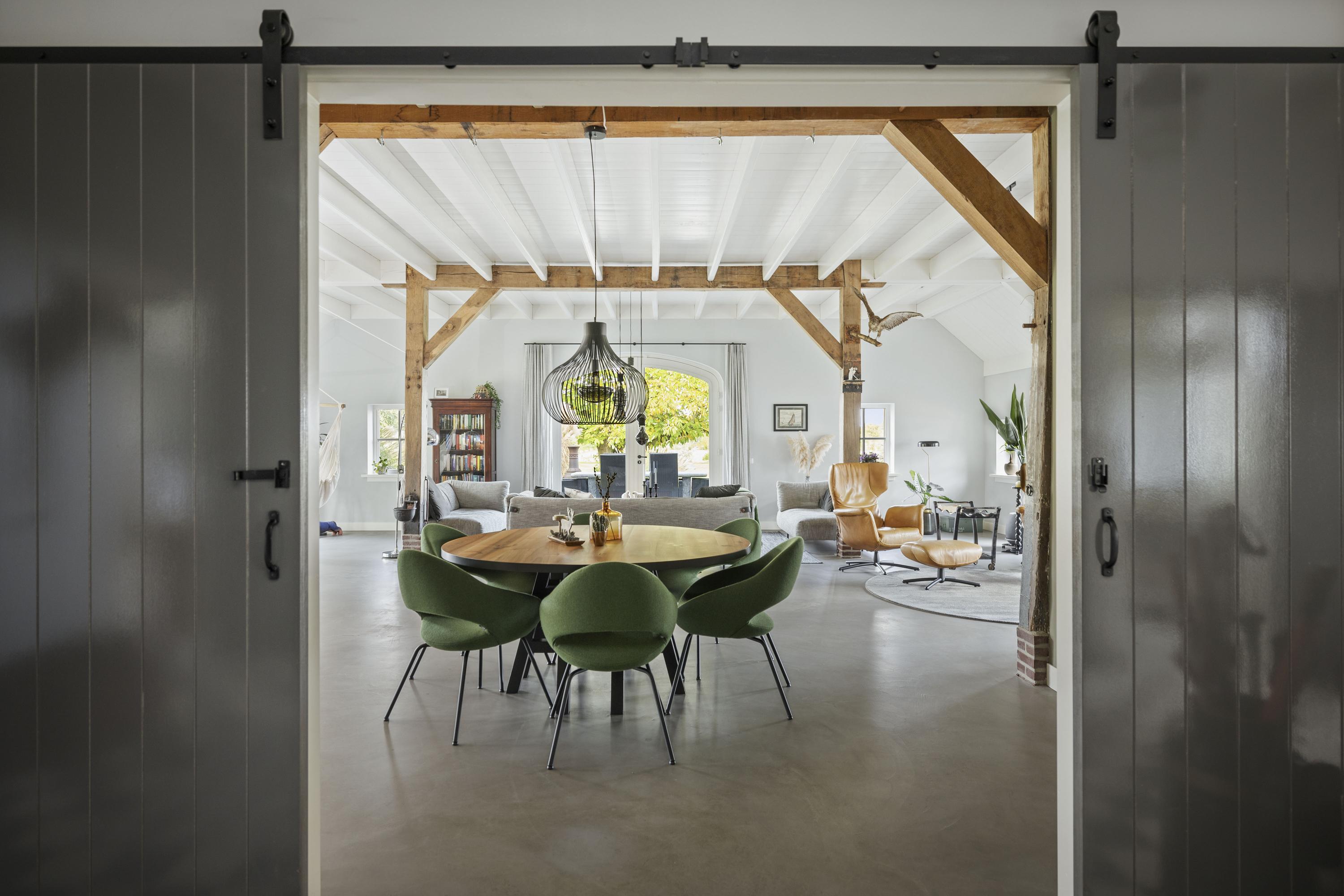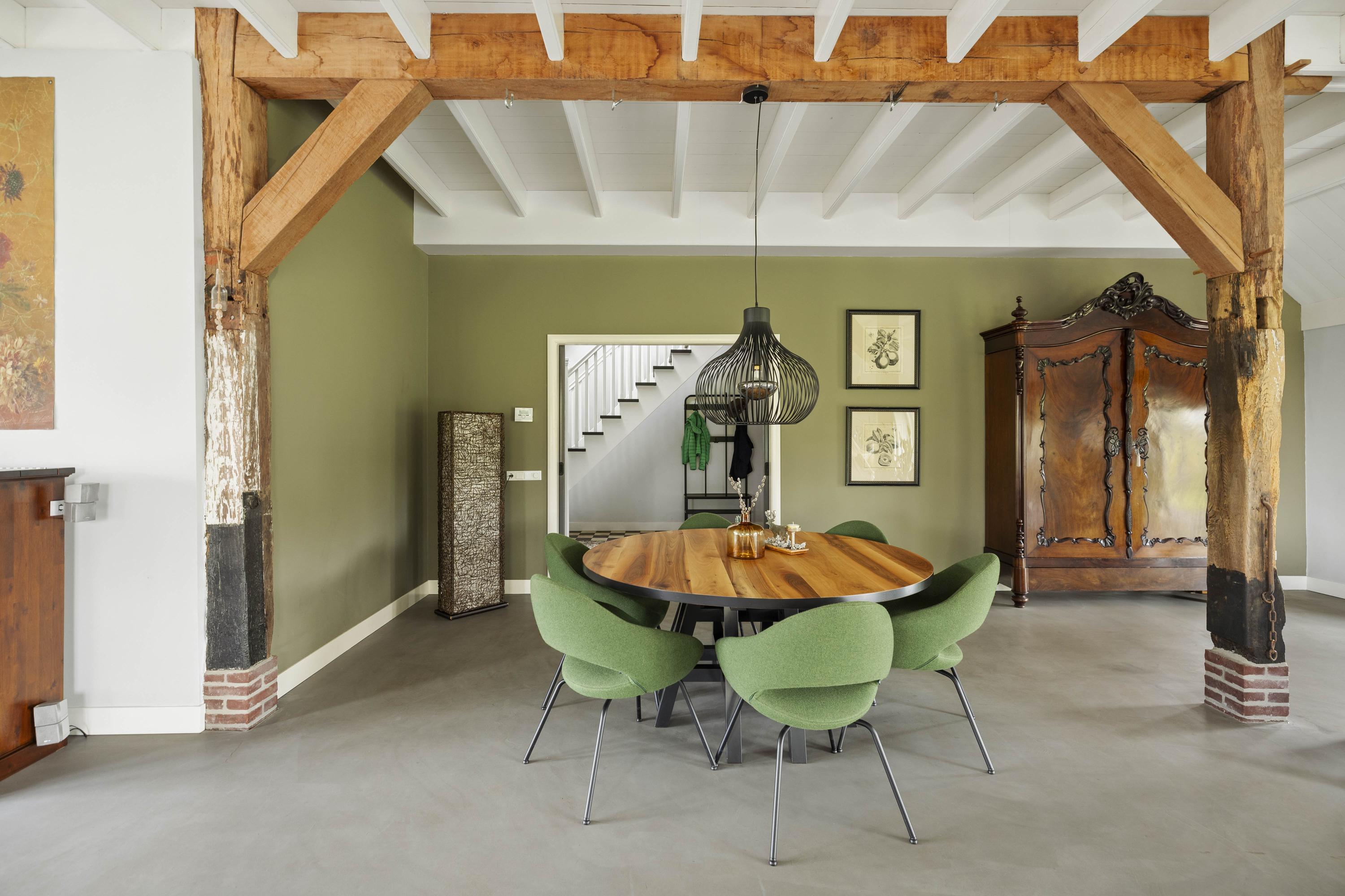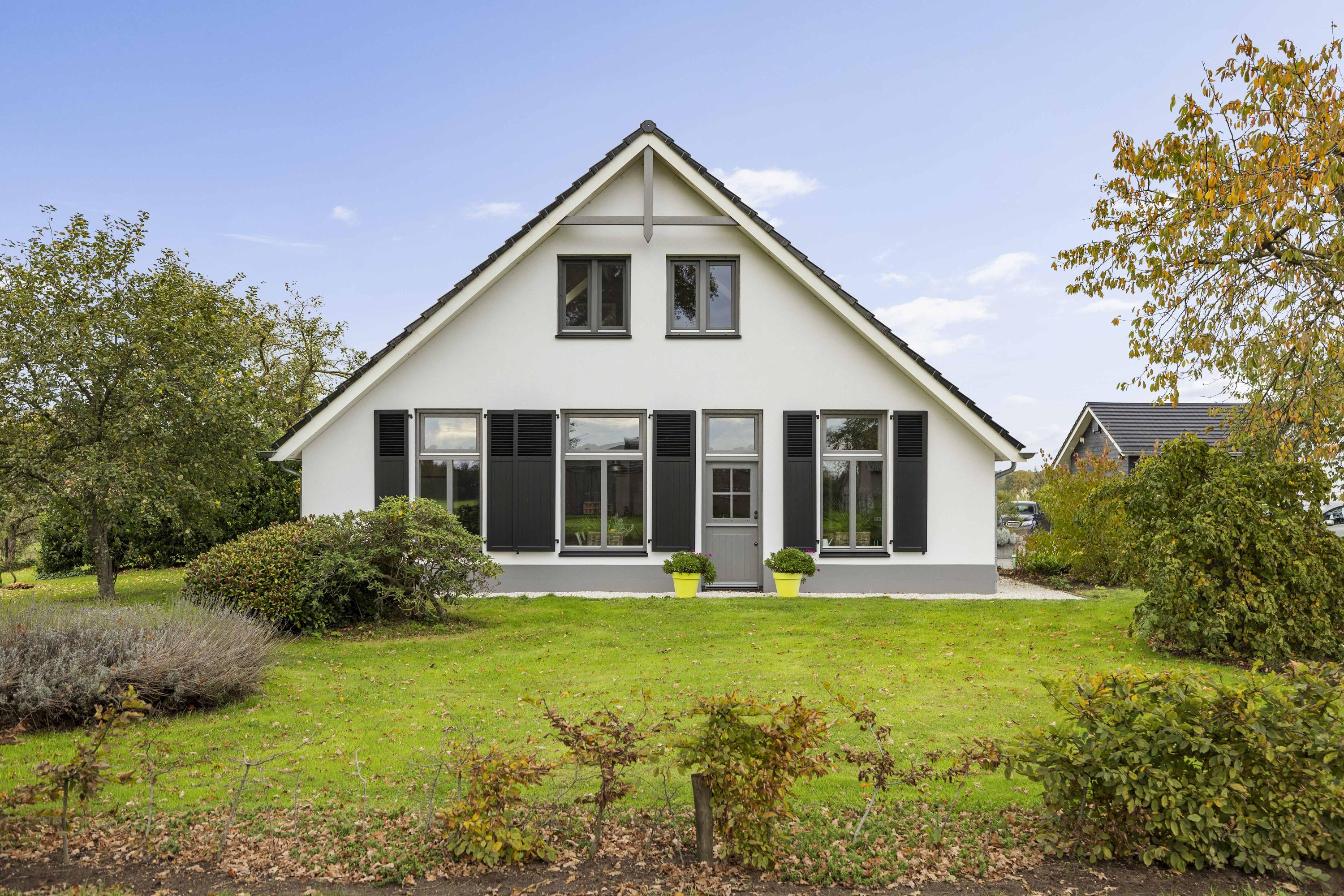 This magnificent farmhouse took on its current form in 2016, when the farm, which was built in 1924, was completely renovated. The emphasis was on sustainability: the exterior was fully insulated with polystyrene blocks, the house was fitted with new HR+++ glass all around, a water-water heat pump was installed (which exchanges and extracts heat at a depth of 75 metres), the interior floor was fitted with a robust cast floor – ideal in combination with underfloor heating – and a total of 110 (no, this is not a typo) solar panels were installed on the roofs. Under the bonnet, this house is all state-of-the-art technical ingenuity. Even the colour palette – the exterior is whitewashed with grey woodwork and beaded edging – contributes to the energy-efficient character of the house, because while the white facades reflect sunlight, the grey absorbs heat. Not only does this house have zero energy consumption, it also generates a considerable amount of energy! A home battery is therefore an excellent addition here.