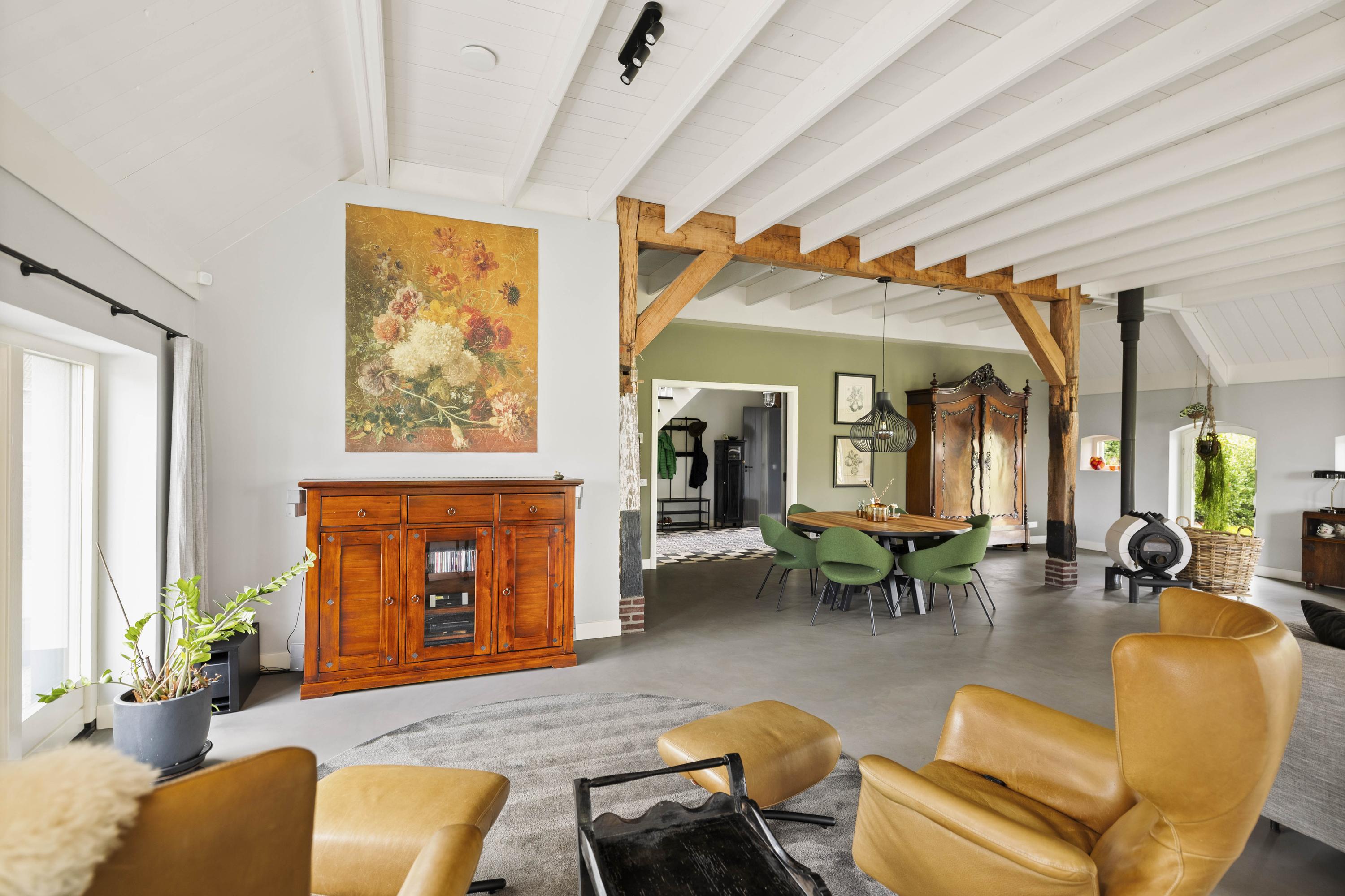 The spacious hall with Portuguese tiles offers a generous welcome. The hall provides access to the technical room, the stairs to the upper floors and the living areas on the ground floor. The former barn is now a delightful living room and the old barn doors have been replaced by large windows. The Bulle-Jan (FreeFlow, A++) wood-burning stove provides cosy warmth.