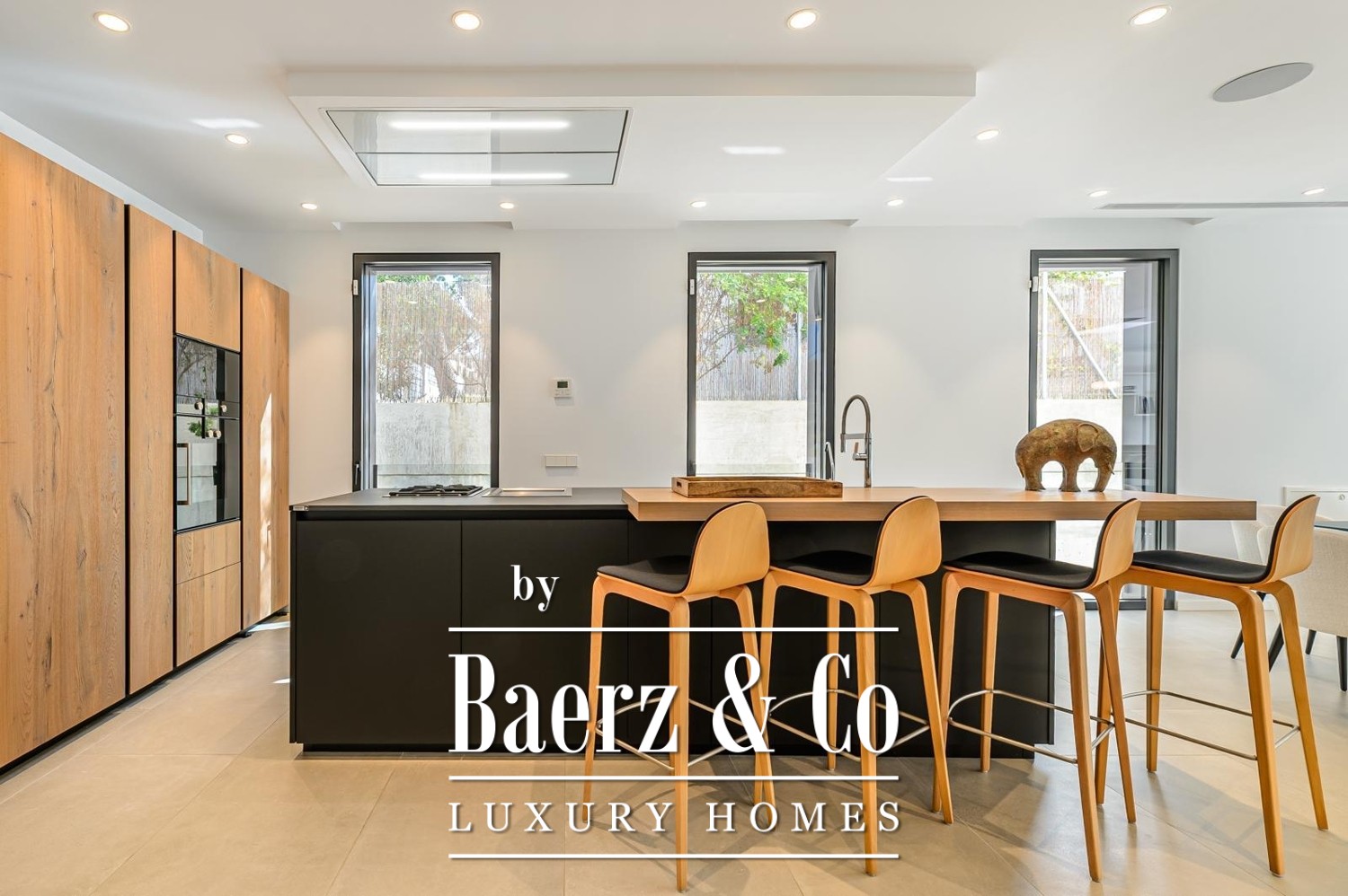 Facing southeast to capture year-round sunlight and spectacular sea views, the villa spans 340 m2 across two levels on a 470 m2 plot. The open-plan main floor seamlessly integrates a designer kitchen with central island, dining, and living areas—flowing onto the terrace and saltwater infinity pool with a counter-current system. Floor-to-ceiling windows blur the boundary between indoors and out, flooding the home with natural light.