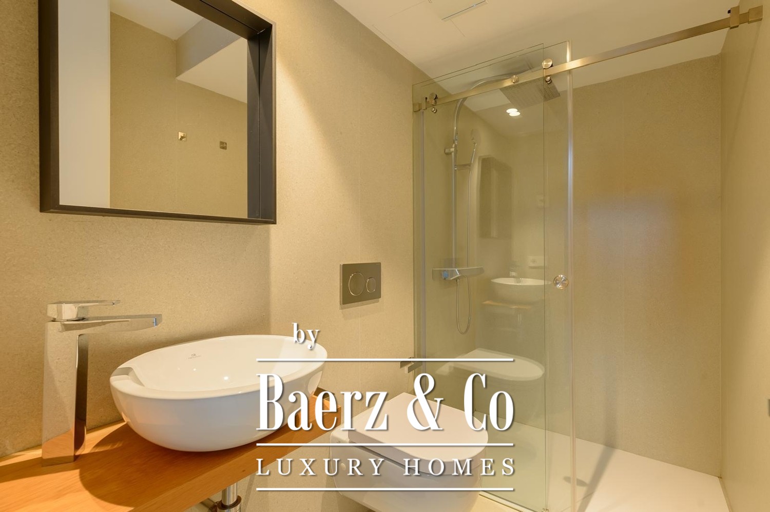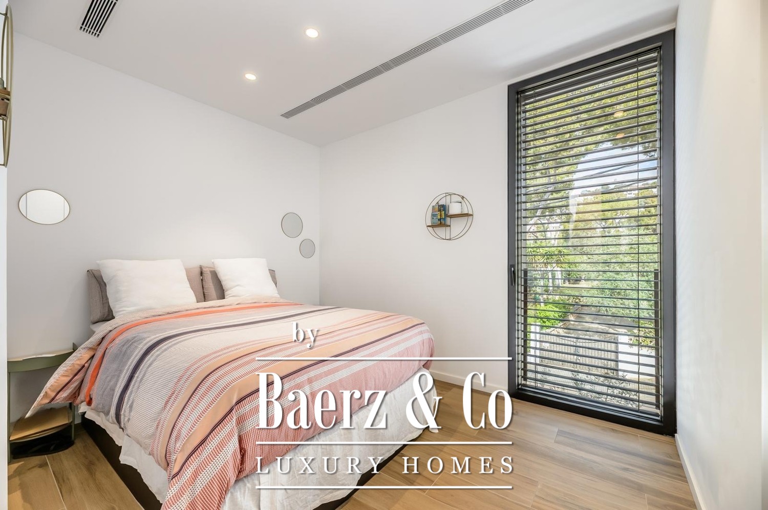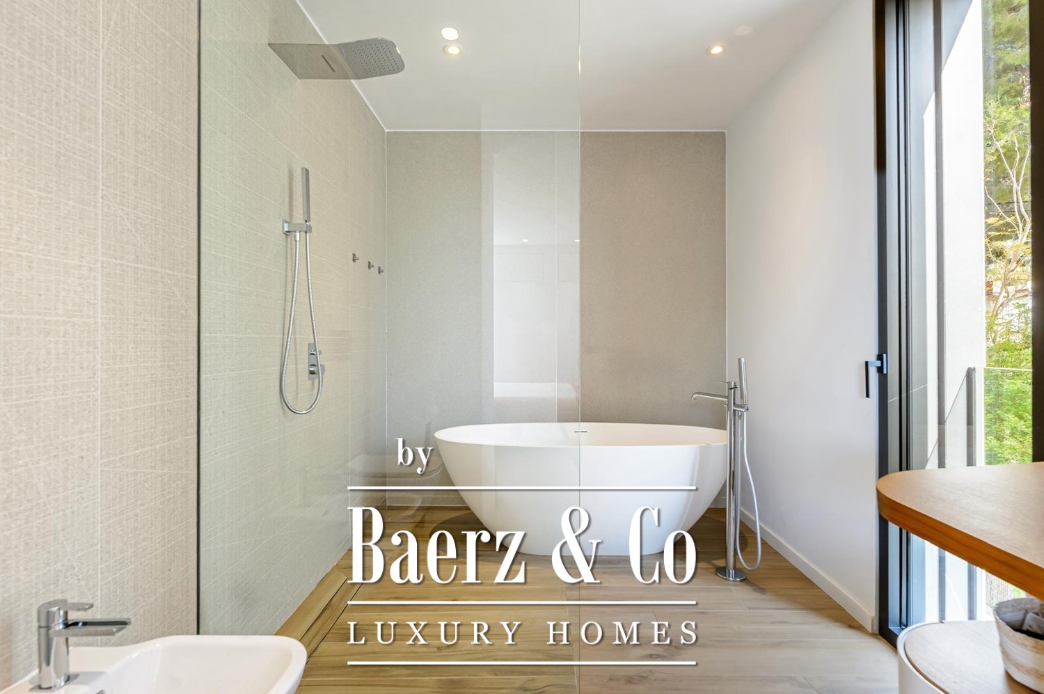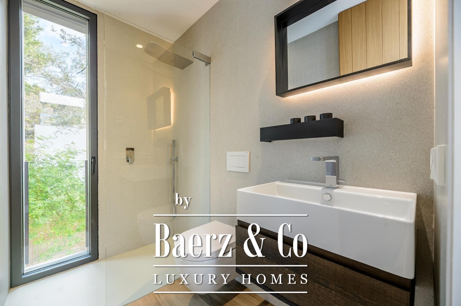 Upstairs, the master suite features a private terrace and panoramic sea views, accompanied by two additional bedrooms and an elegant shared bathroom. The lower level offers a two-car garage, gym, laundry area, technical room, storage, and an independent guest suite with en-suite bathroom, ideal for visitors or staff. A rooftop solarium crowns the villa, offering 360° views of the Mediterranean, the perfect spot to enjoy sunset evenings.