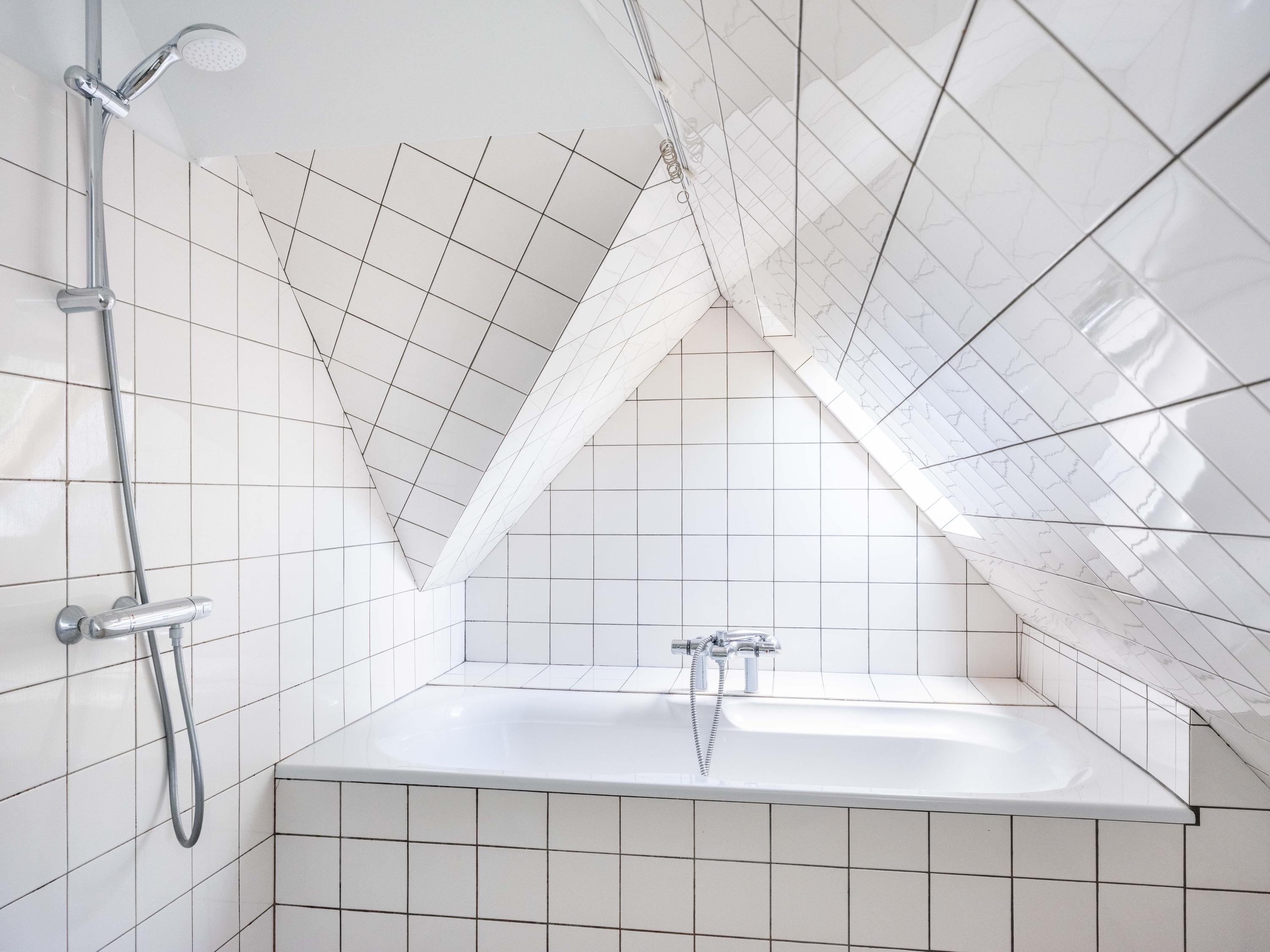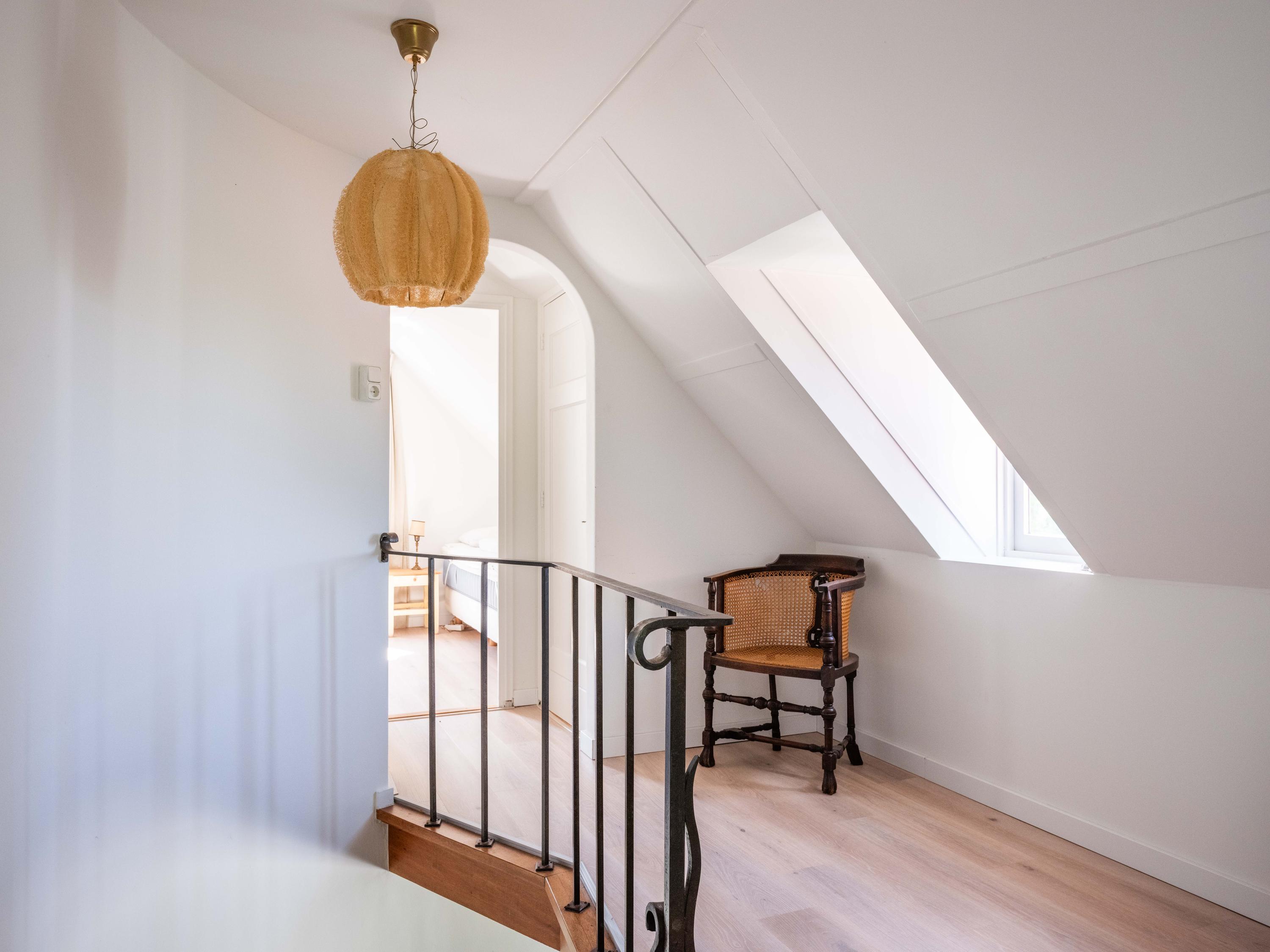The first floor has three bedrooms, each with a washbasin and built-in wardrobe. Thanks to several dormer windows, there is plenty of light and space. There is a separate central heating cupboard and a second bathroom with a bath, shower, toilet, skylight and mechanical ventilation. From the landing, a small dormer window offers a view of the coast.