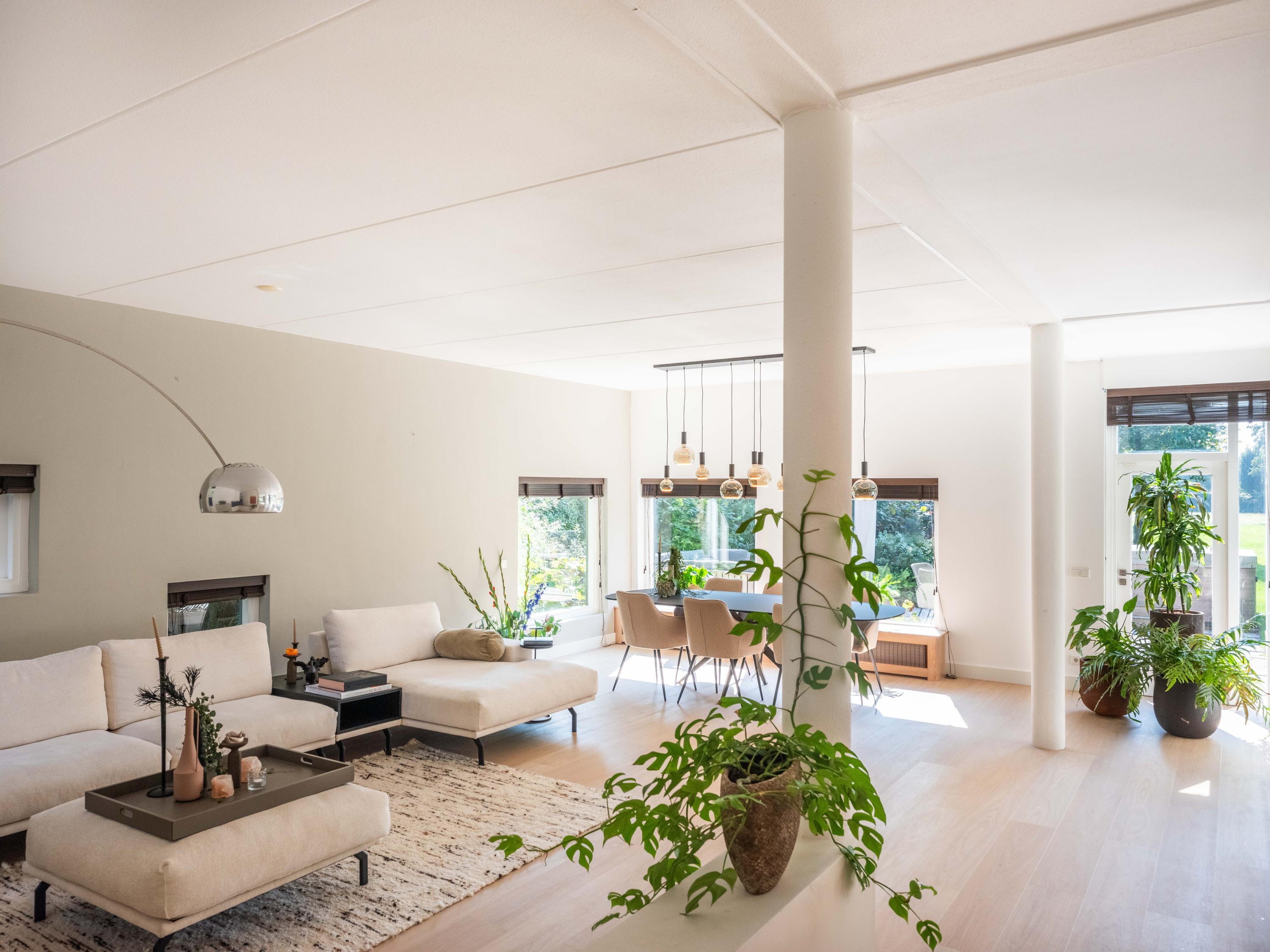 The modern open kitchen has an island where you can sit together. From here again a beautiful view of the greenery.French doors and a covered heated terrace bring the outside in.The kitchen is equipped with various appliances including a quooker, refrigerator, freezer, steam oven, wine cooler, warming drawer and dishwasher. Cooking is available on the large stove with 4 gas burners, a teppanyaki plate, deep fryer and double oven.