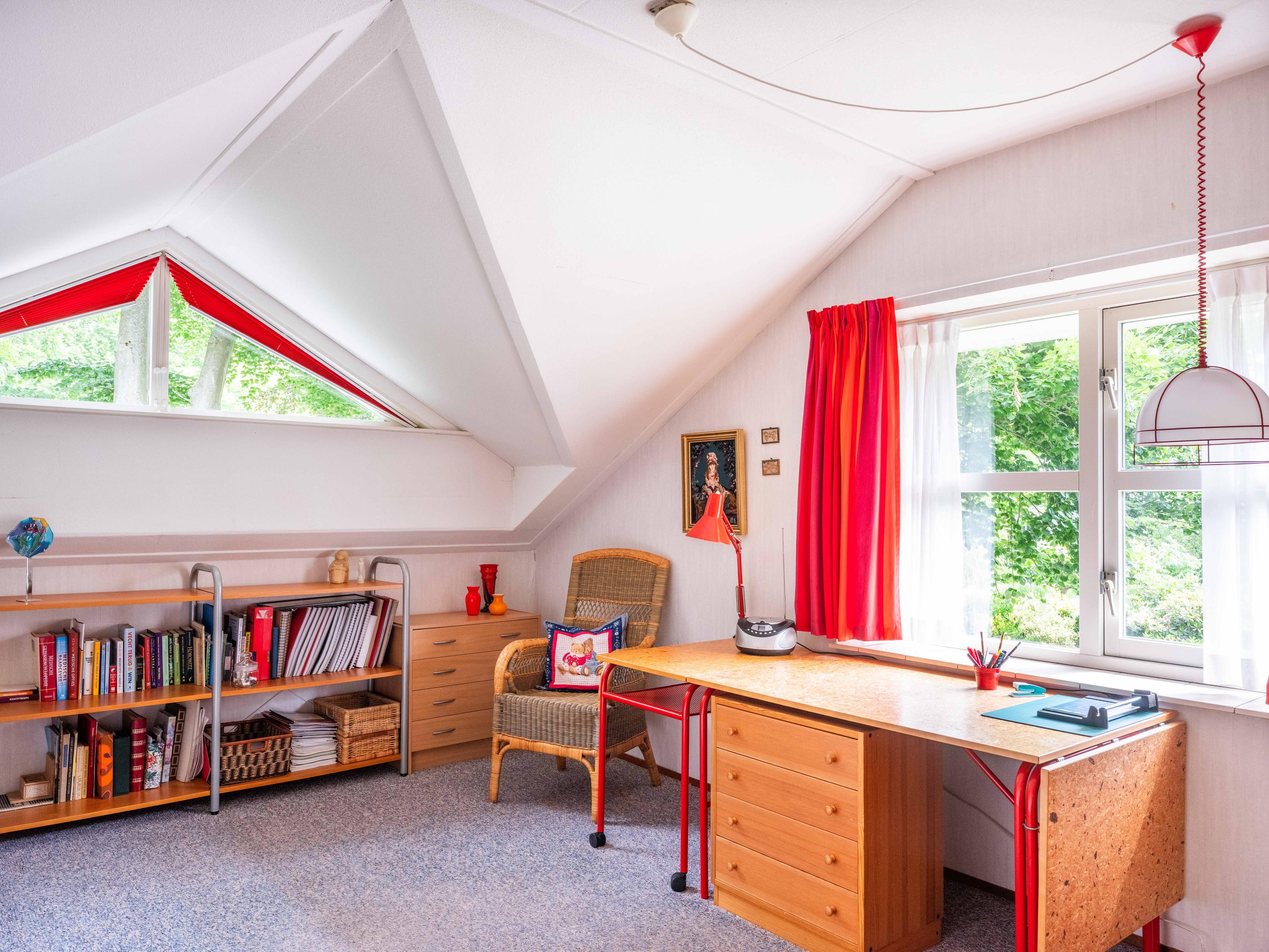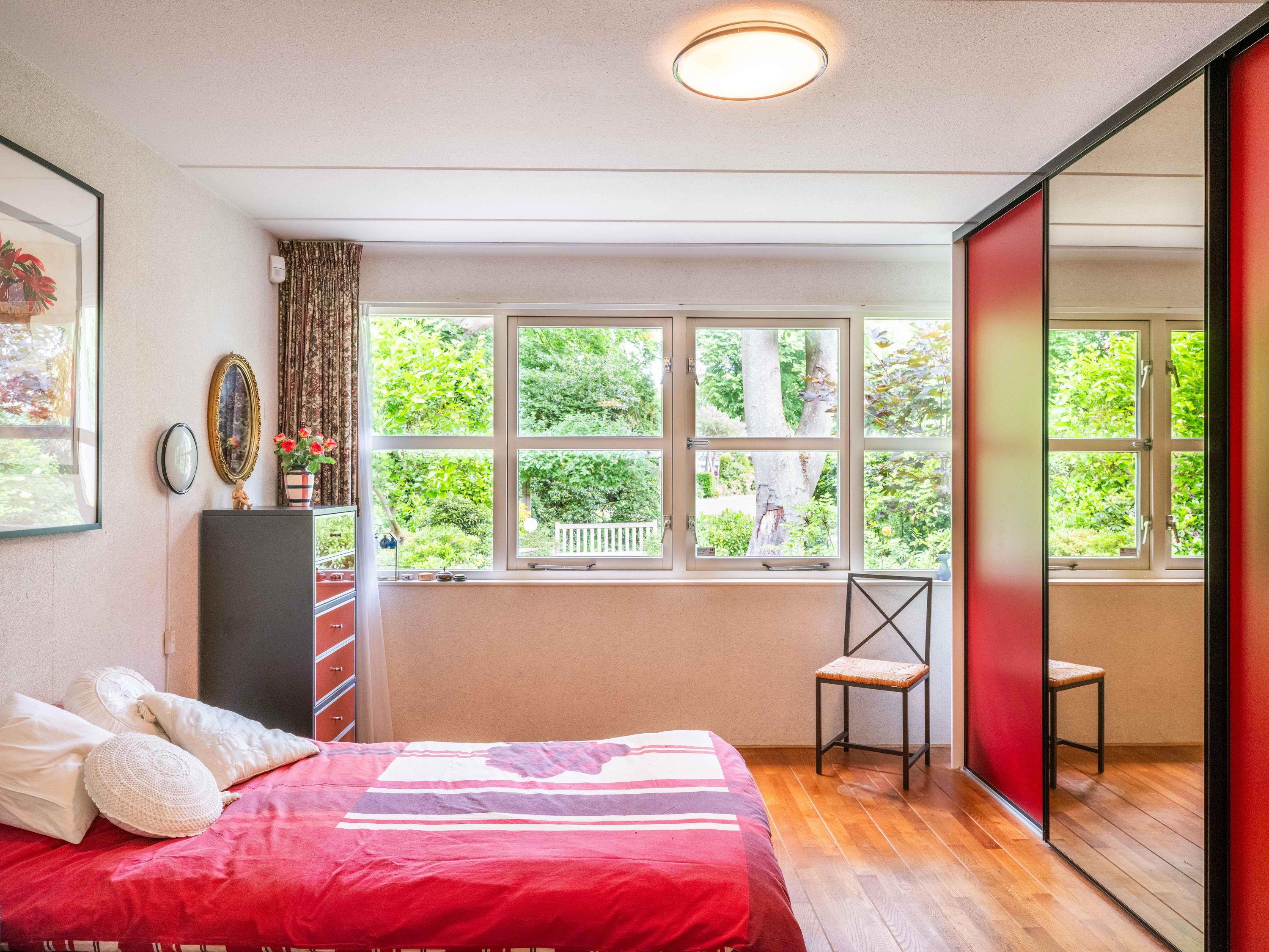 On the ground floor, you will also find a spacious room on the garden side, which can be used as an office, but is also ideal as a bedroom. The bathroom on the ground floor has a bathtub with shower, double sink, and toilet.