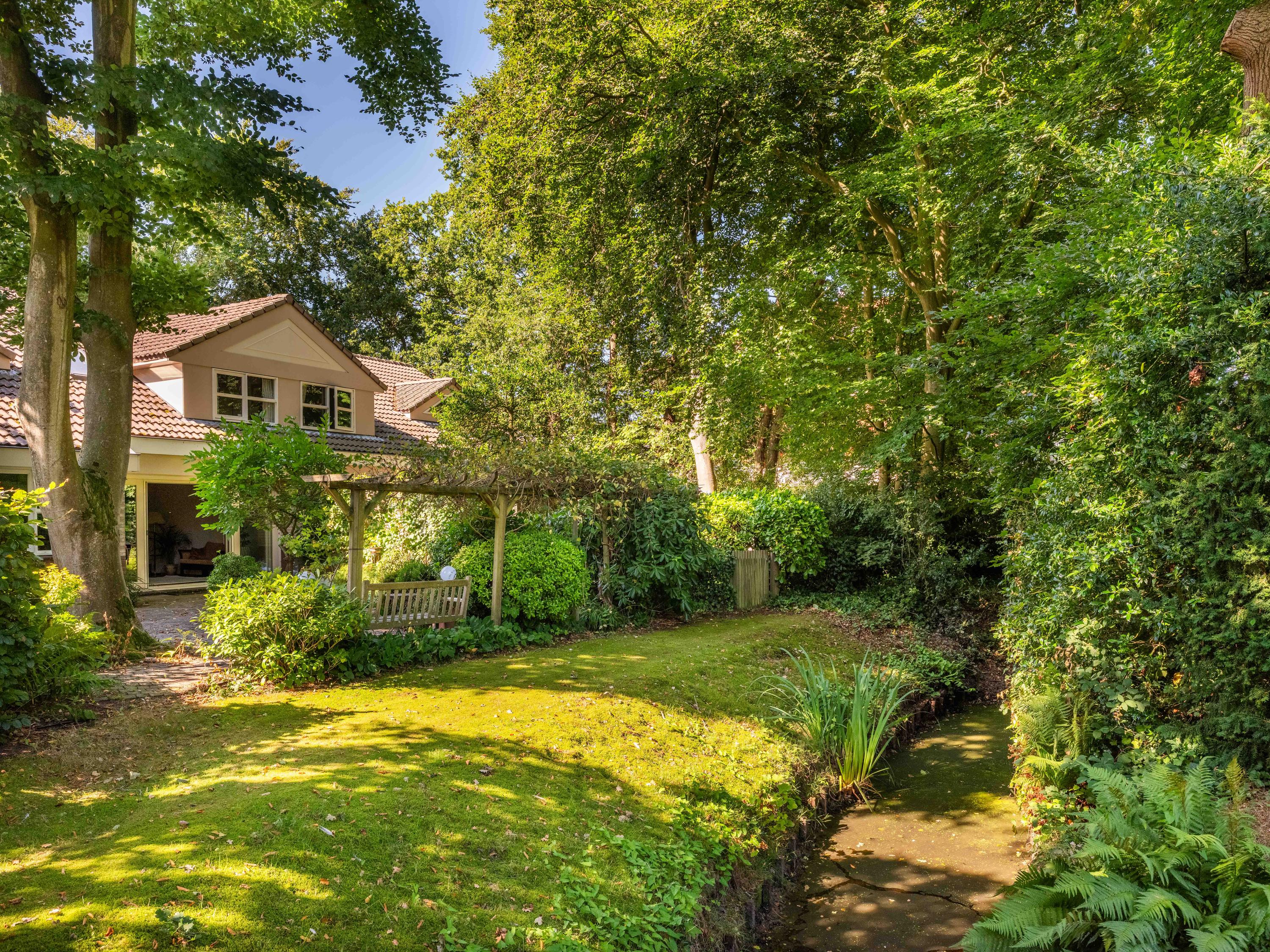 Through the large sliding doors, you step into the sunny, sheltered backyard, a wonderful place to enjoy peace and privacy, with a terrace and a view of the pond. The beautifully landscaped, sunny garden is an oasis of peace and privacy. The terrace borders the exclusive, communal park with ponds – a unique place where you can enjoy nature to the fullest. The park is exclusively accessible to local residents.