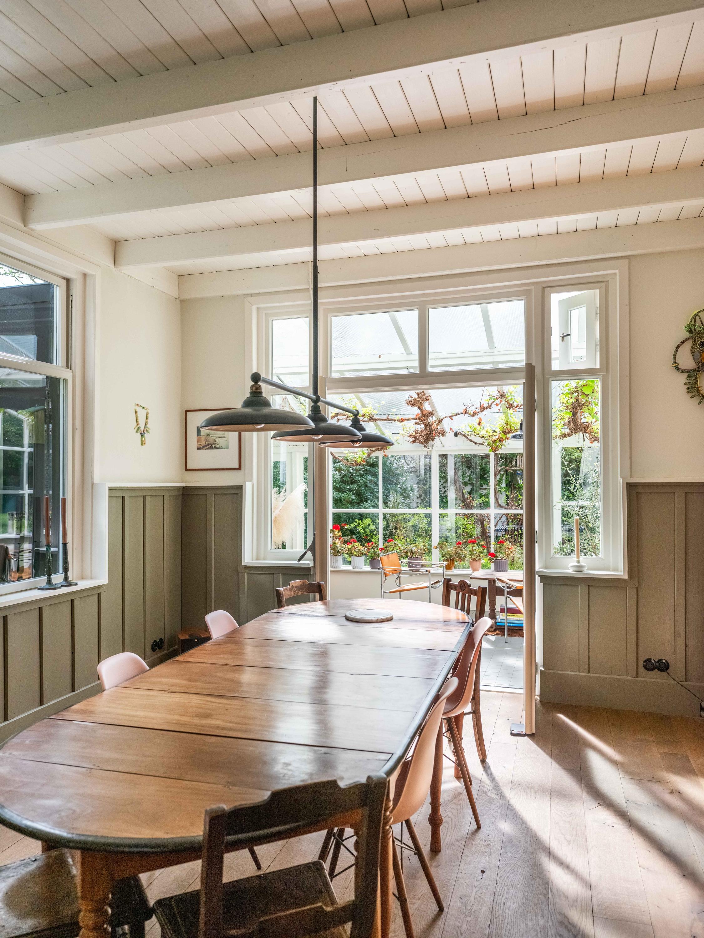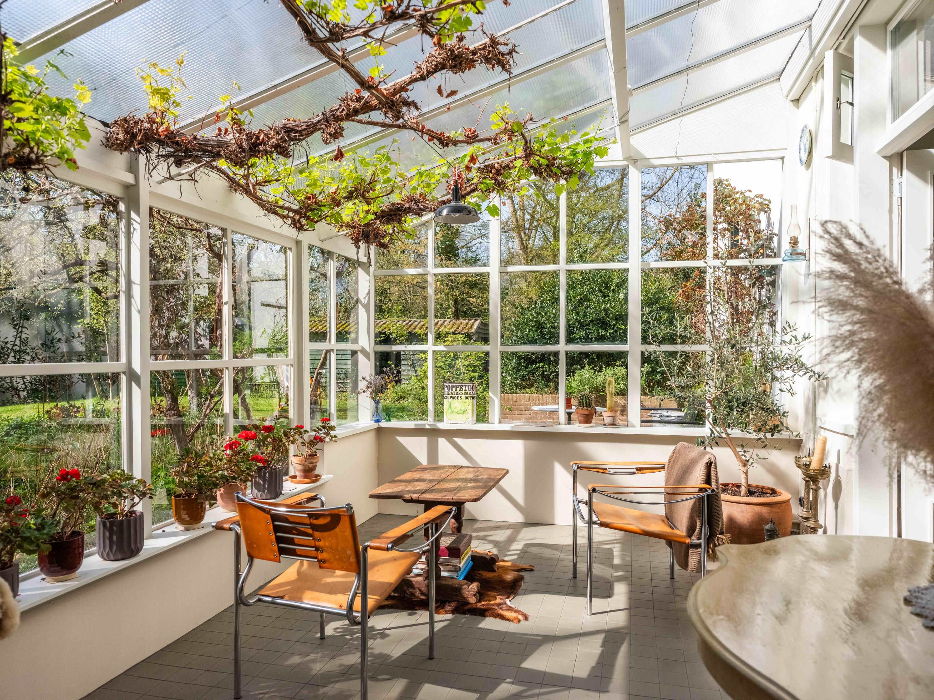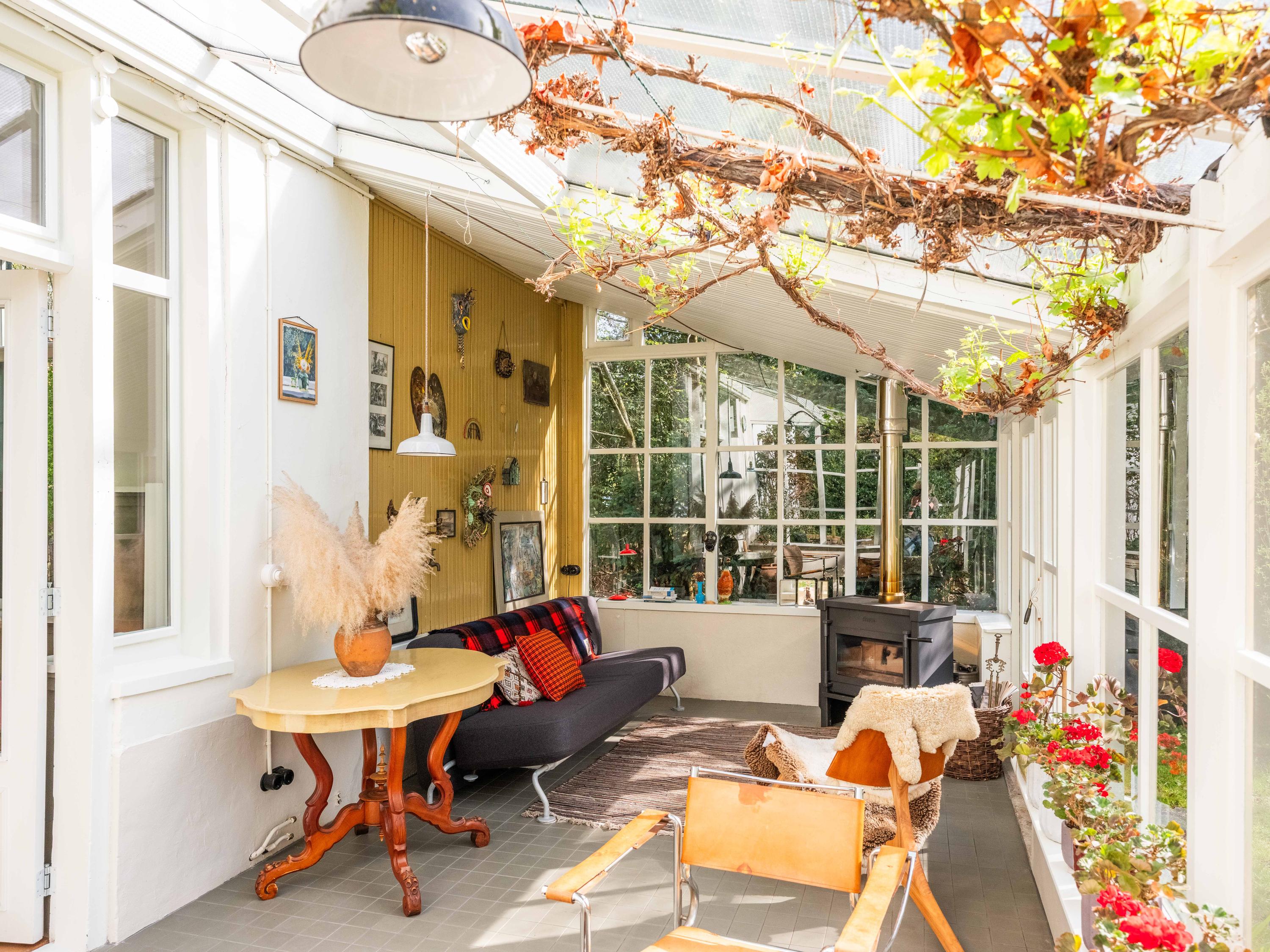 Inside, the property is equipped with every modern convenience. We enter the beautiful hall with a light-filled staircase. From here, we enter the study and the cosy, spacious living room with its characteristic fireplace. Another eye-catcher is the beautiful panelling, which has been restored to its original state, perfectly harmonising with the original interior. The sunny conservatory, where grapes grow, radiates natural warmth into the spacious living room. Here you can relax and enjoy yourself as soon as the sun makes even the slightest appearance. Or perhaps light the fire, curl up on the sofa with a blanket – can you picture it? The bespoke kitchen with its fine appliances is the perfect place to cook up a storm. From here, there is also access to the garden.