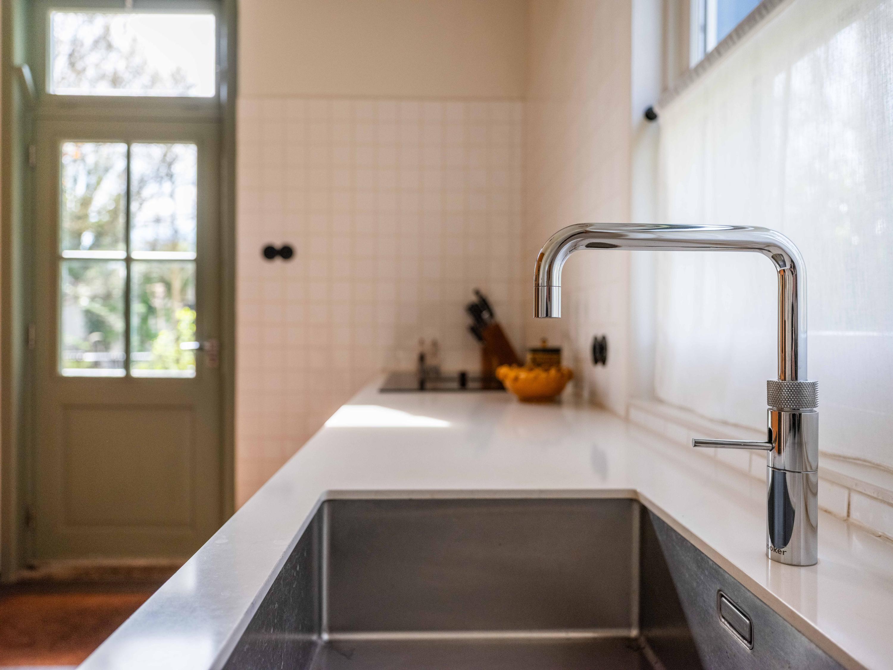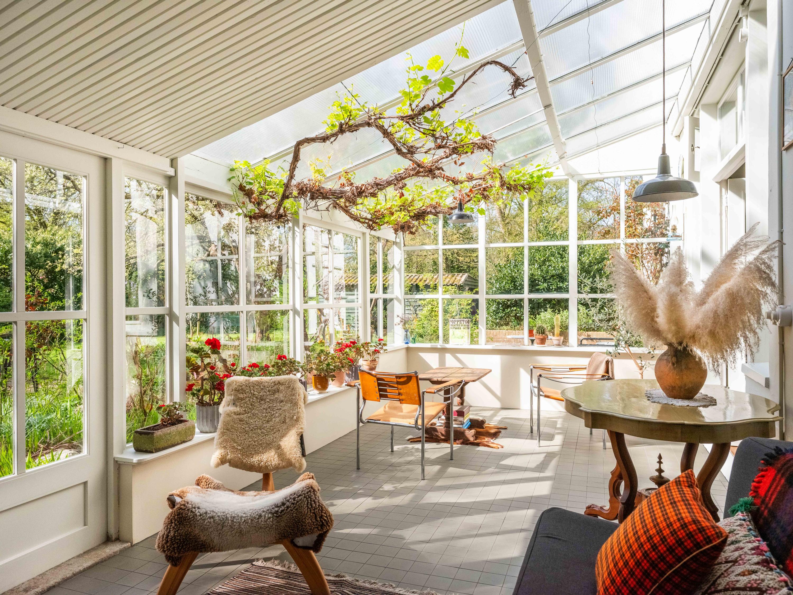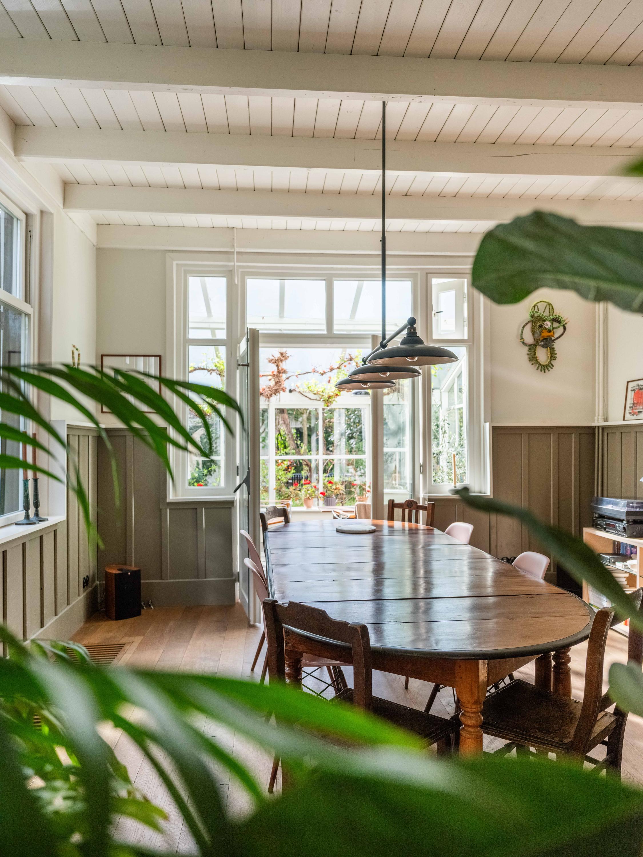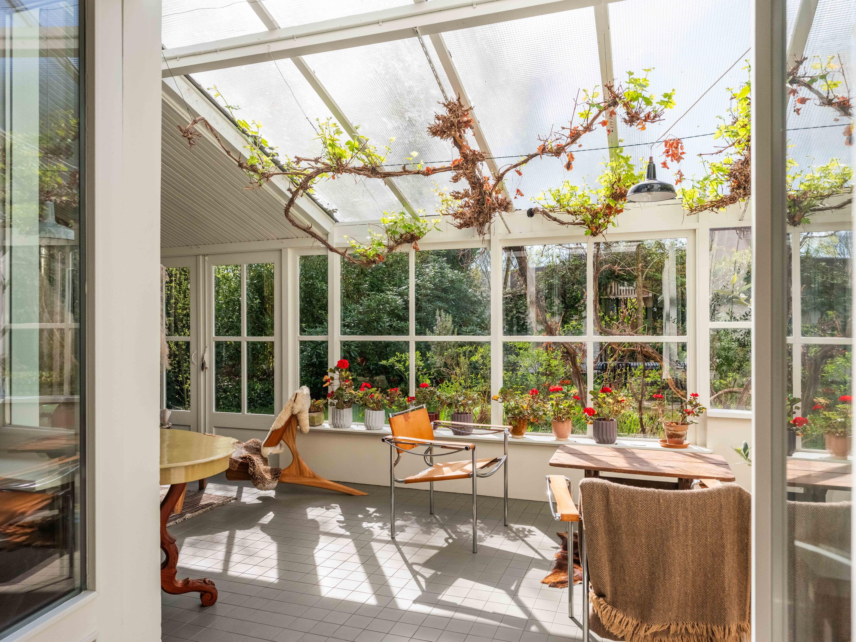 Inside, the property is equipped with every modern convenience. We enter the beautiful hall with a light-filled staircase. From here, we enter the study and the cosy, spacious living room with its characteristic fireplace. Another eye-catcher is the beautiful panelling, which has been restored to its original state, perfectly harmonising with the original interior. The sunny conservatory, where grapes grow, radiates natural warmth into the spacious living room. Here you can relax and enjoy yourself as soon as the sun makes even the slightest appearance. Or perhaps light the fire, curl up on the sofa with a blanket – can you picture it? The bespoke kitchen with its fine appliances is the perfect place to cook up a storm. From here, there is also access to the garden.