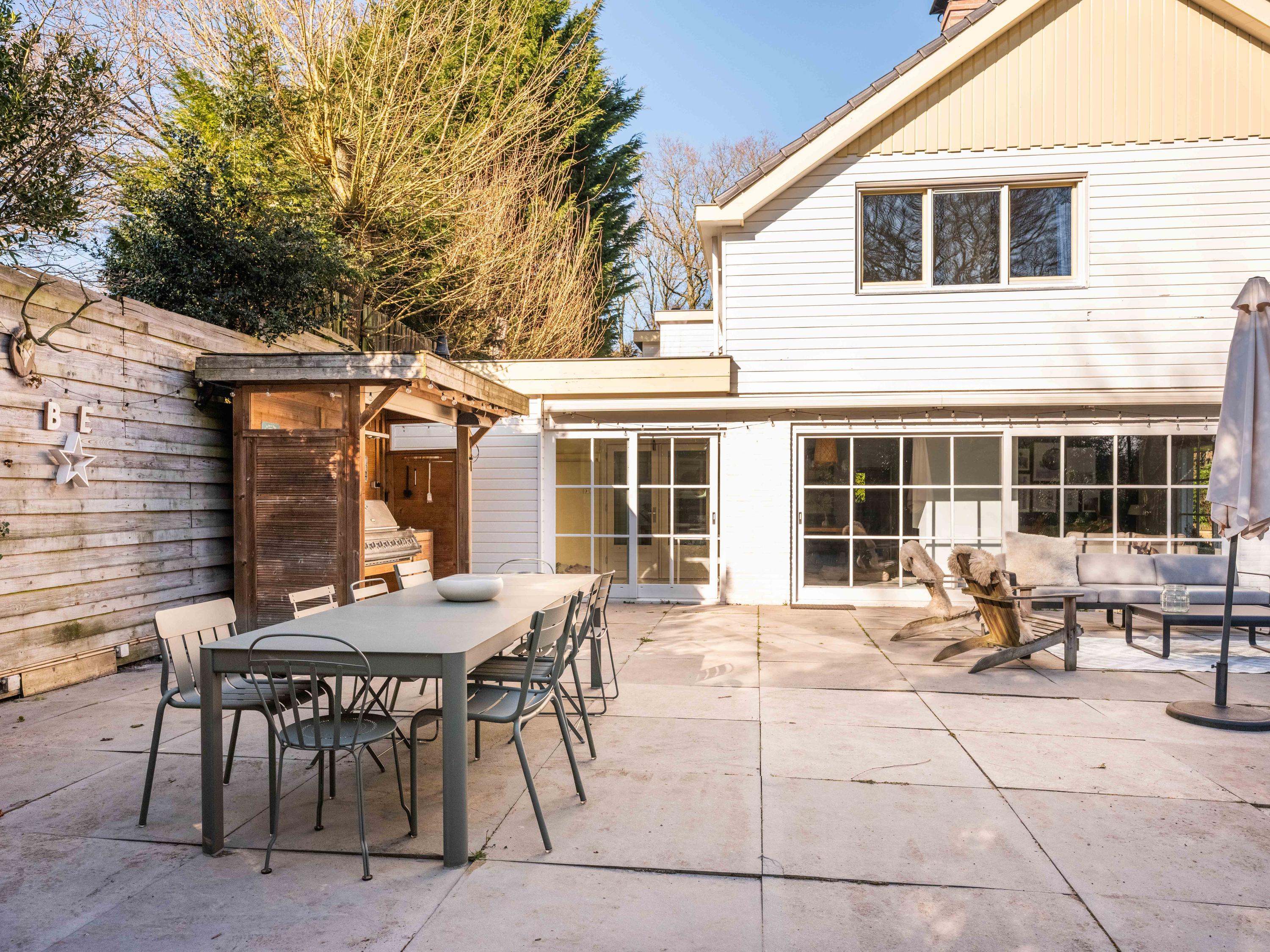 The house is surrounded by a lovely garden, completely enclosed by newly installed fencing. In the garden we find a sauna, outdoor kitchen and a barbecue connected to the gas mains. The double garage has electric doors and there is also a separate room for bicycles and garden equipment. In front of the garage there is room to park several cars.