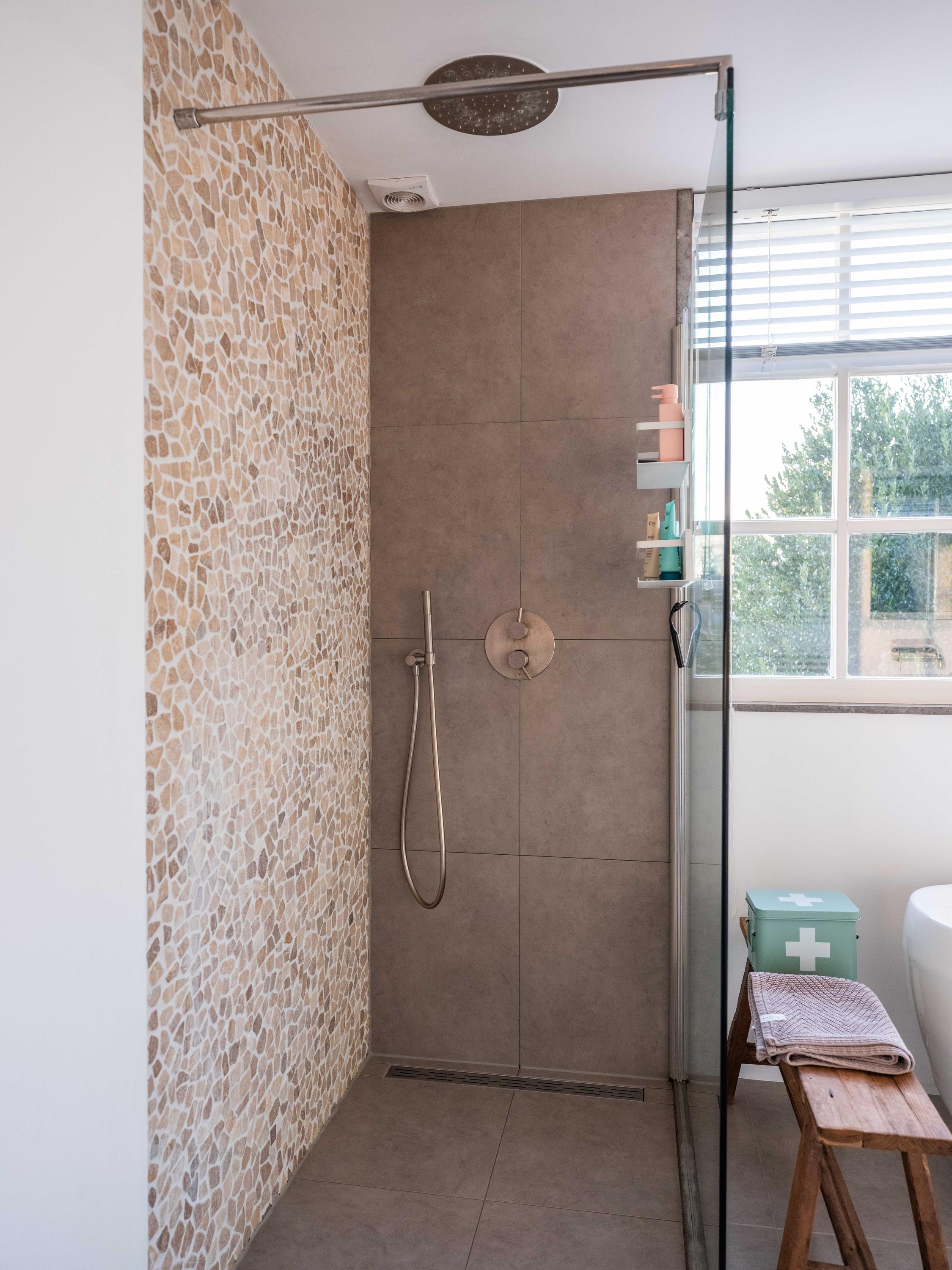 The first floor offers three well-sized bedrooms, each with its own atmosphere and fitted with custom wardrobes. The luxurious bathroom is stylishly finished with natural materials, and here too, quality and tranquility have been chosen. Throughout the house, it is clear that care and taste have been taken to create a harmonious whole.