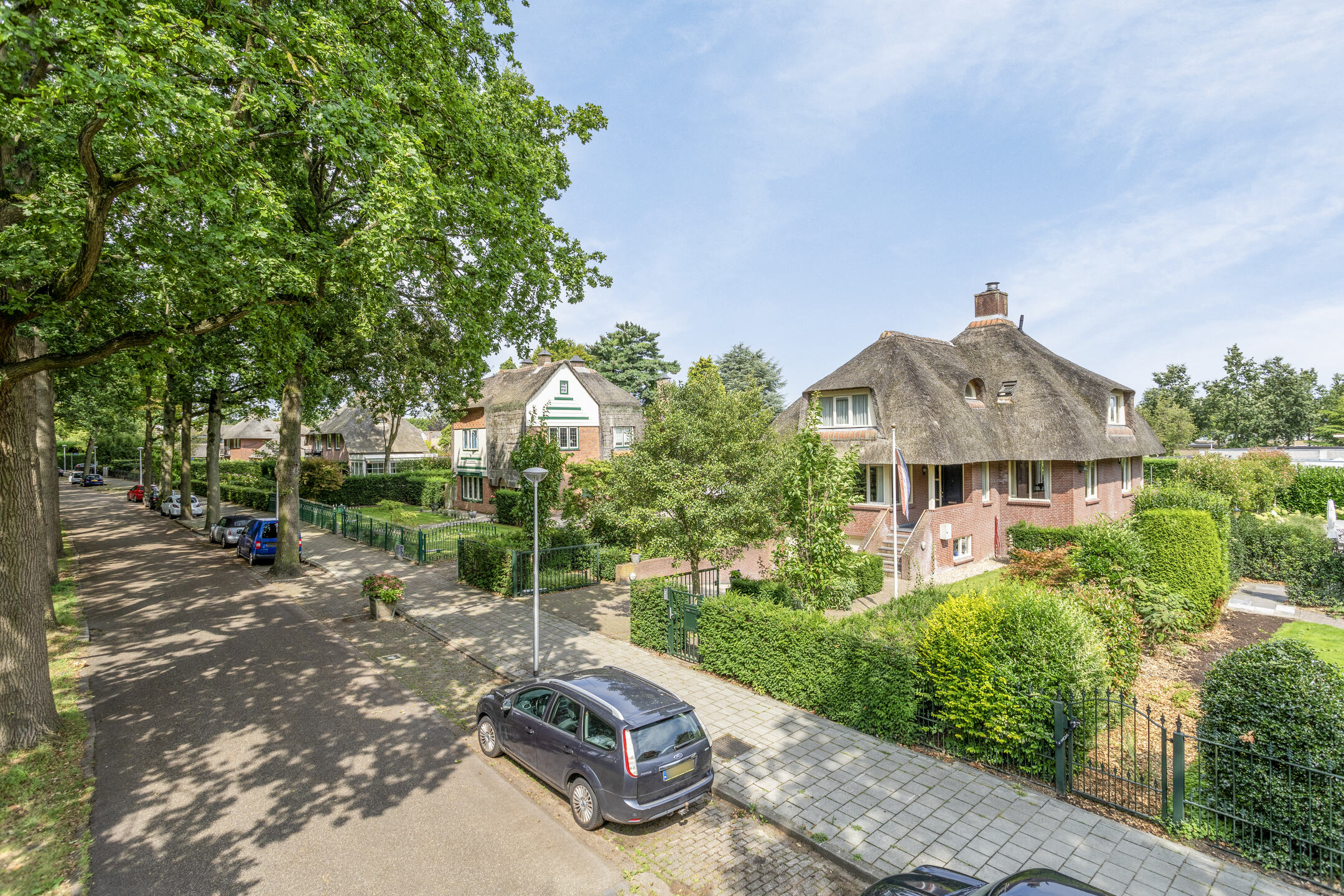 The architecture nods to the elegance of the 1930s with a distinctive thatched roof, enhancing its visual appeal. Within, solid oak flooring, smooth stucco finishes, and carefully considered spatial flow create a refined atmosphere. The expansive living and dining areas connect seamlessly to a landscaped garden and an inviting terrace, both designed for privacy and relaxation. A flexible ground floor office, five bedrooms, and a full basement with garage, wine cellar, and additional work or fitness rooms cater to diverse living and working needs.