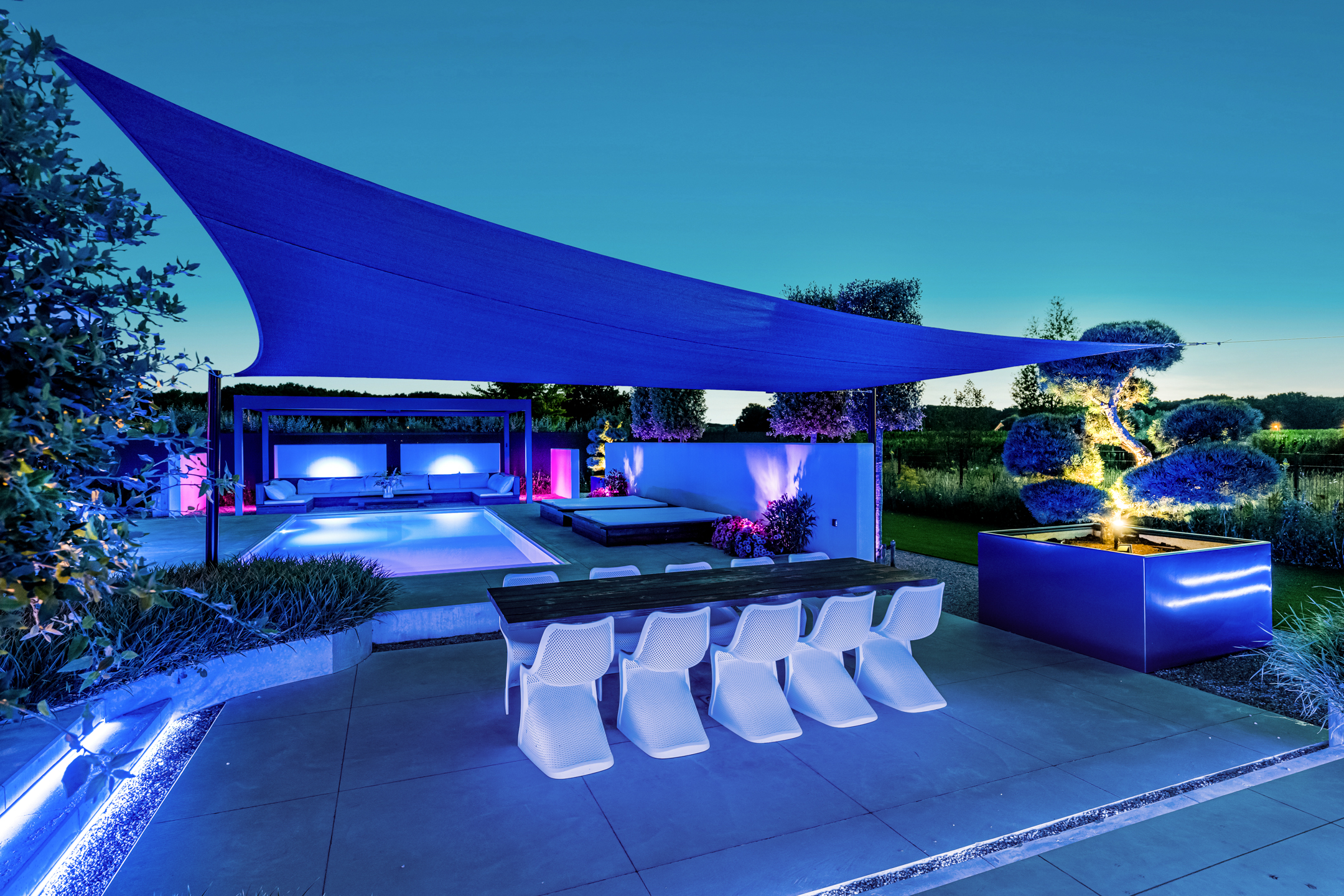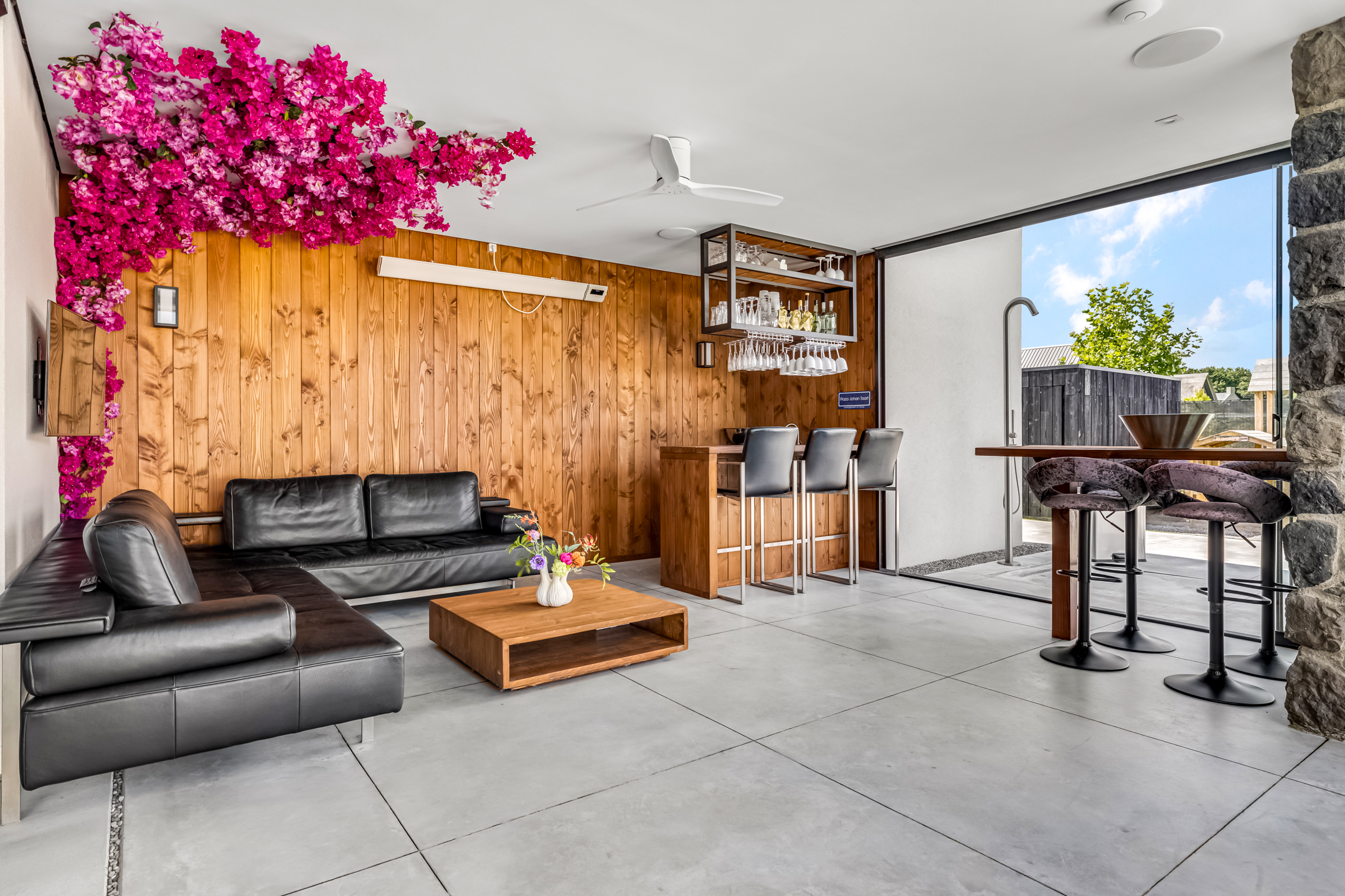 Approx. 26 m², with lighting, automatic louvered roof, and custom hardwood lounge bench.