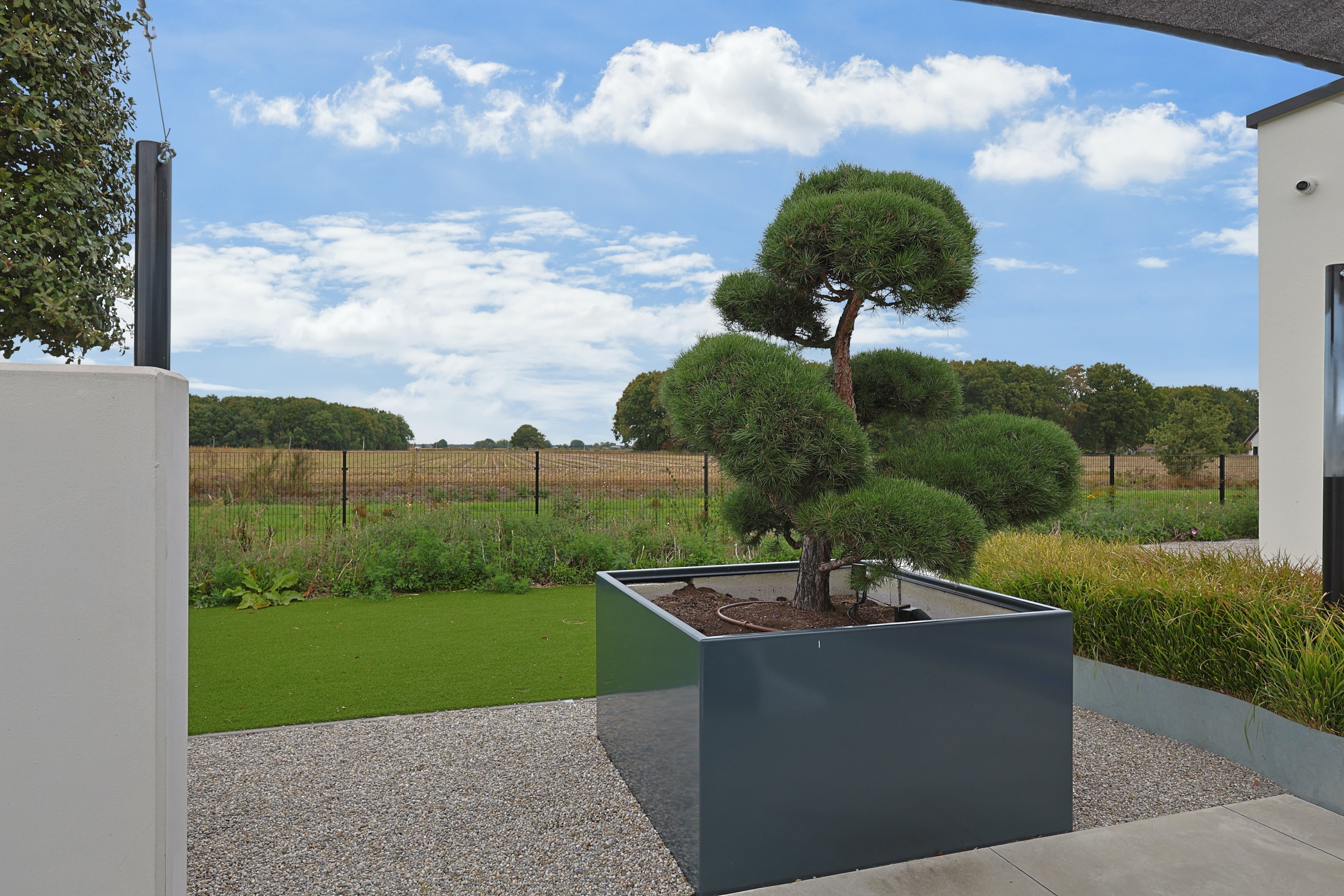 Architect-designed southwest-facing backyard with unobstructed views of paddocks at the back and farmland to the side.