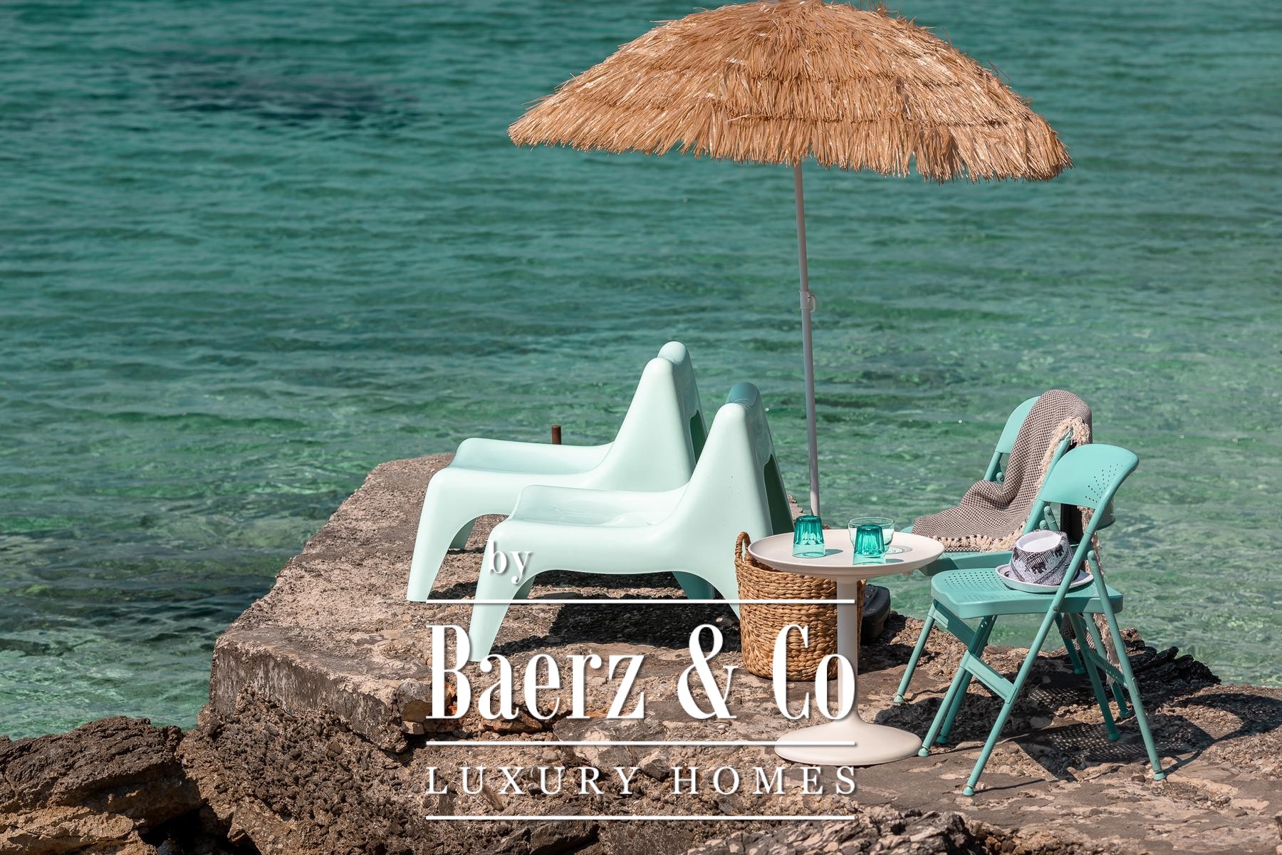 Upstairs, two more autonomous apartments welcome guests with separate entrances. Each features sliding doors to private terraces or a loggia with sweeping sea vistas, kitchens open to living spaces, and tranquil bathrooms, with one as a full studio and the other as a one-bedroom retreat.