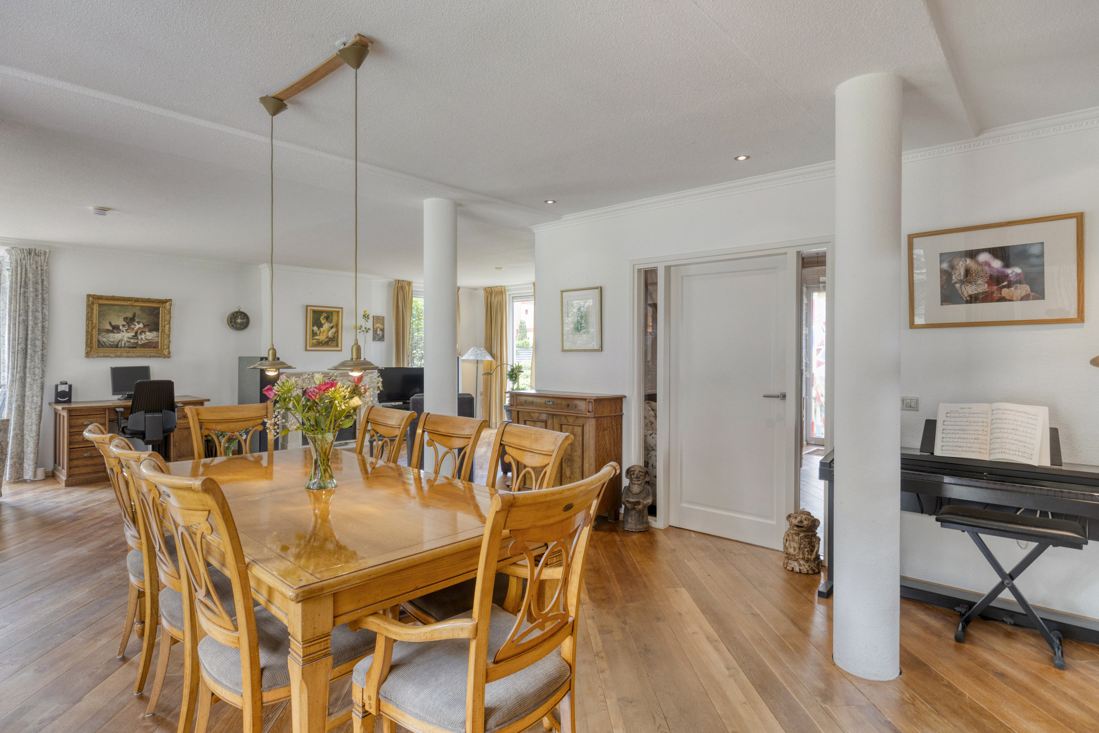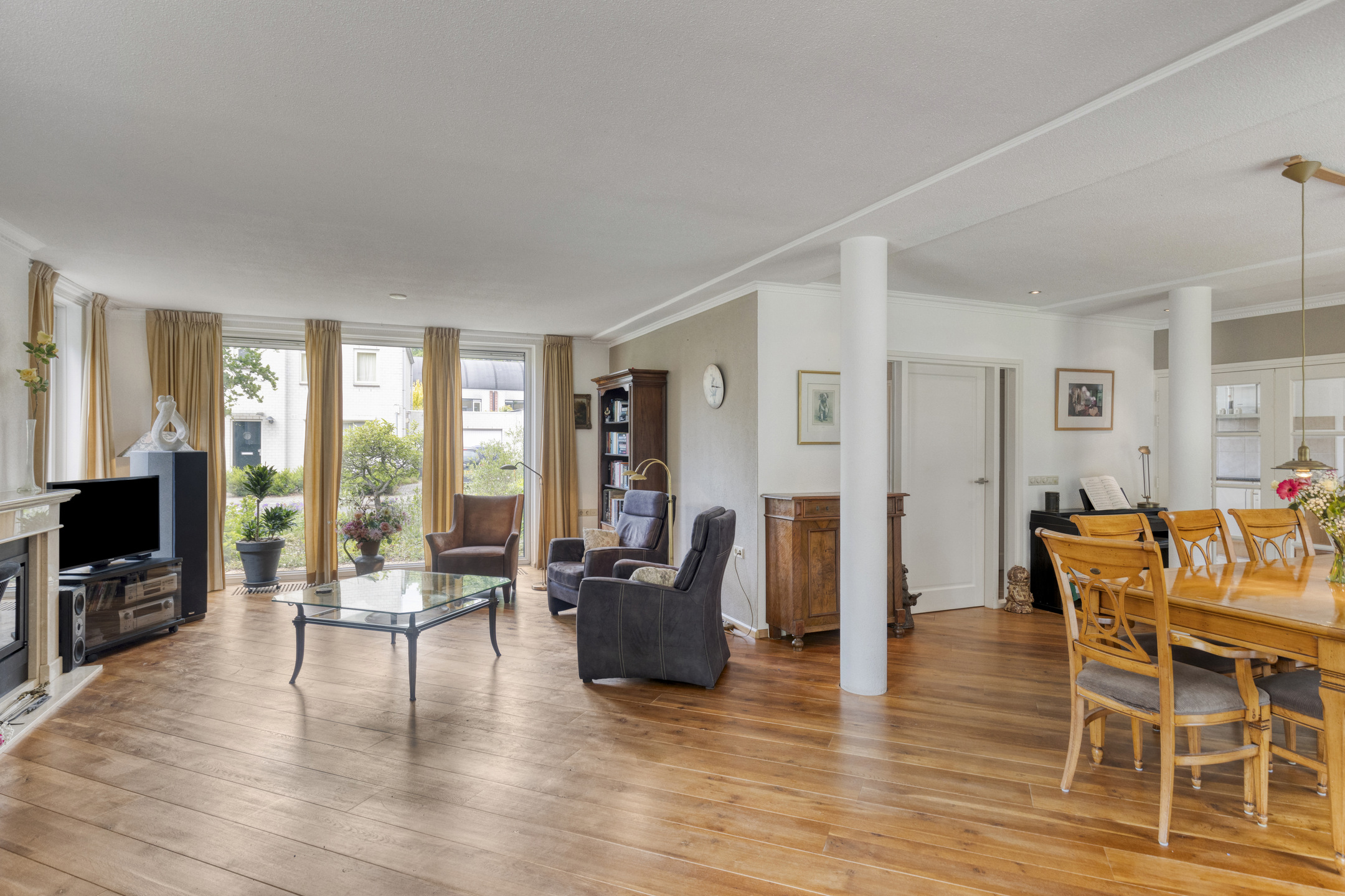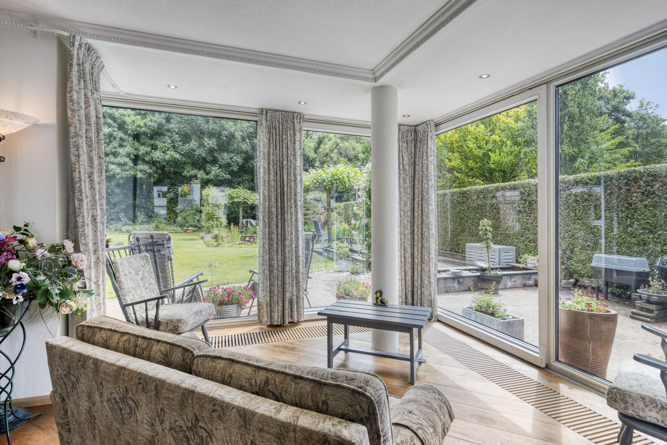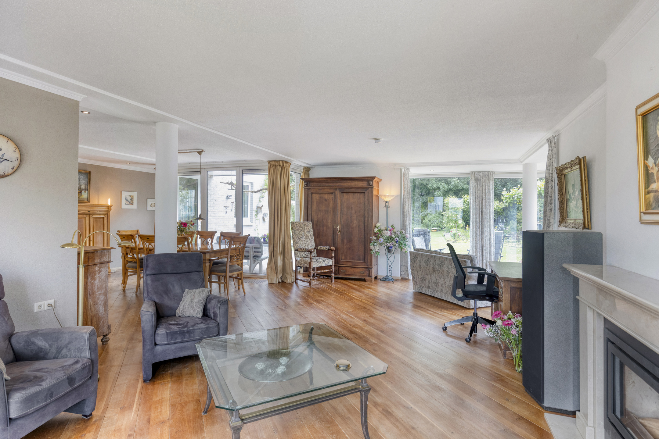 The spacious, L-shaped living room is nice and sunny due to large windows in front, back and side, and in the sitting area there is a beautiful fireplace with wood stove. In the right corner of the room is a garden room with sliding glass doors, allowing one to blend outside and inside when the weather is nice.