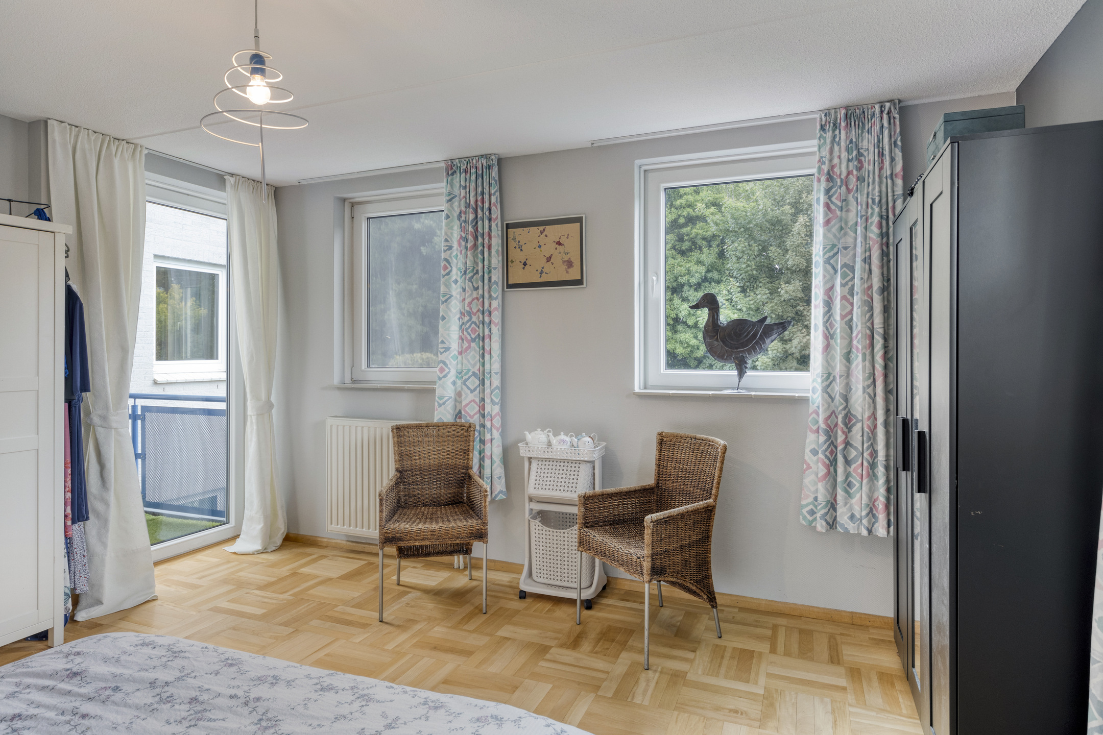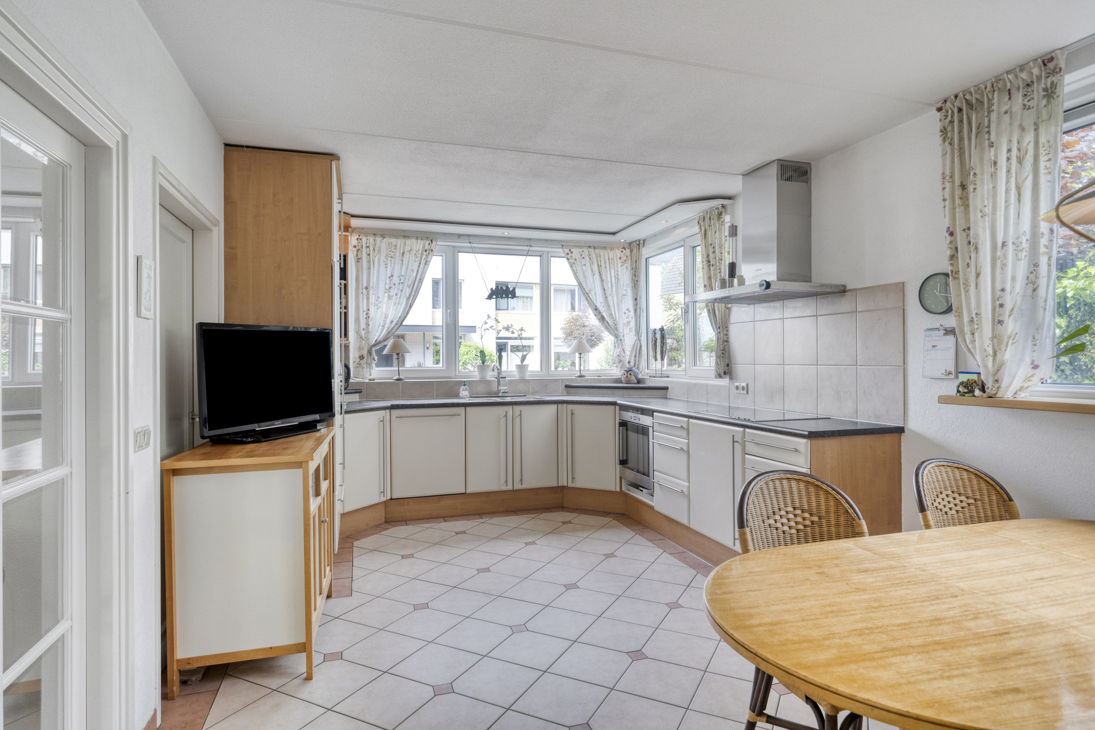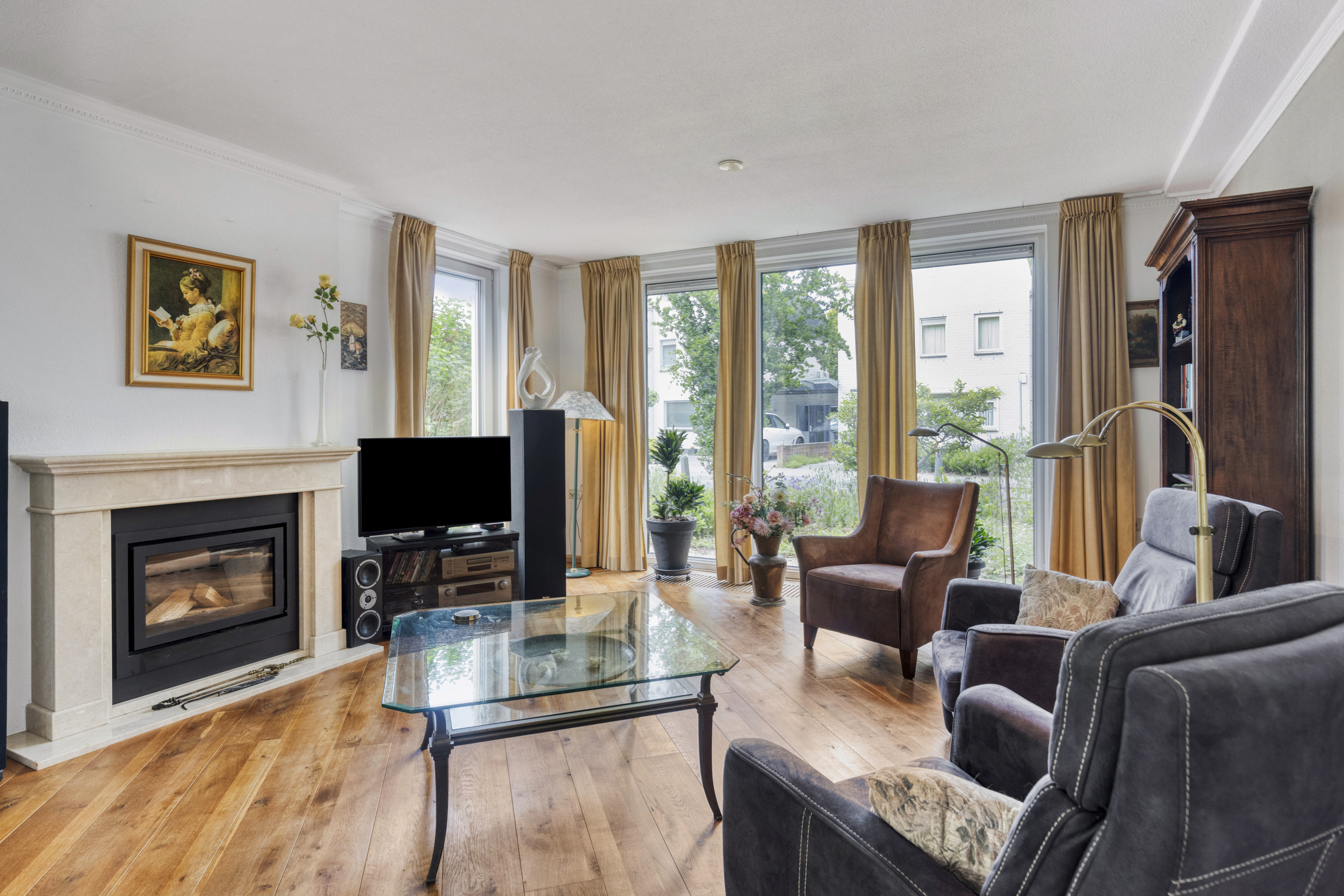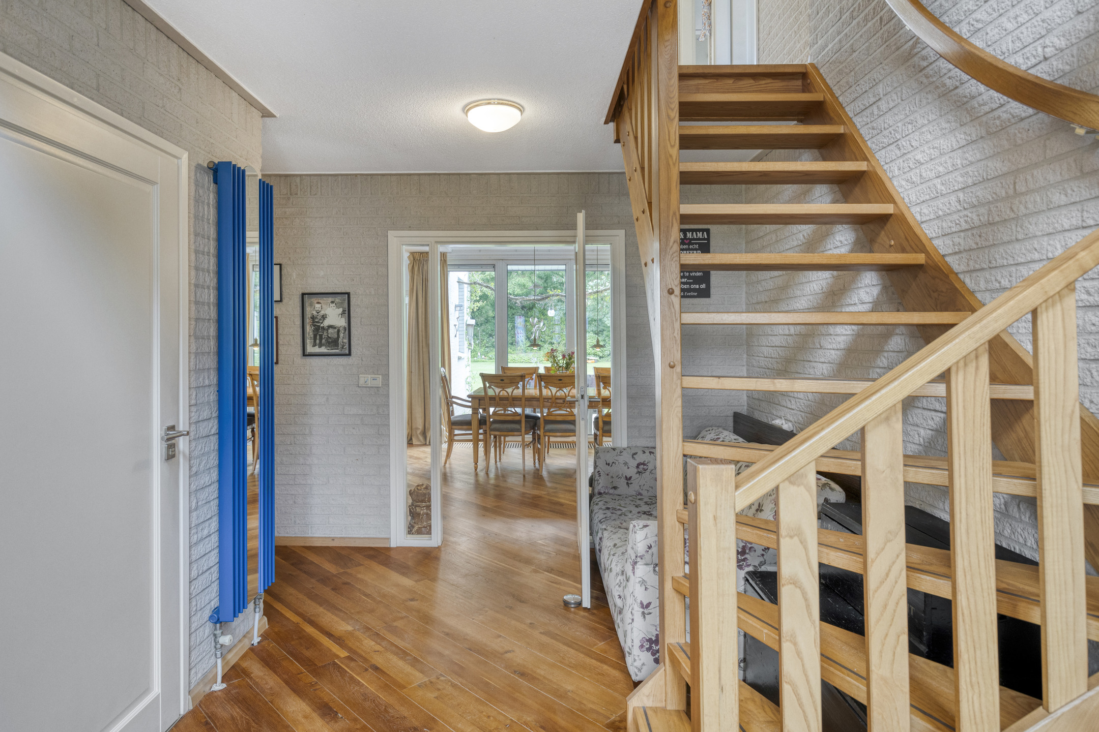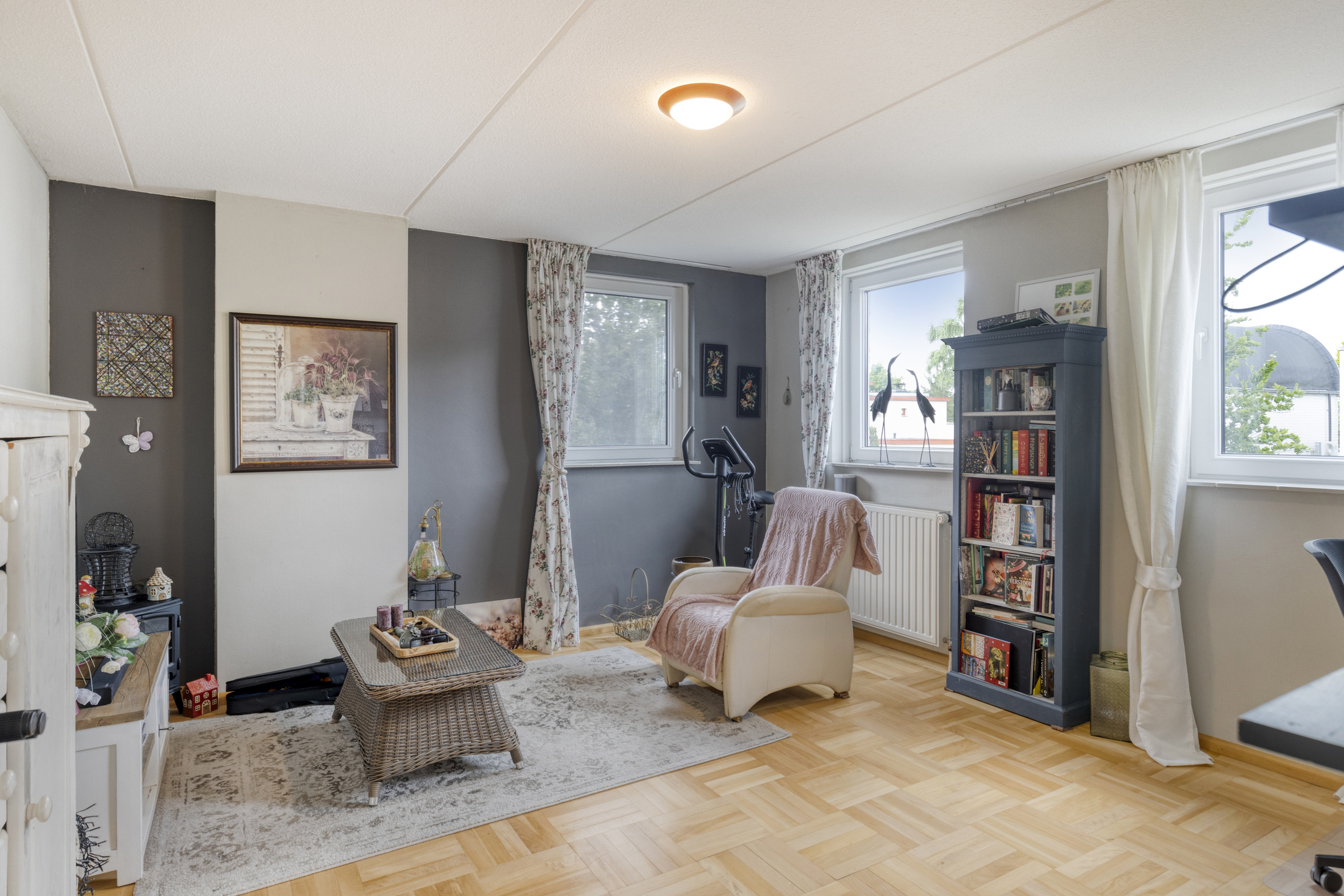 The spacious, L-shaped living room is nice and sunny due to large windows in front, back and side, and in the sitting area there is a beautiful fireplace with wood stove. In the right corner of the room is a garden room with sliding glass doors, allowing one to blend outside and inside when the weather is nice.