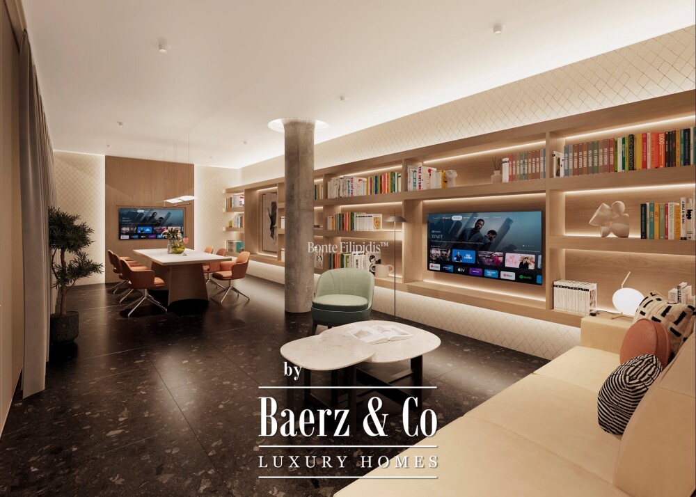 Natural materials define the interiors: herringbone wood flooring throughout the living spaces and bedrooms, custom carpentry, and an interplay of marble in kitchen and bathrooms. Communal areas extend this atmosphere with marble, wood and integrated lighting.