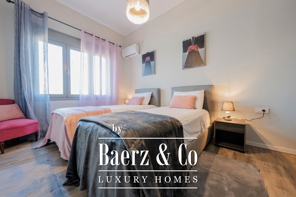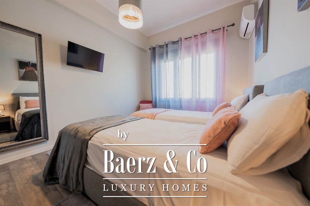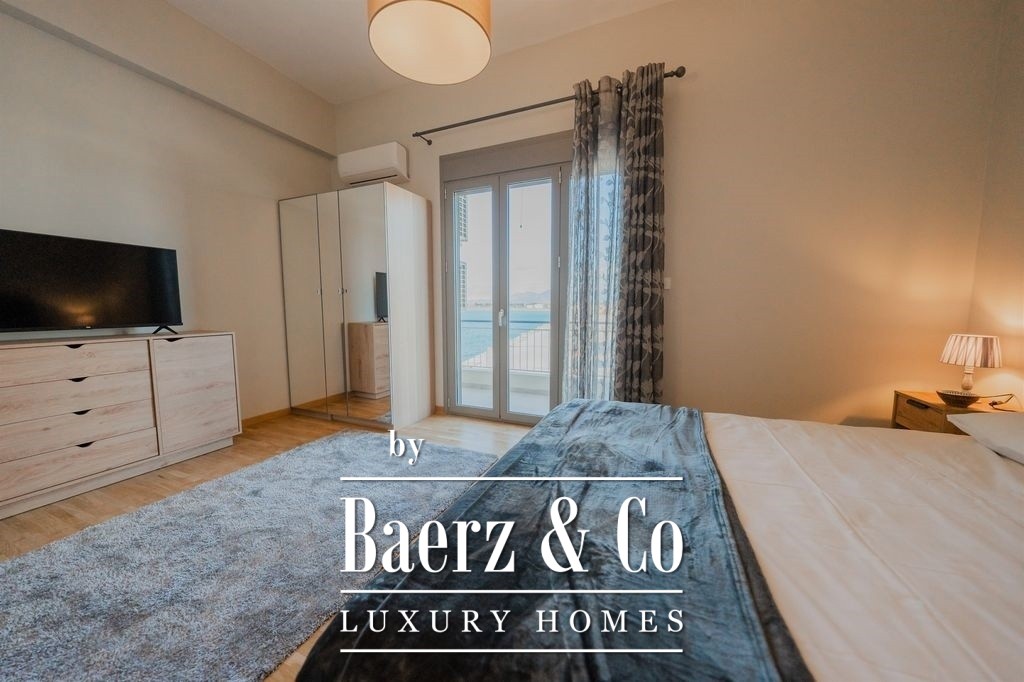 Thoughtfully renovated throughout, the apartment blends contemporary design with premium materials. The living and dining areas widen toward the waterfront balcony, inviting natural light and framing scenes of the Aegean and sunset each day. A separate, fully equipped kitchen serves both privacy and function, while each of the three bedrooms is fitted with generous wardrobes and a secure safe. Two bathrooms are designed for comfort and clarity, their modern finishes quietly reinforcing the sense of quality.