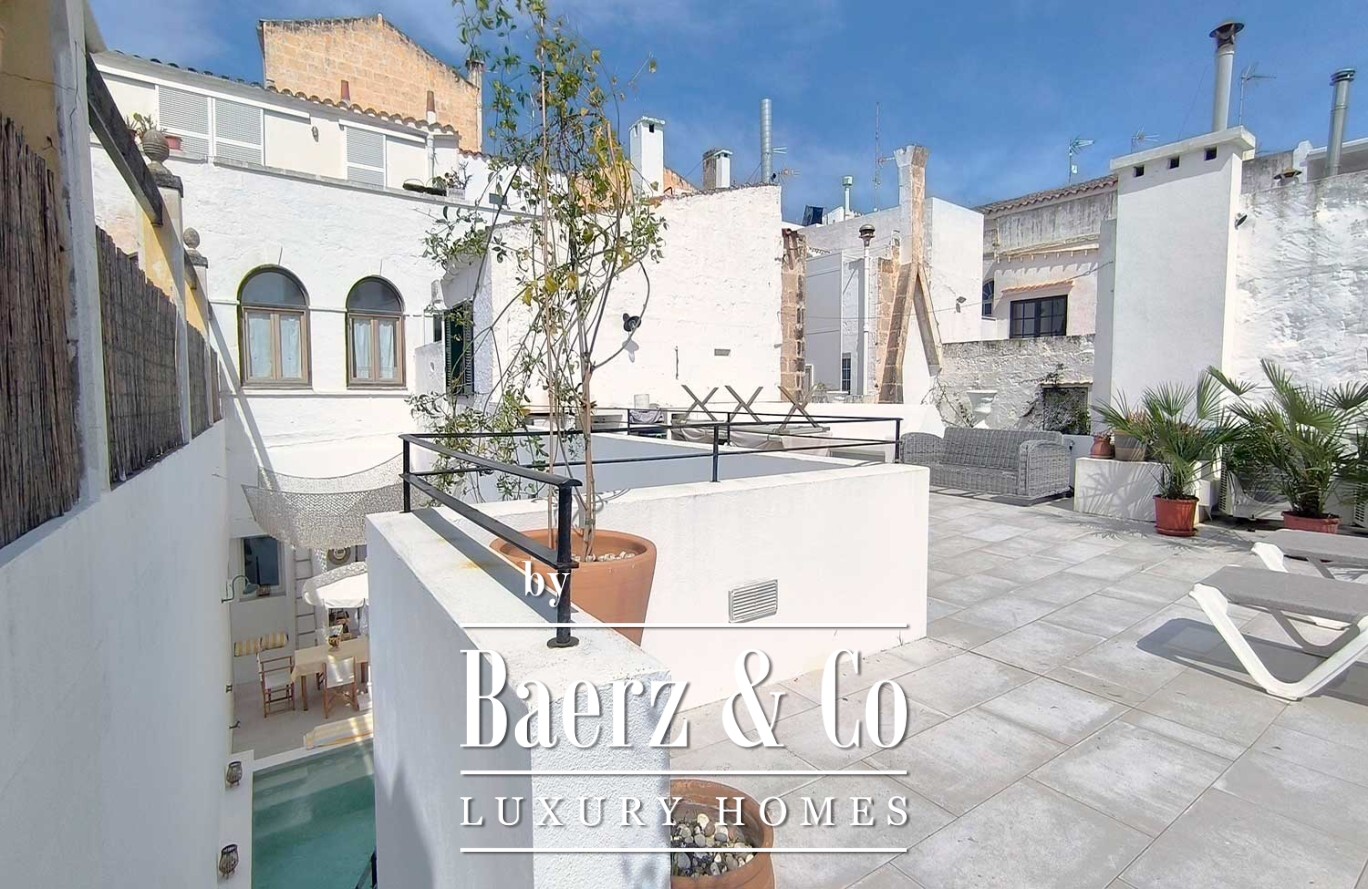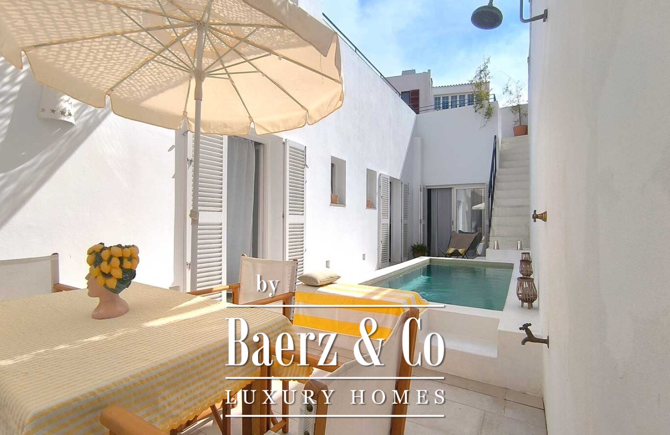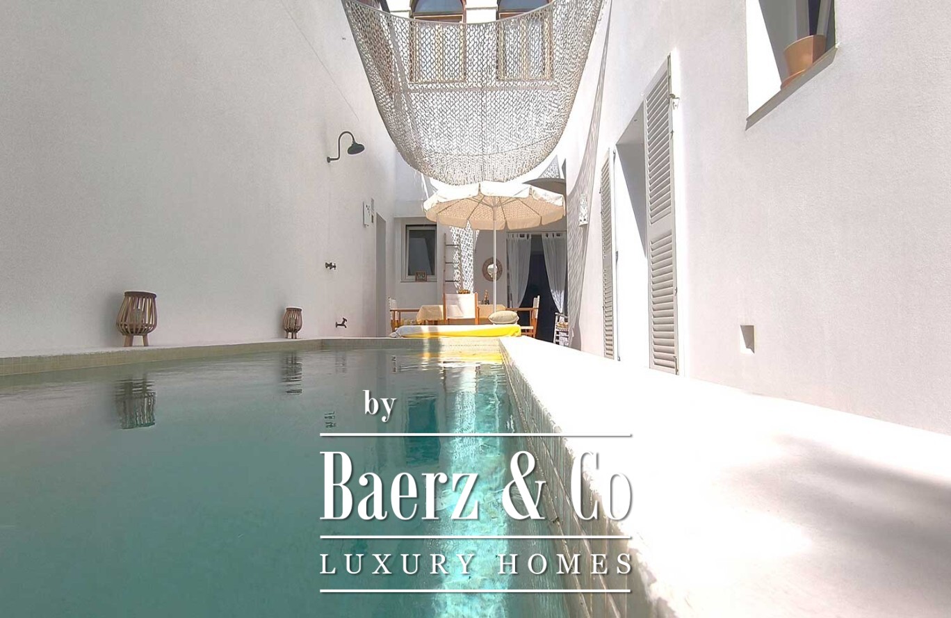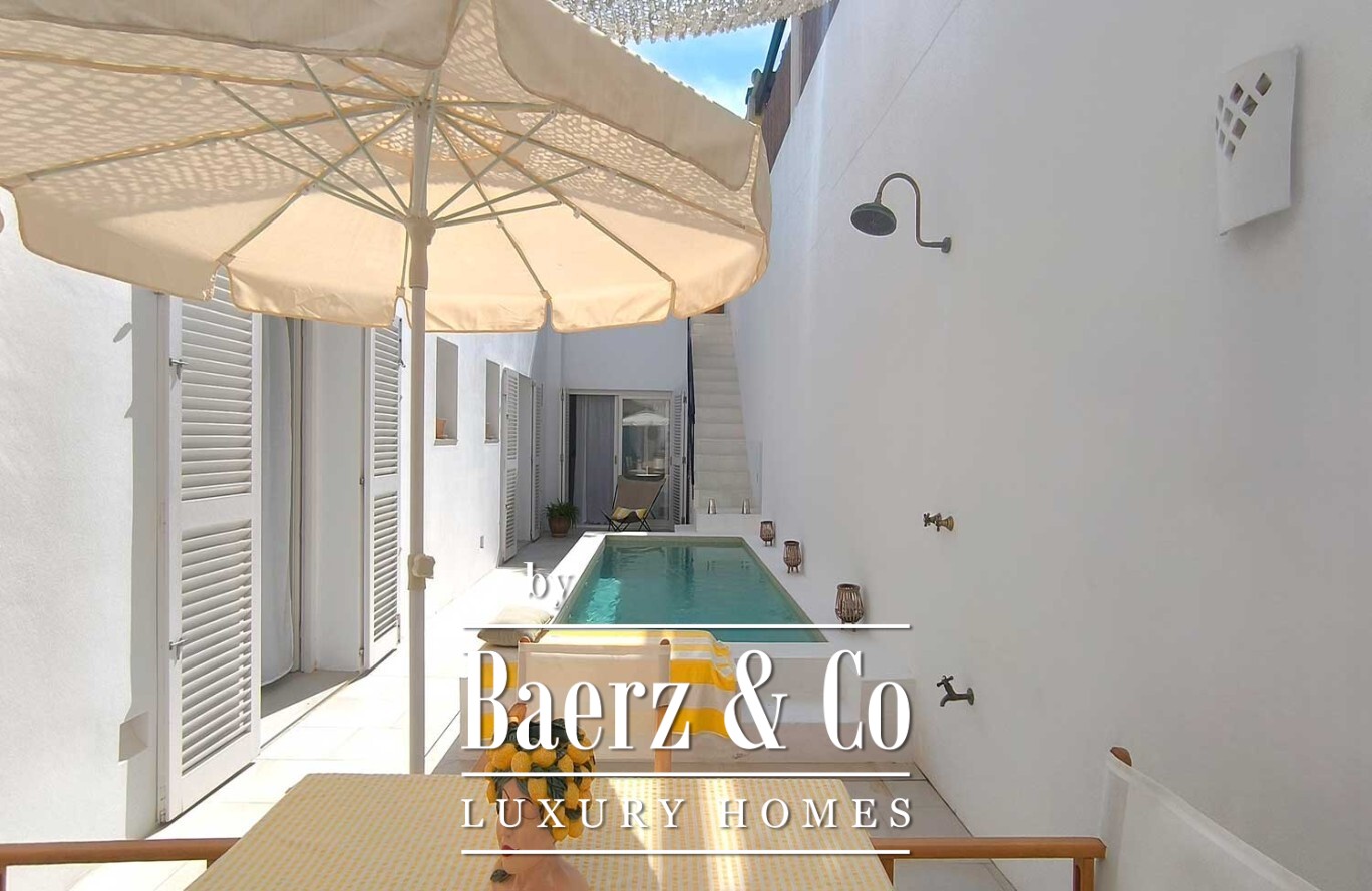 A corridor leads to the sleeping wing, where three bedrooms each come with en-suite bathrooms and direct access outside, ensuring privacy and a consistent flow of natural light. The heart of the property reveals a private patio, introducing an unexpected private pool—a genuine privilege in the old quarter. From here, an upper terrace with a built-in bench and outdoor kitchen-barbecue area is designed for shared moments that linger.