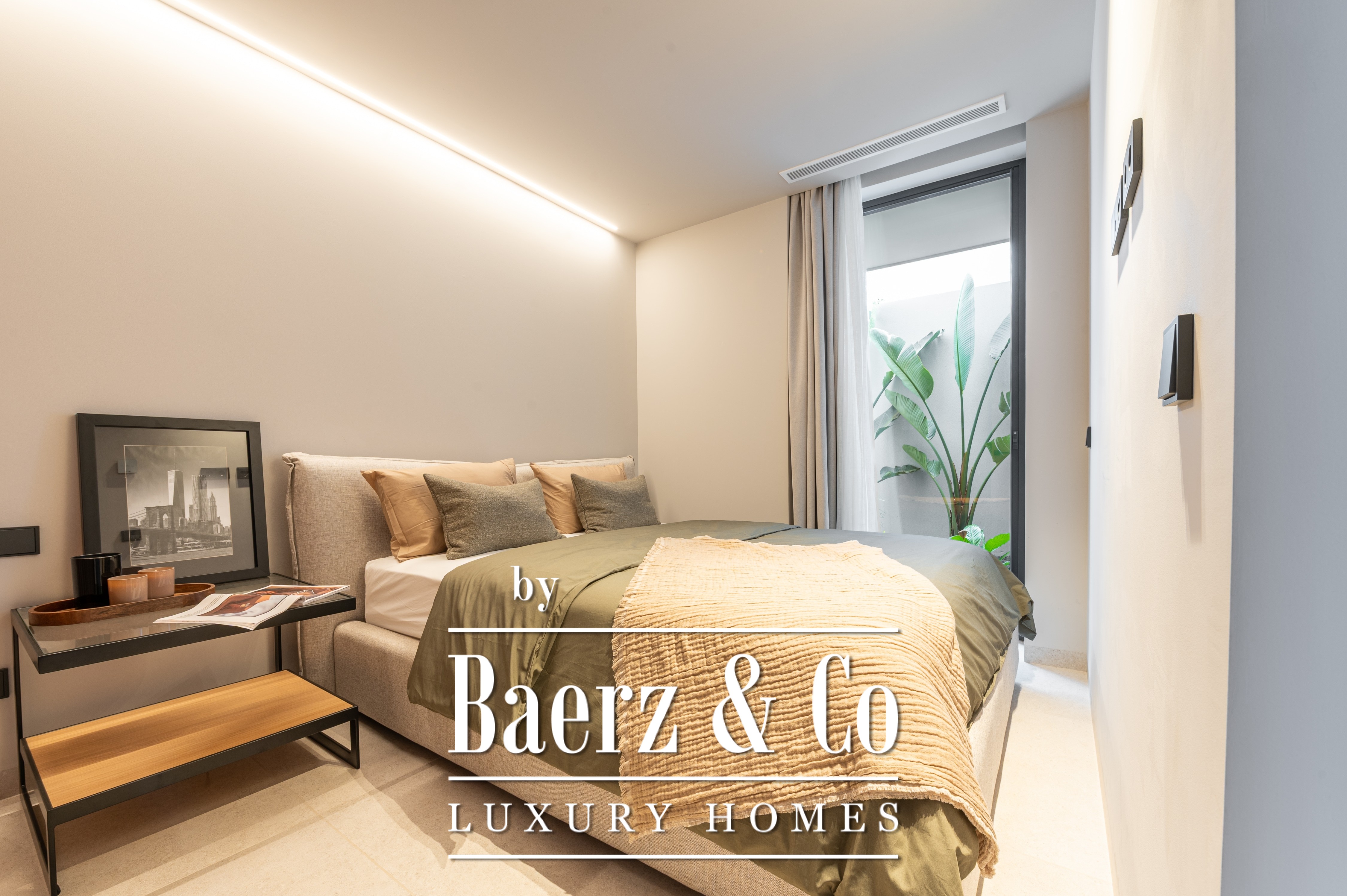 The equipped kitchen showcases top brand appliances, complemented by energy-efficient climate systems and sustainable charging points for vehicles and bicycles. A private garage accommodates two cars and a spacious storage room provides day-to-day ease.