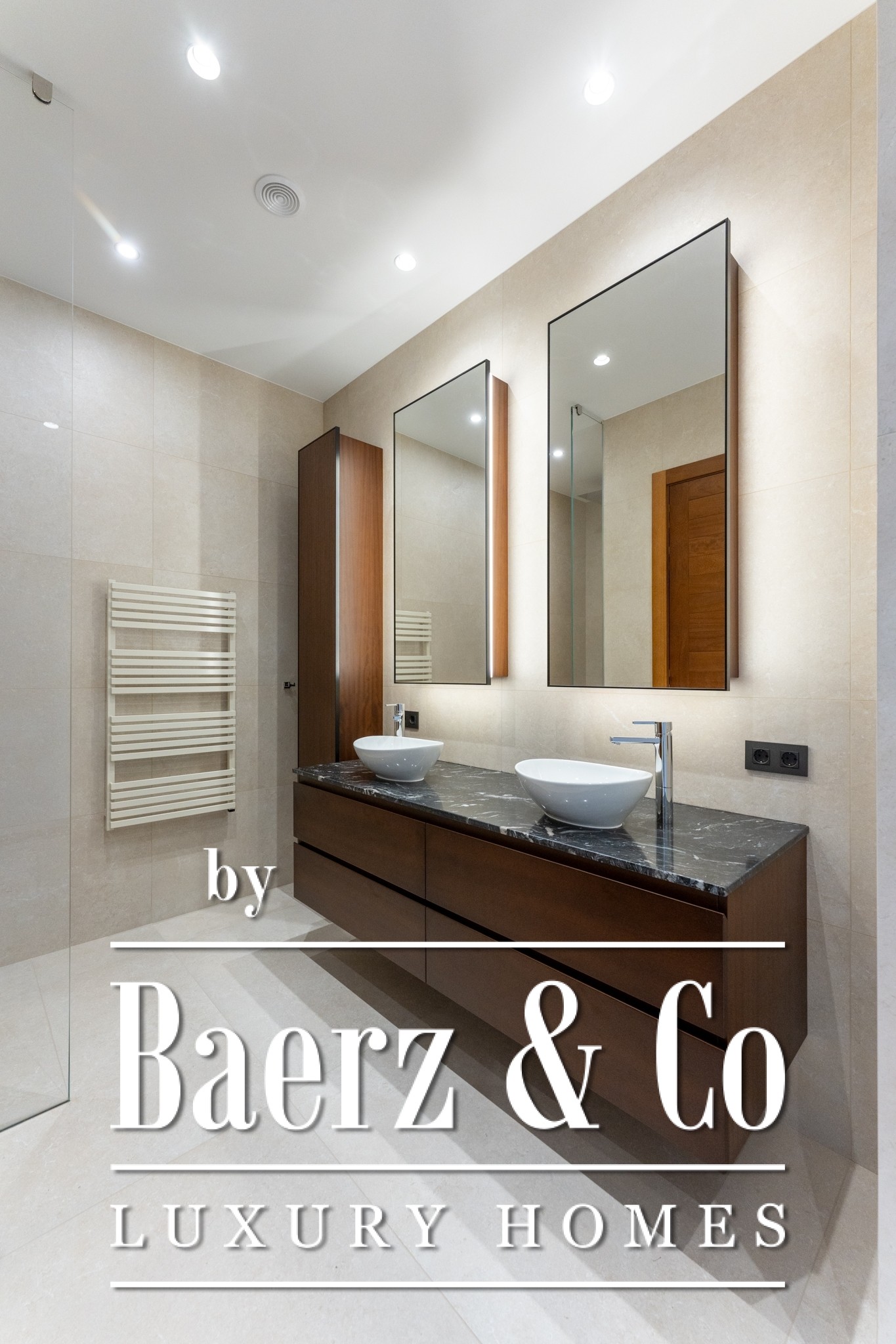 Inside, the living spaces are distinguished by calm spatial rhythms and high standards of craftsmanship. The ground floor integrates a bedroom, a convivial living area with a designer kitchen and bar, and seamless access to terraces tailored for effortless outdoor living. All four en-suite bedrooms are generously proportioned. Six bathrooms provide a refined touch, while a separate guest apartment complete with kitchen extends hospitality.