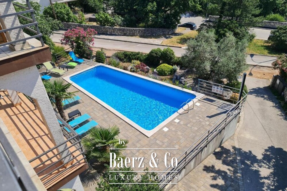 Apartment house Crikvenica offers a rare vantage point over the Adriatic, set on a landscaped 759 m² plot that commands sweeping sea vistas. This detached property encompasses 602 m² of living space across a ground floor, two upper levels and a high attic, quietly positioned just 500 metres from the coast.