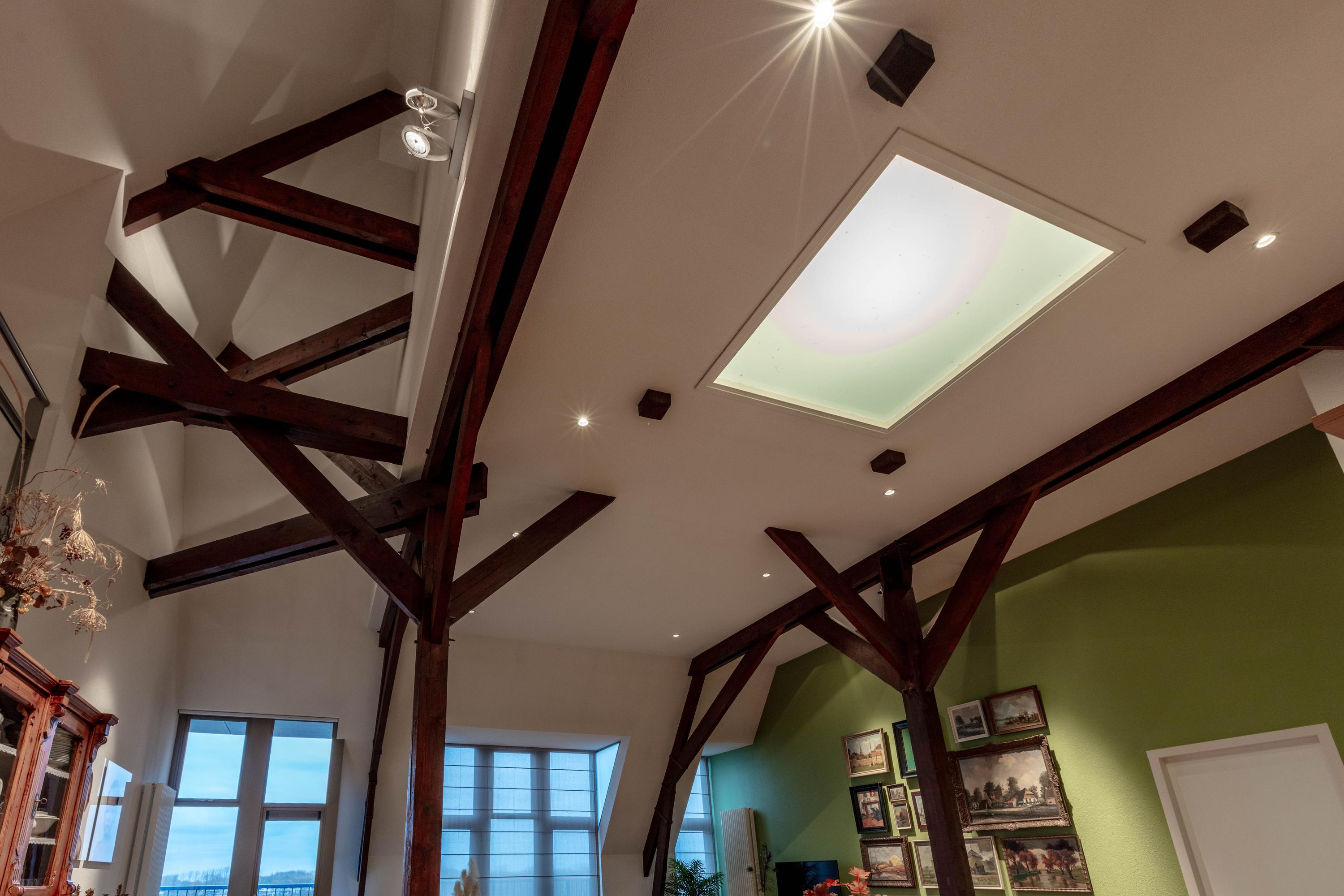 De bijzonder sfeervolle woonkamer is indrukwekkend door de unieke hoogte en fraaie zichtbare kapconstructie. De open keuken bevindt zich aan de achterzijde en beschikt over een kookeiland, volop kastruimte en diverse inbouwapparatuur. Vanuit de keuken is er prettig zicht op de woonkamer met een gezellig zitgedeelte en een apart eetgedeelte.