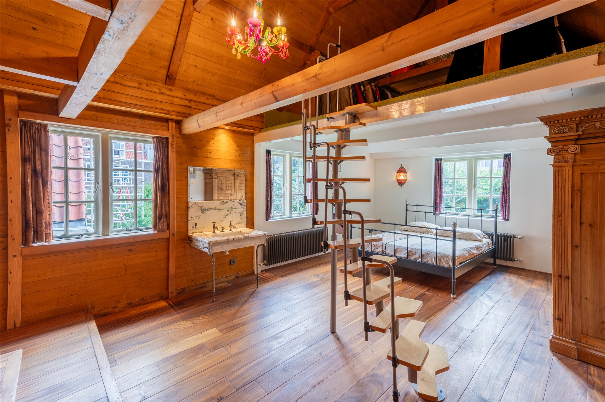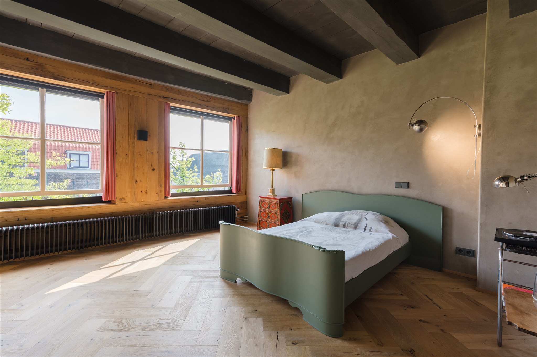 At the front: the grand living room with soaring four-metre ceilings, oak flooring, and a splendid view over the canal and the historic Armamentarium.