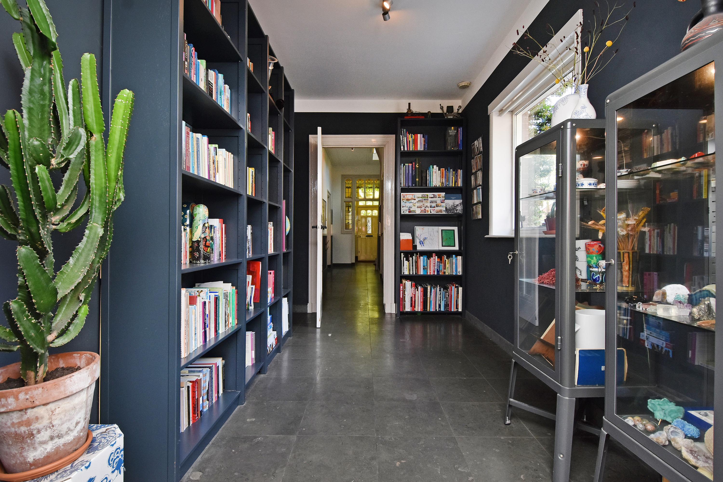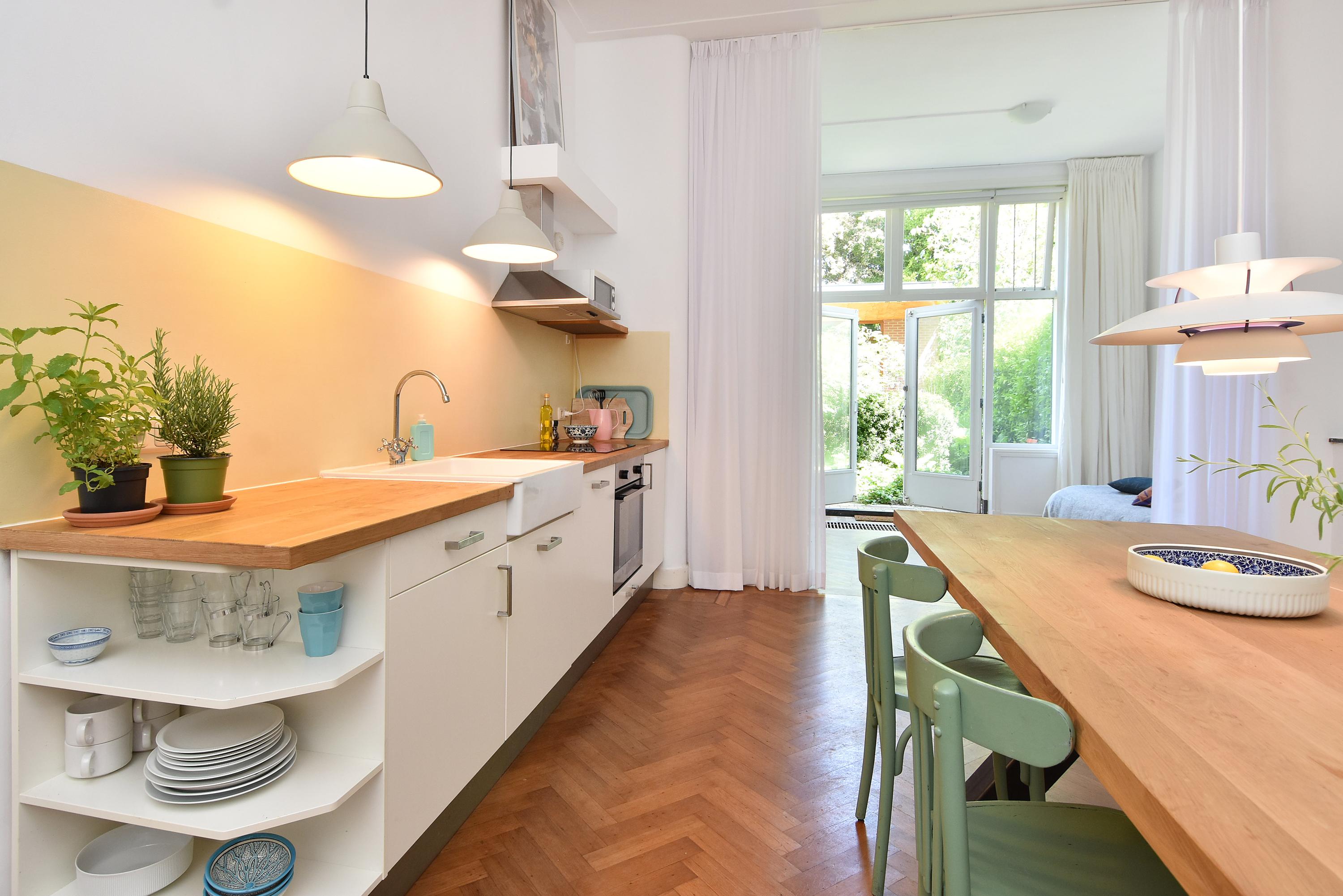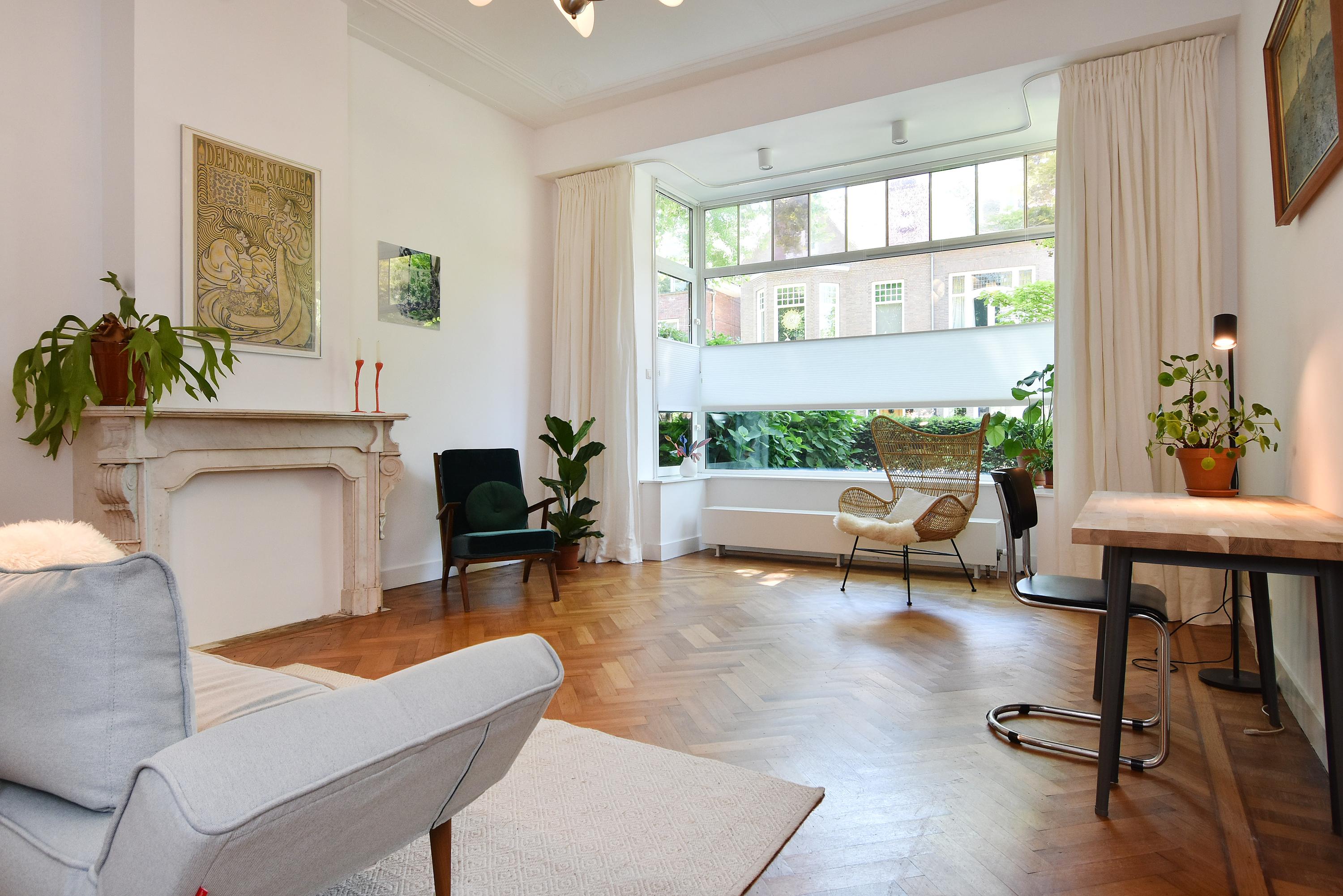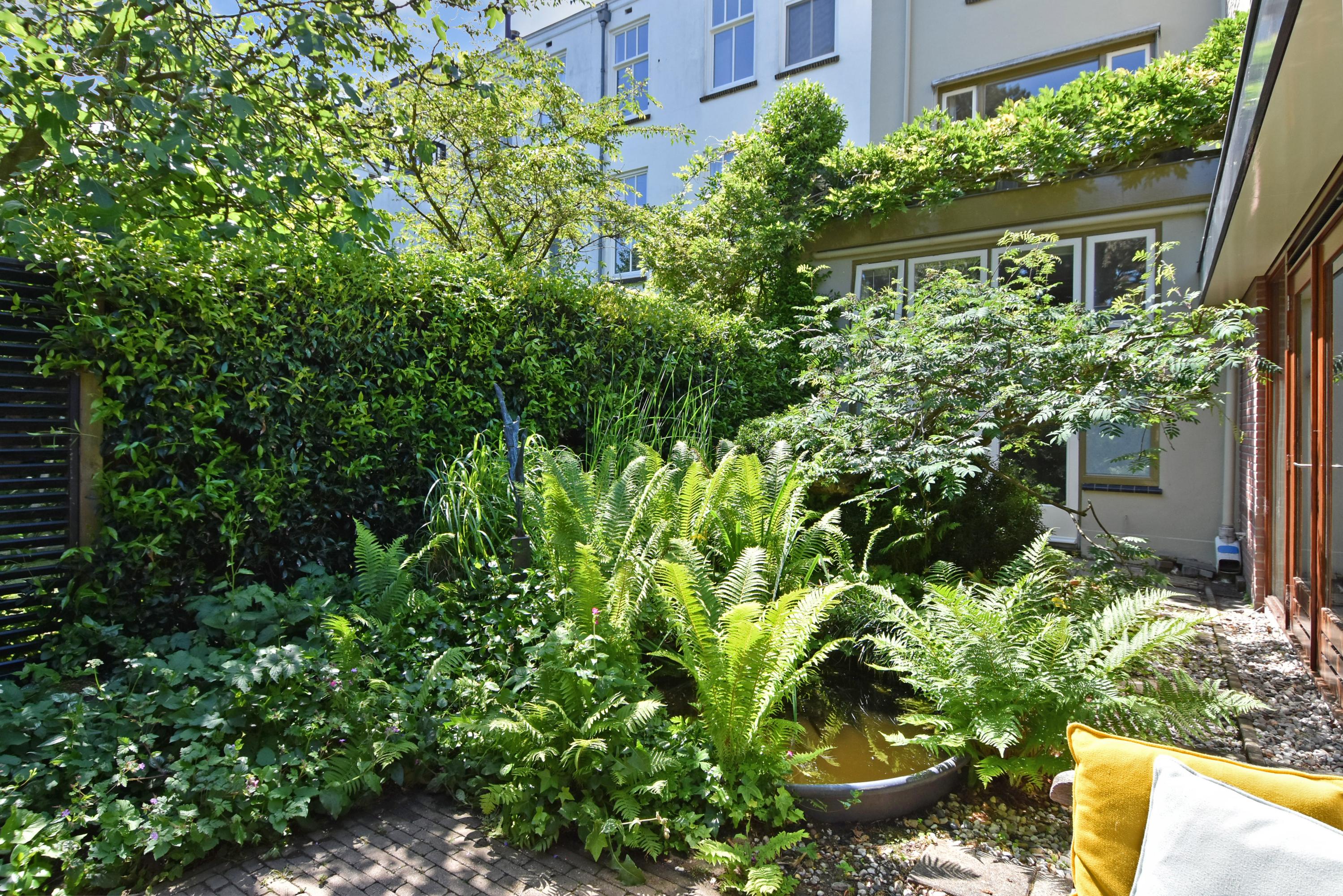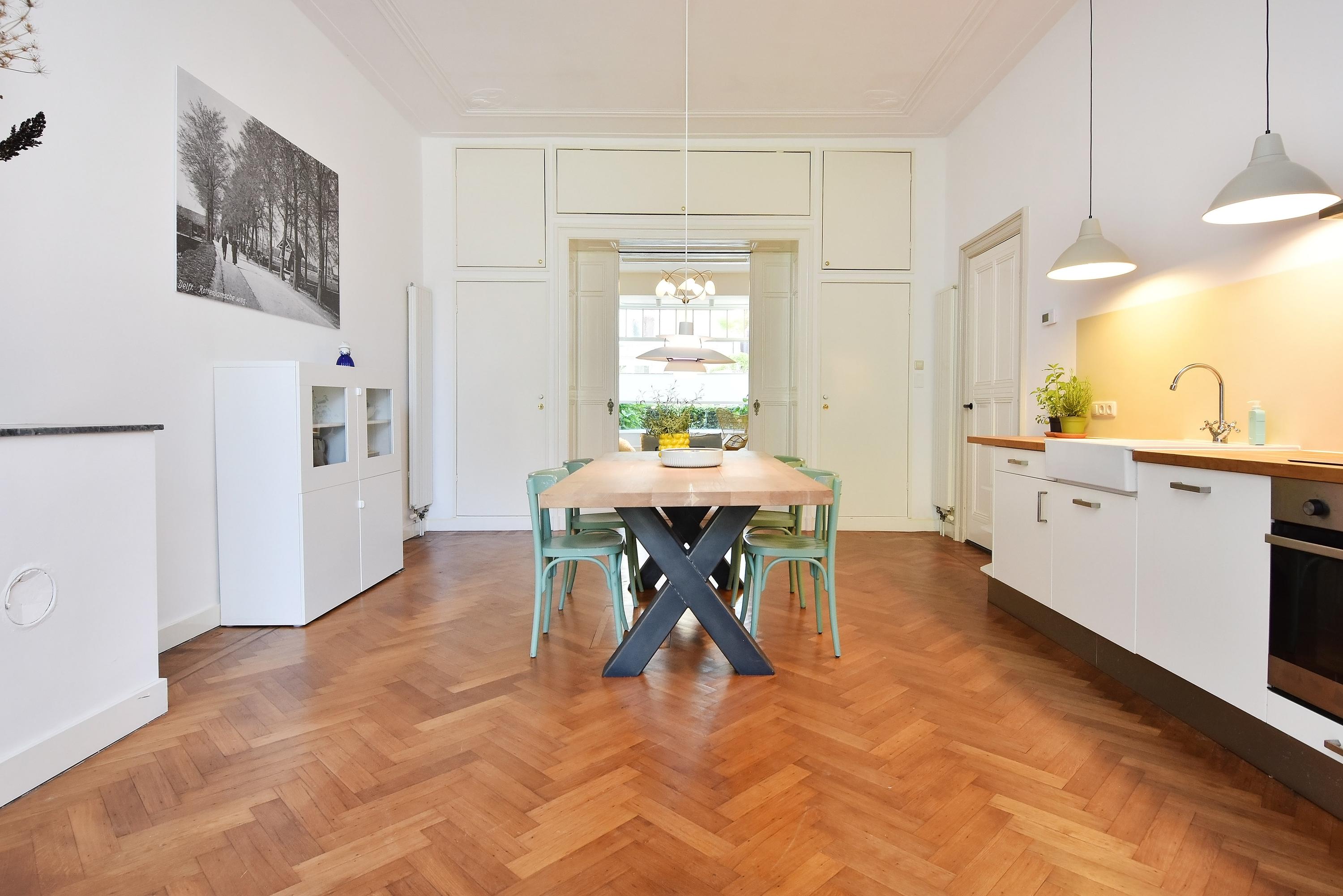 A modern extension forms a remarkable combination with the historic house. Here you will find a fully equipped and spacious kitchen, featuring a large block with stainless steel countertop, drawer units, excellent workspace, and many (designer) built-in appliances. Large windows provide unique views of the beautifully landscaped, lush, and sunny garden. Adjoining is a generous dining and music room, which also opens onto the back garden via French doors. This dining room also connects to the large garage at the rear, which benefits from daylight and can also be accessed via the side street.