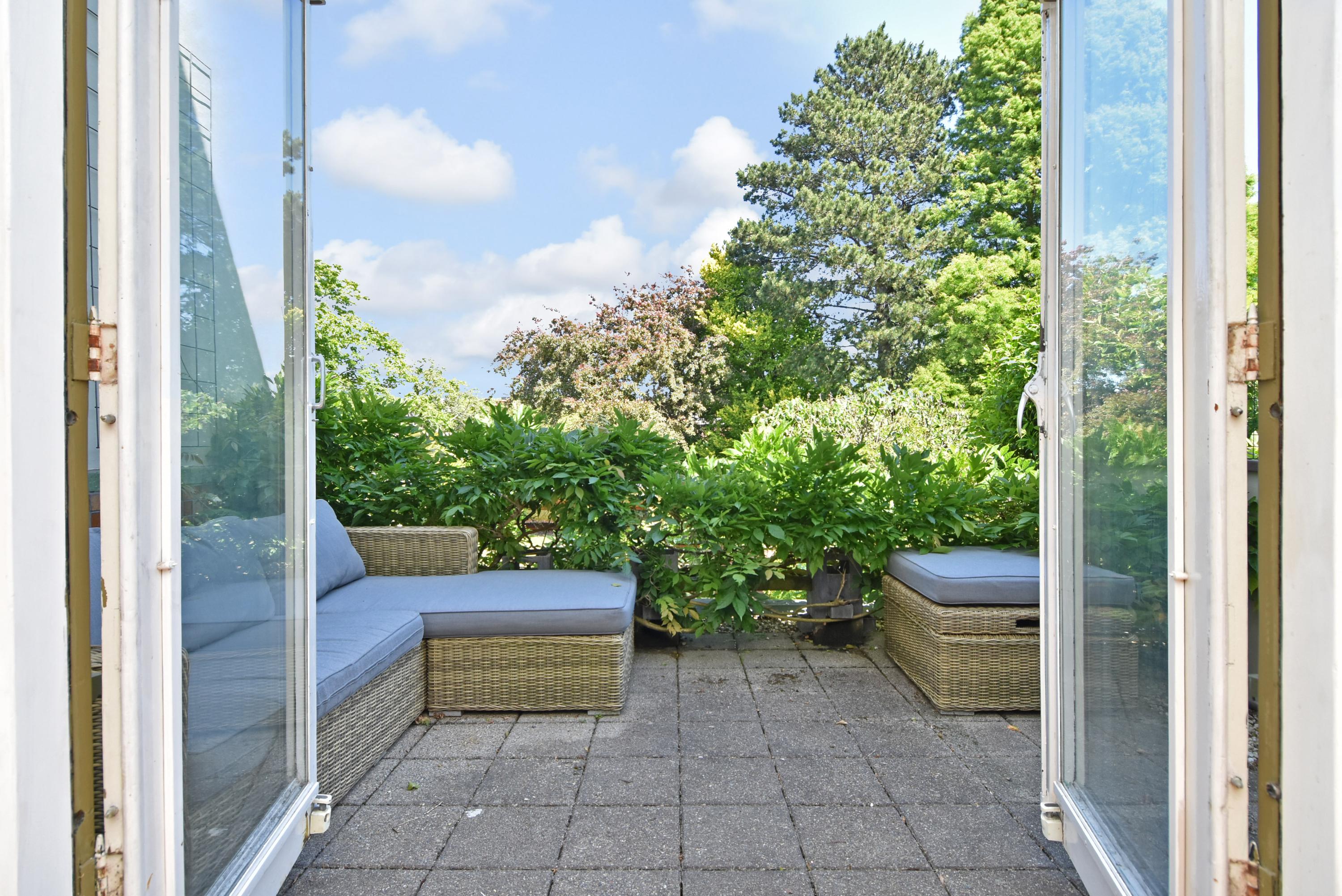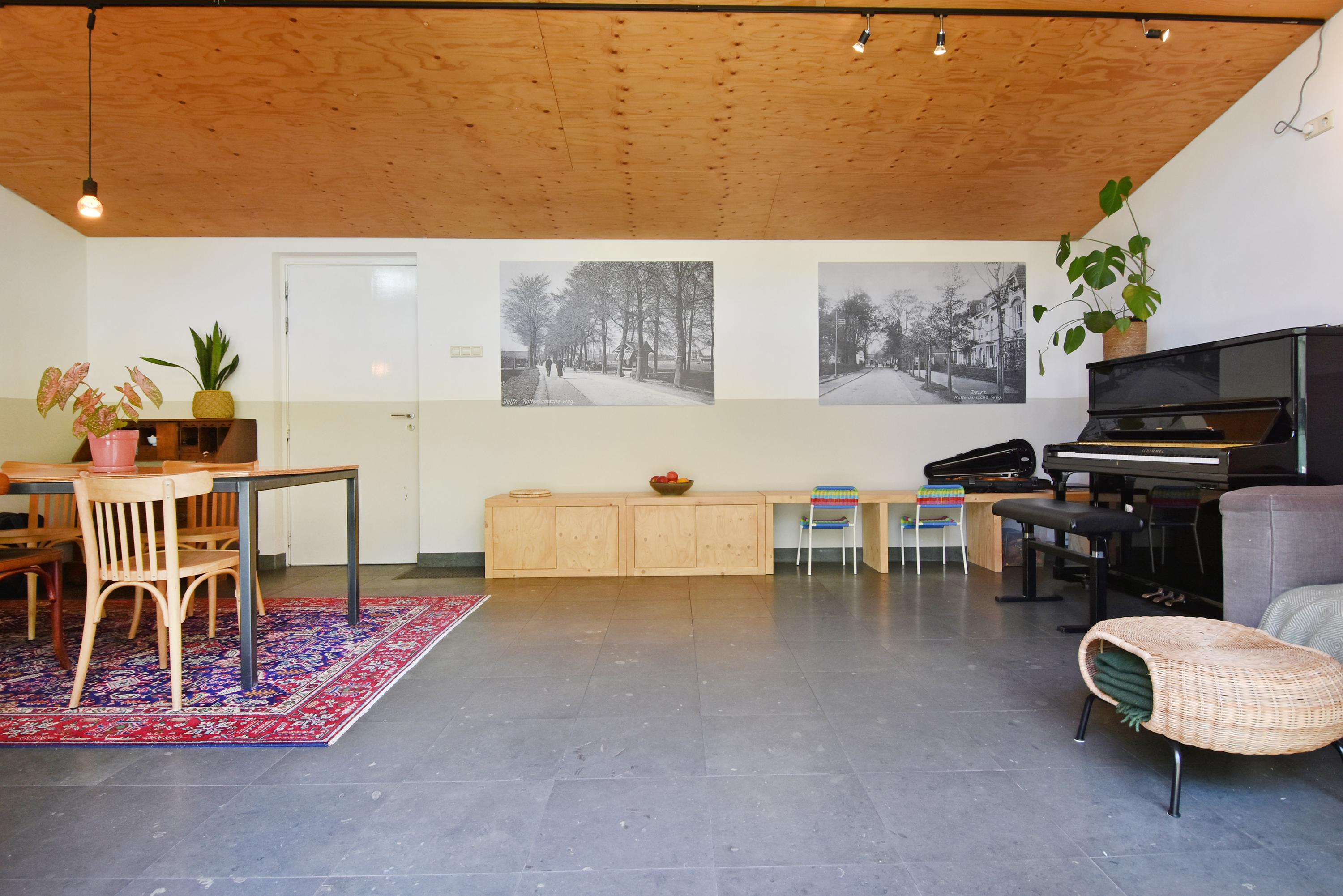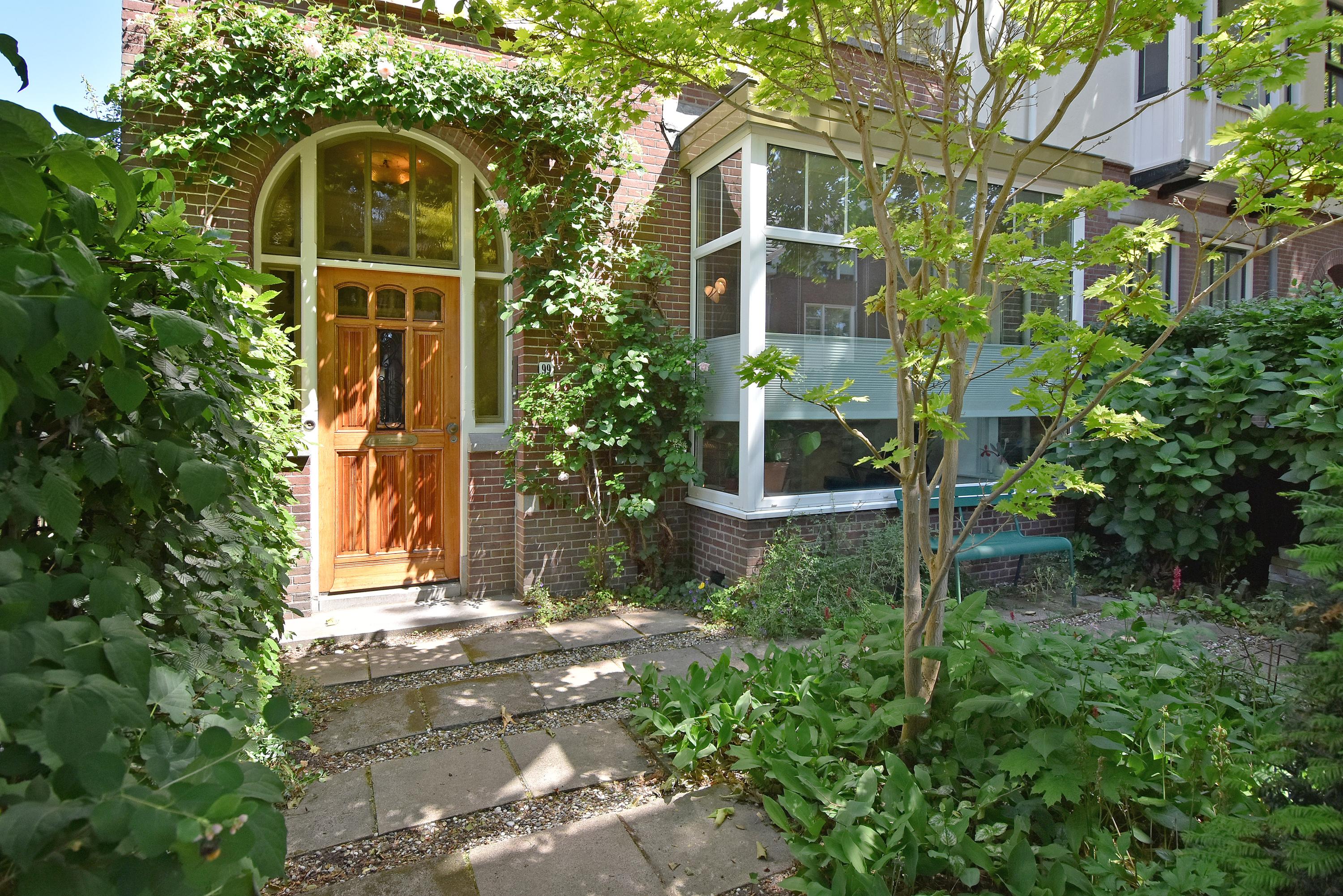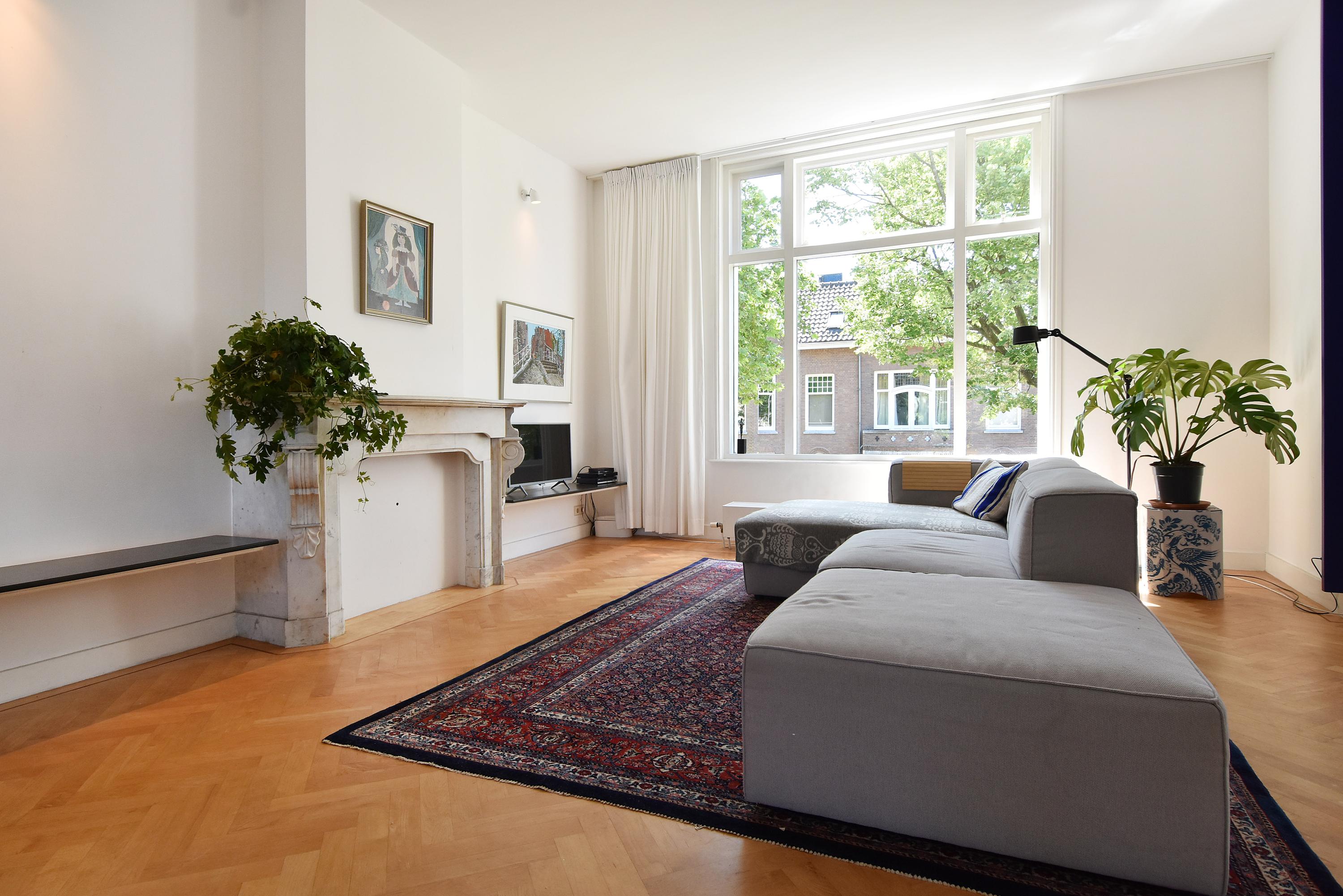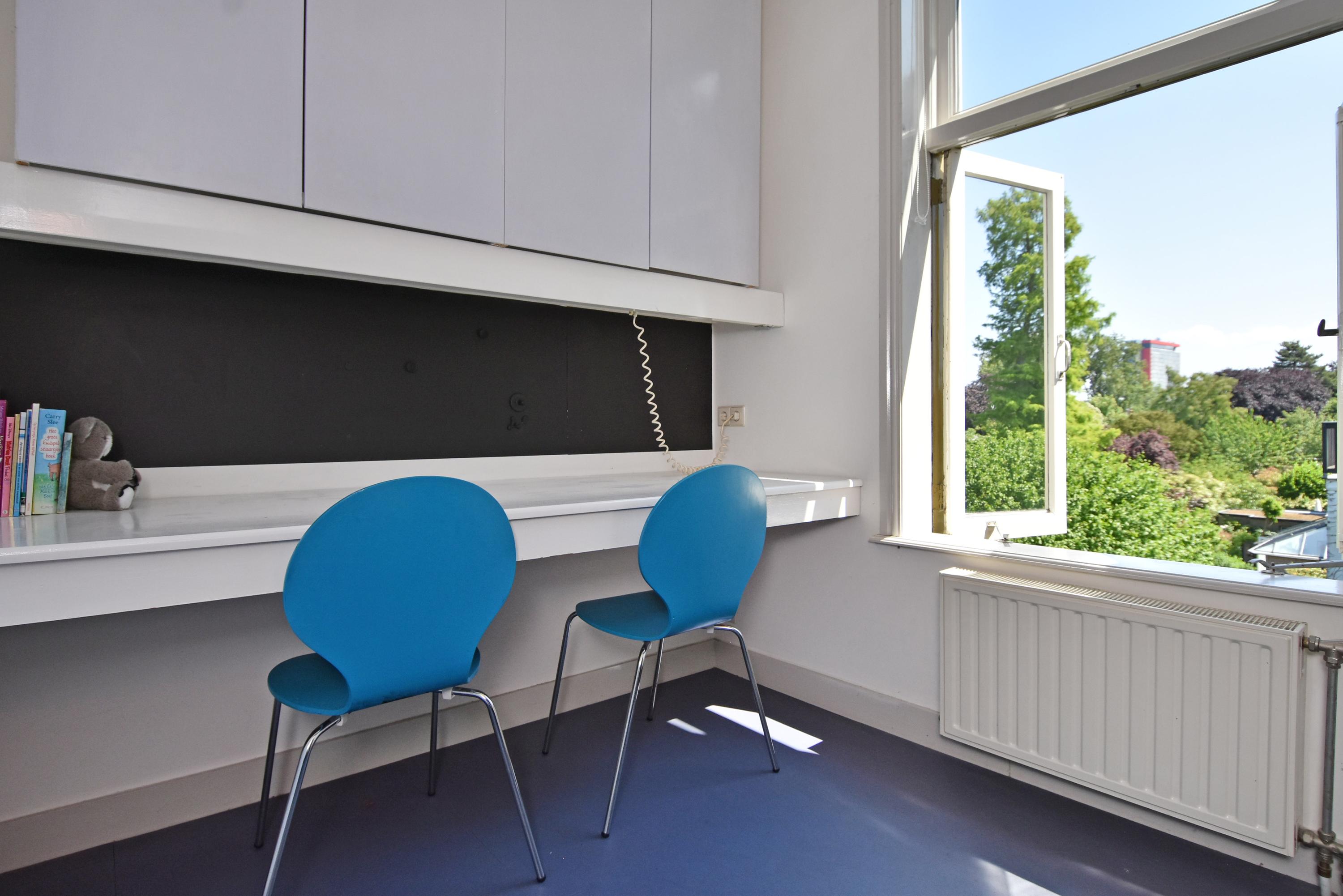 A modern extension forms a remarkable combination with the historic house. Here you will find a fully equipped and spacious kitchen, featuring a large block with stainless steel countertop, drawer units, excellent workspace, and many (designer) built-in appliances. Large windows provide unique views of the beautifully landscaped, lush, and sunny garden. Adjoining is a generous dining and music room, which also opens onto the back garden via French doors. This dining room also connects to the large garage at the rear, which benefits from daylight and can also be accessed via the side street.